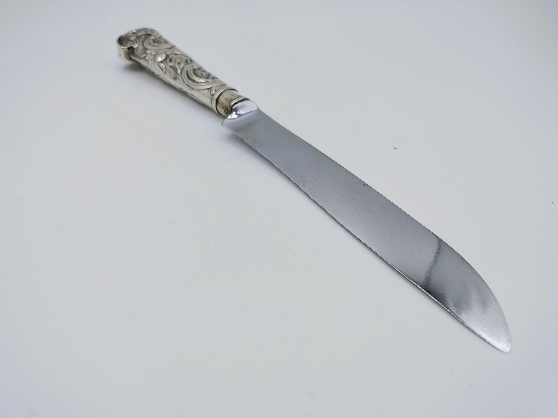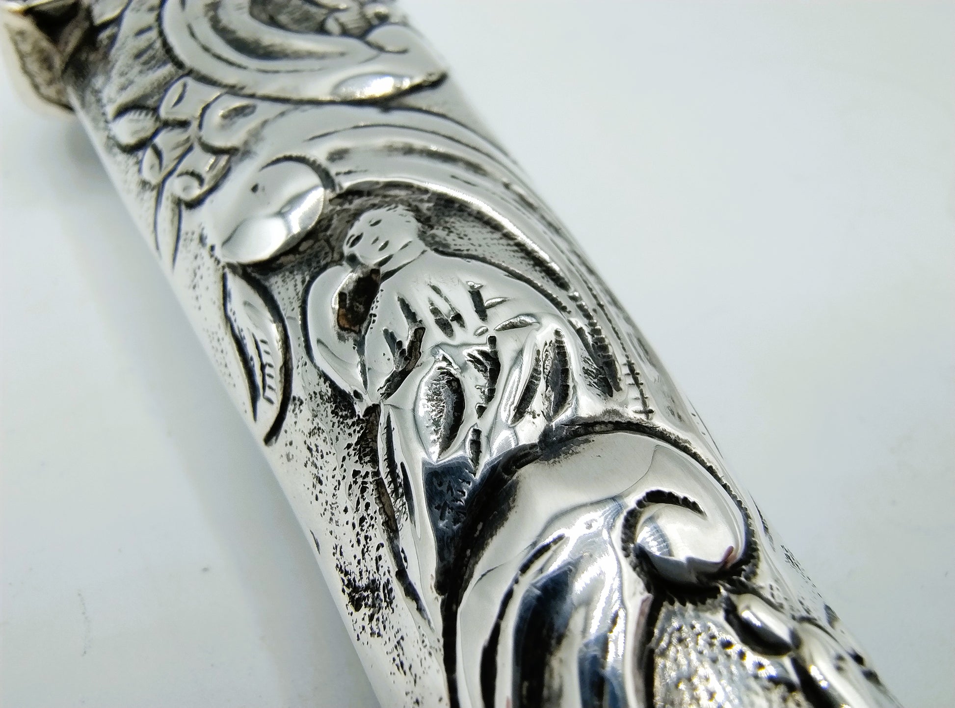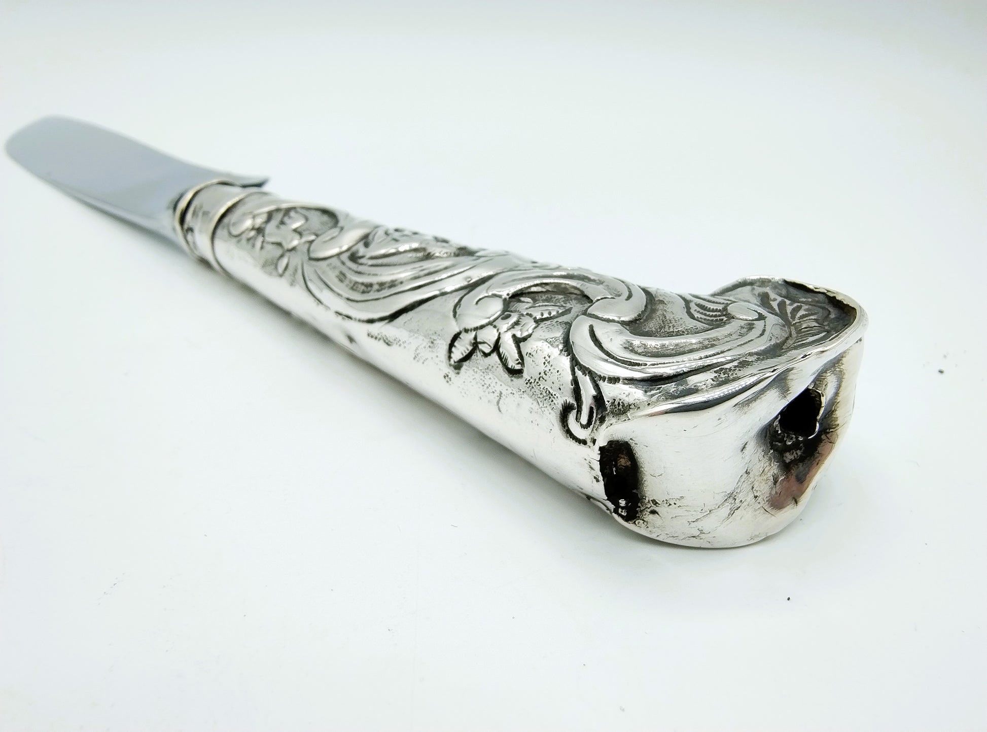 Fries zilveren mes uit het einde van de 18e eeuw. Het mes is fraai gedreven met twee vrouwfiguren en twee vogelfiguren met daaromheen krulmotieven.