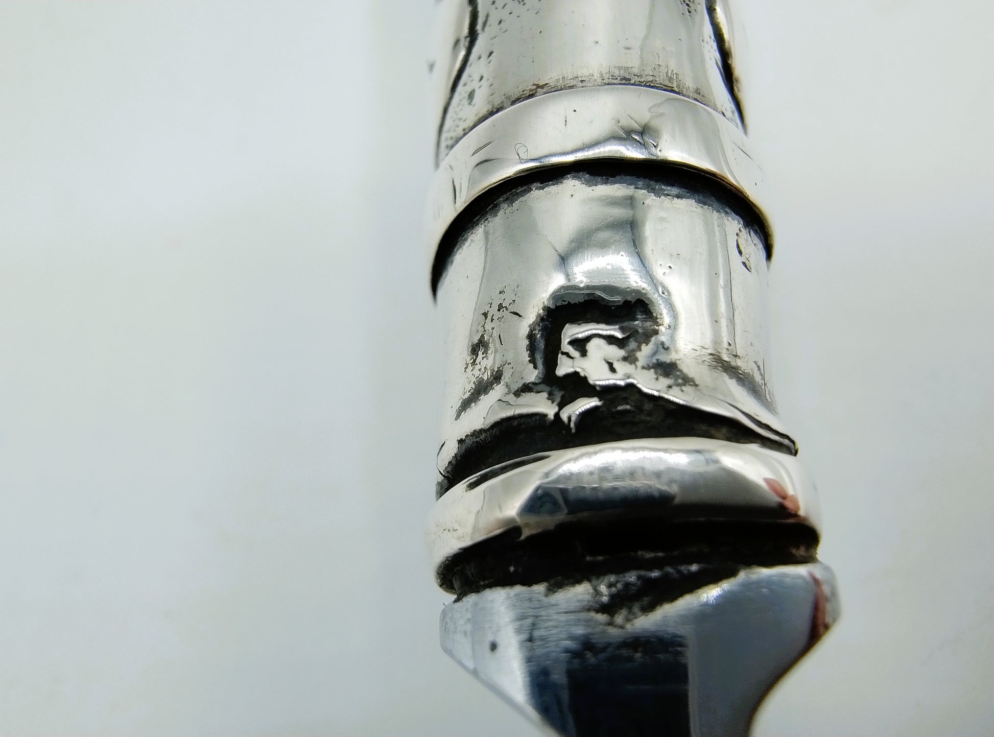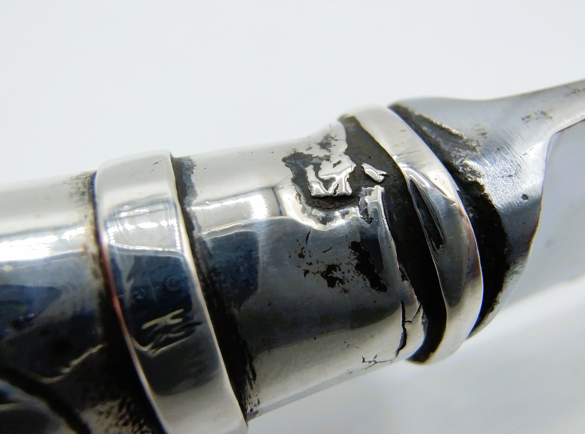 Het mes heeft als bekroning een ruiter te paard gehad. Deze ontbreekt helaas. Het stalen lemmet is later vervangen en daardoor is het mes nog prima hedendaags te gebruiken.