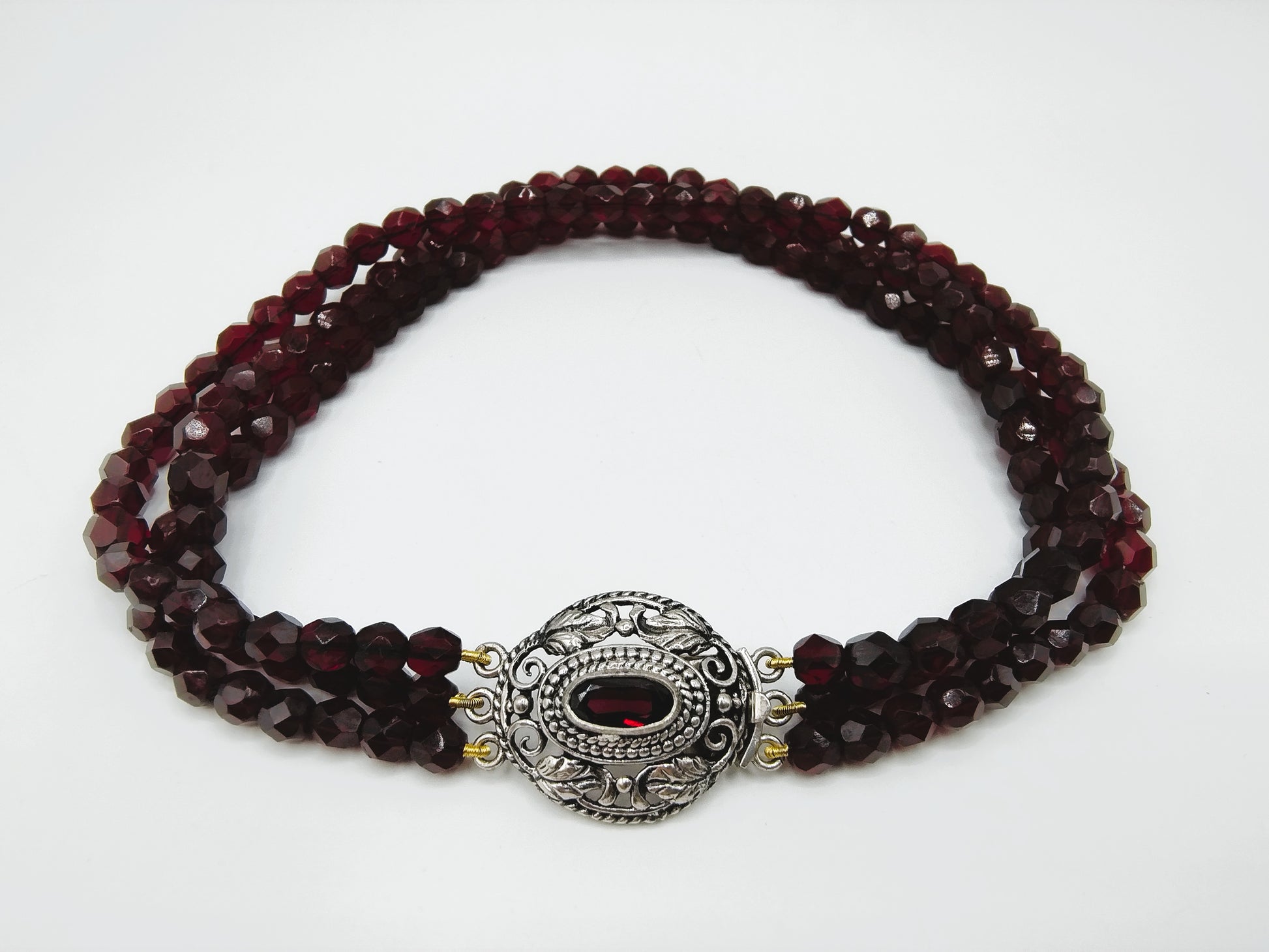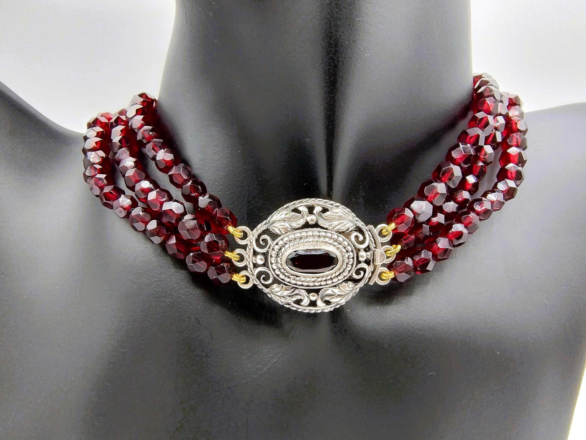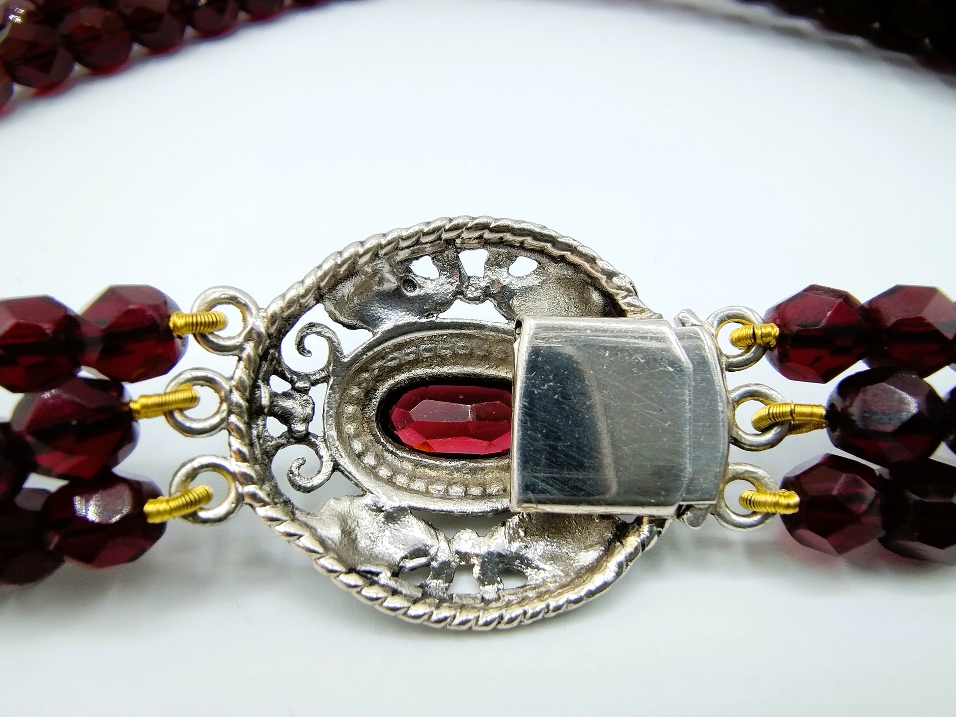 Glasgranaten ketting met strengen verbonden aan een vintage zilveren slot waarin ook een granaat verwerkt is.