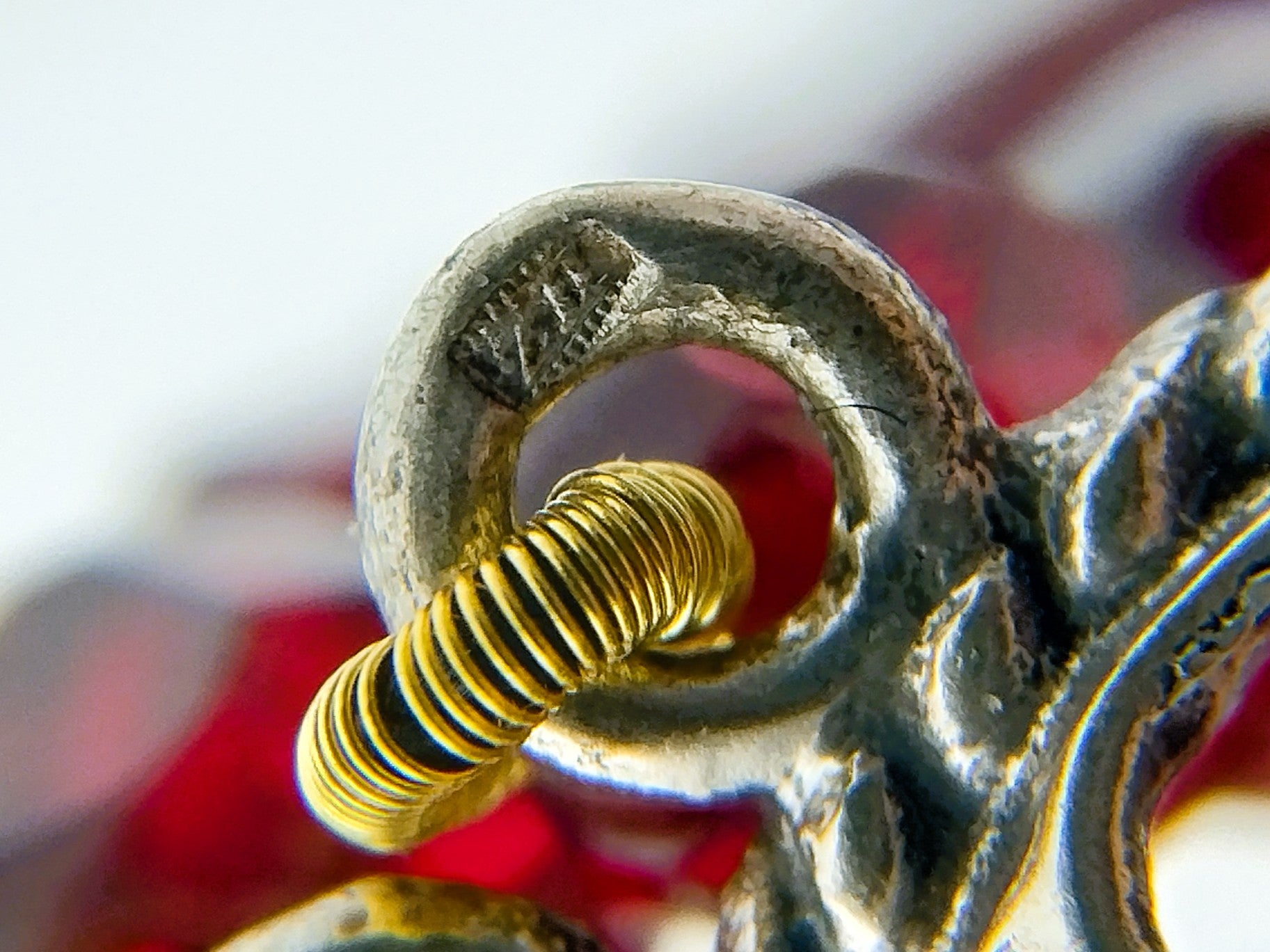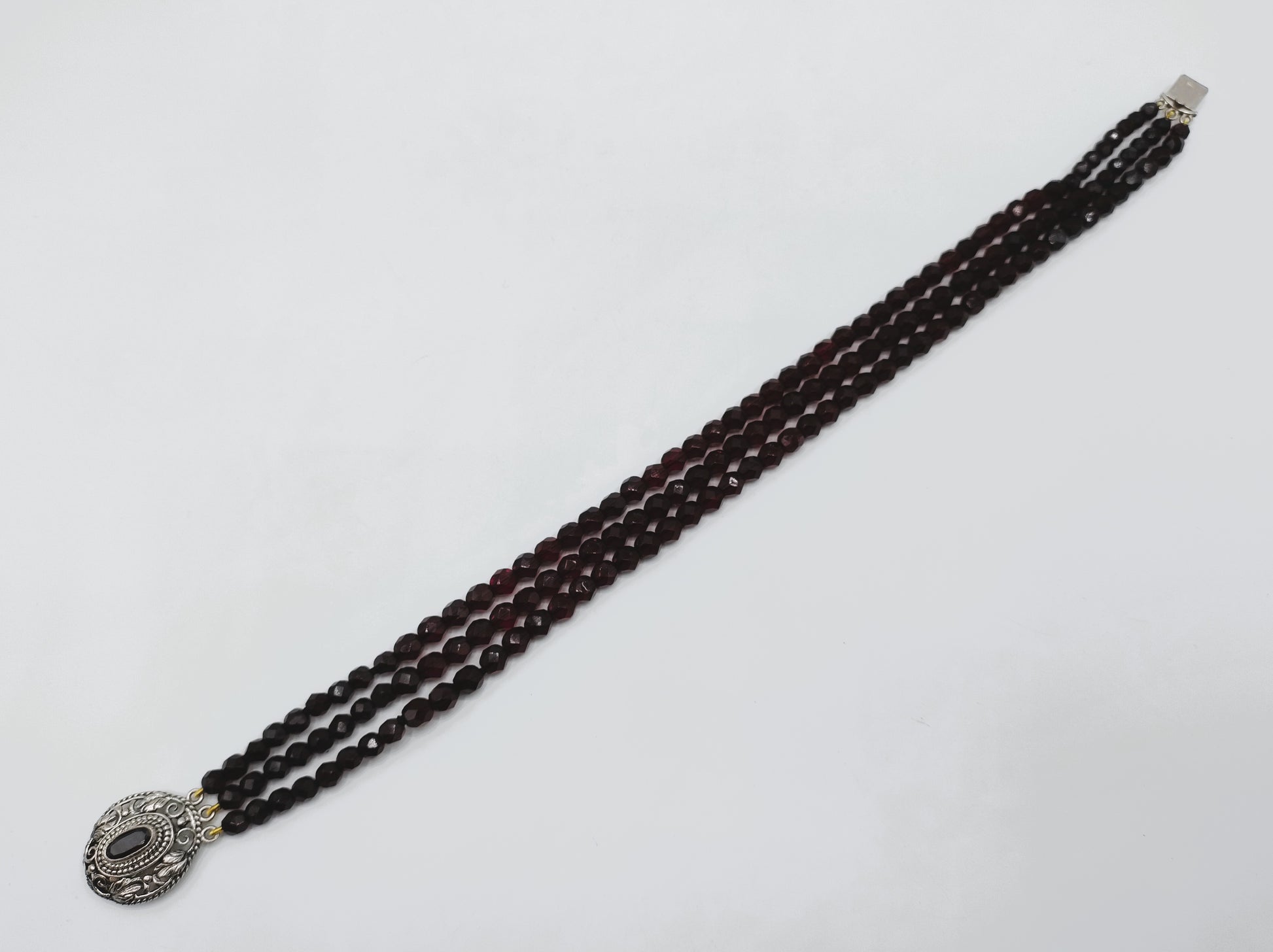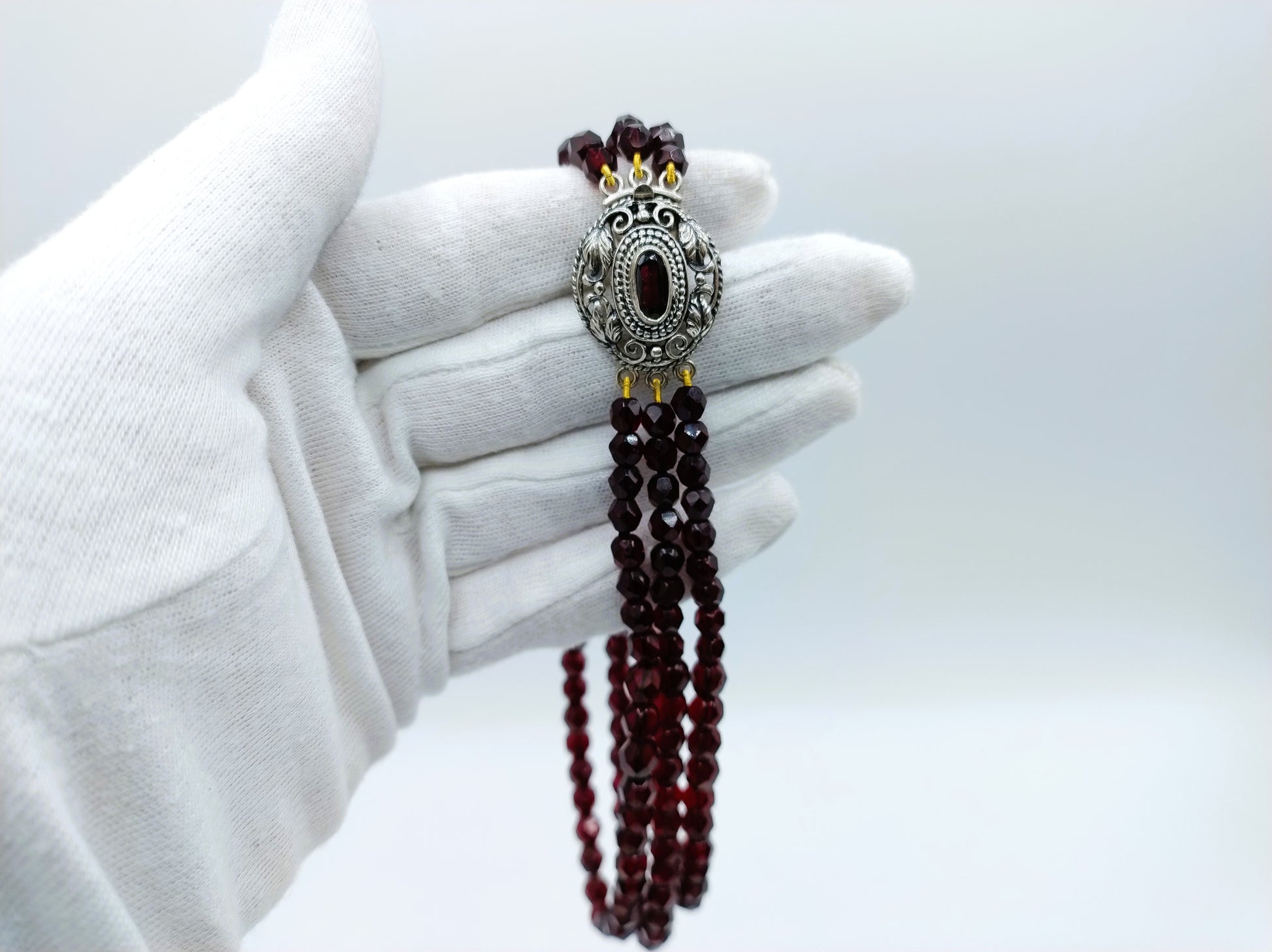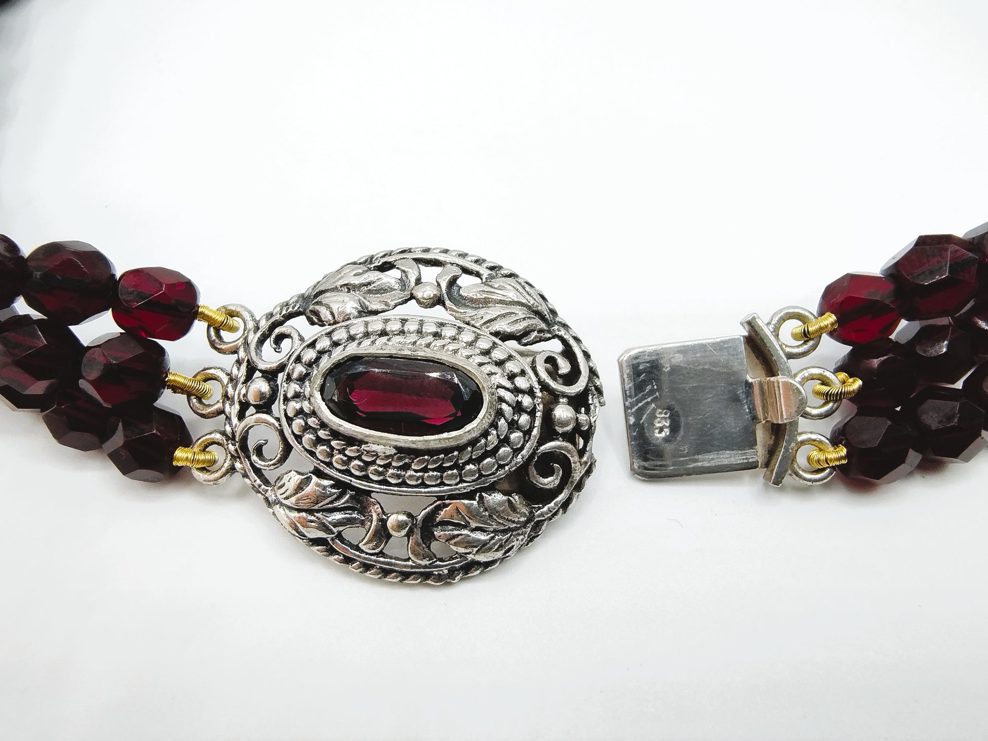 Glasgranaten ketting met strengen verbonden aan een vintage zilveren slot waarin ook een granaat verwerkt is.