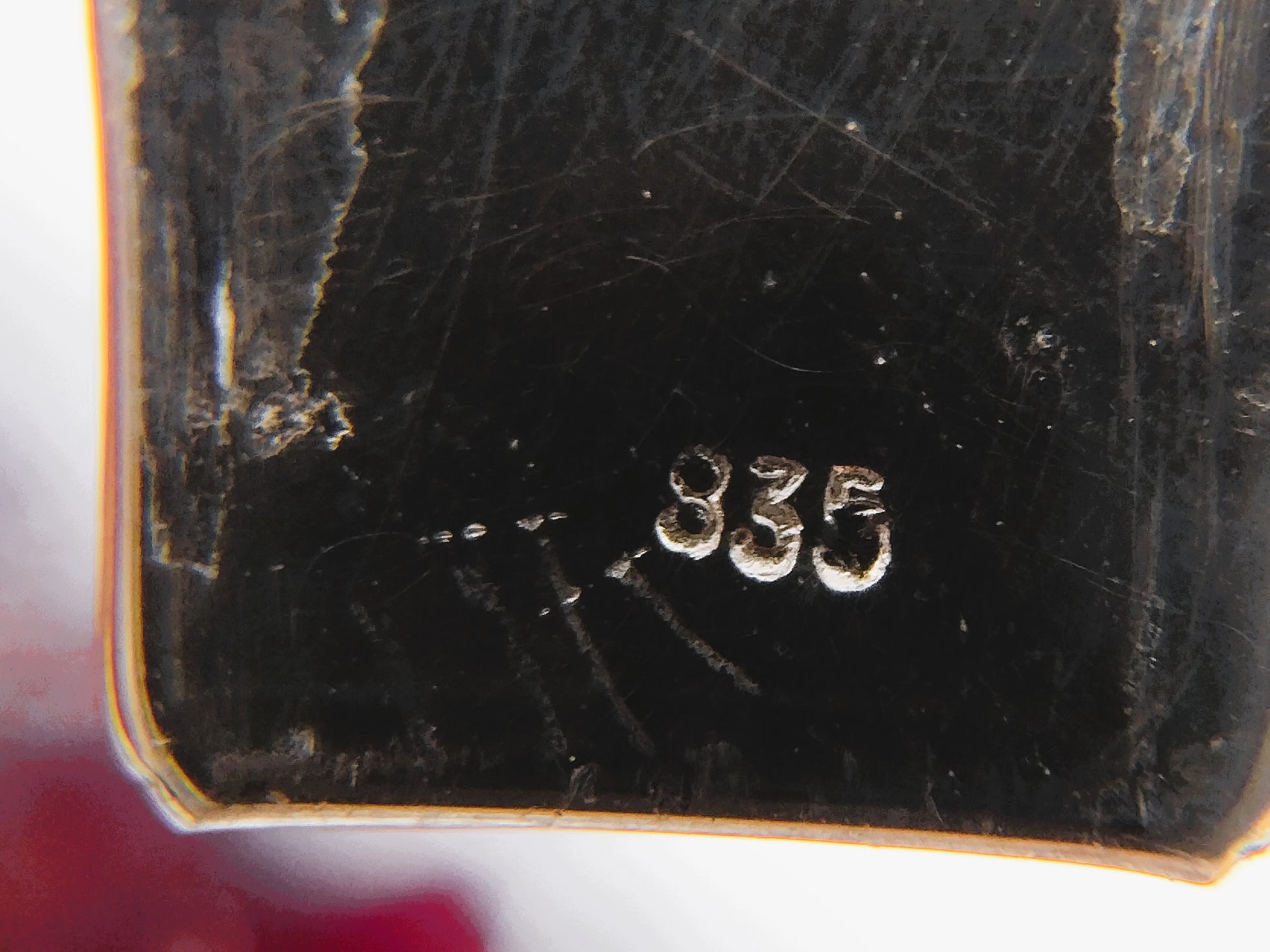 Het zilveren slot is gekeurd met 835 voor tweede gehalte zilver en een moeilijk leesbaar meesterkeur.