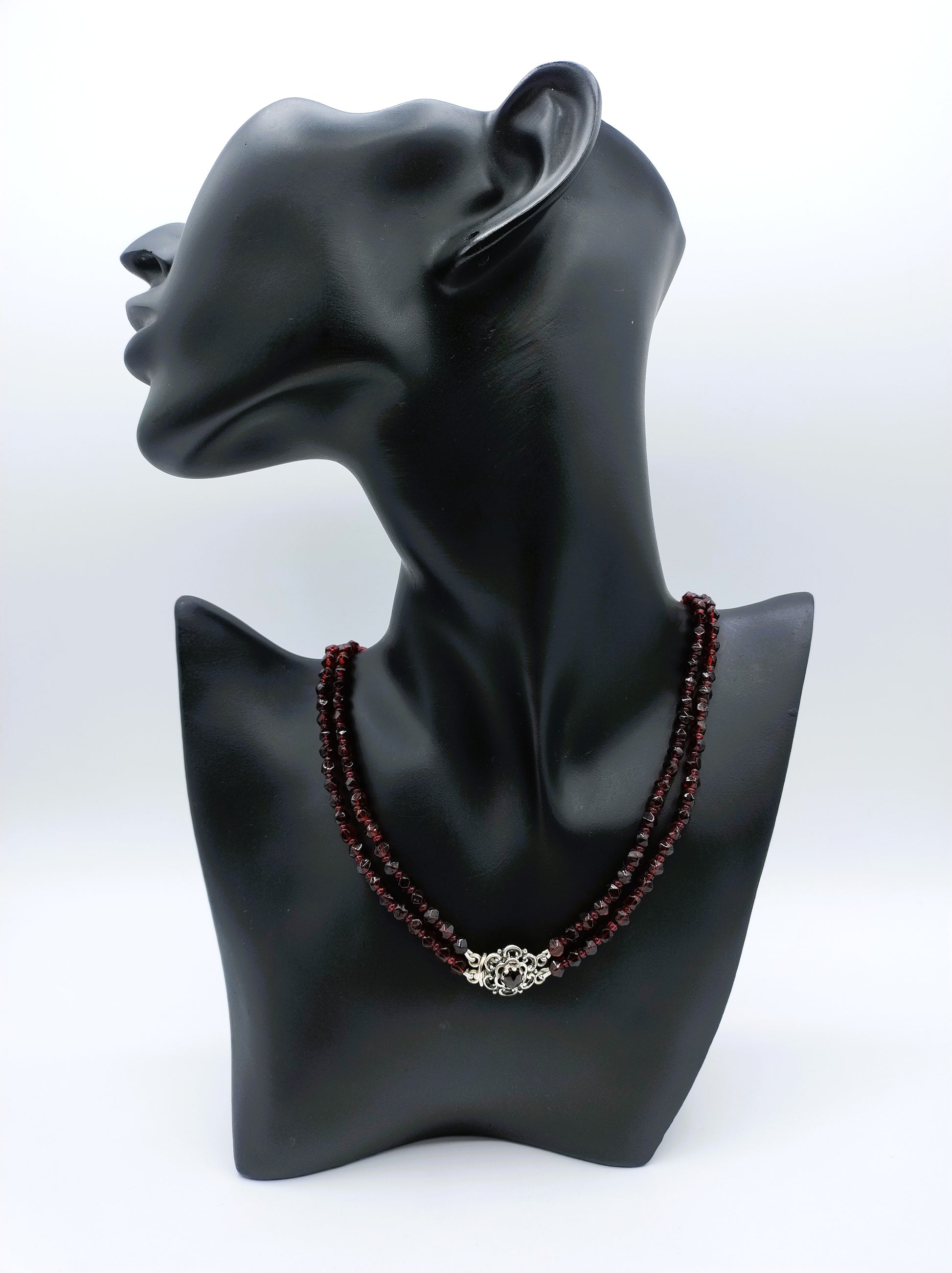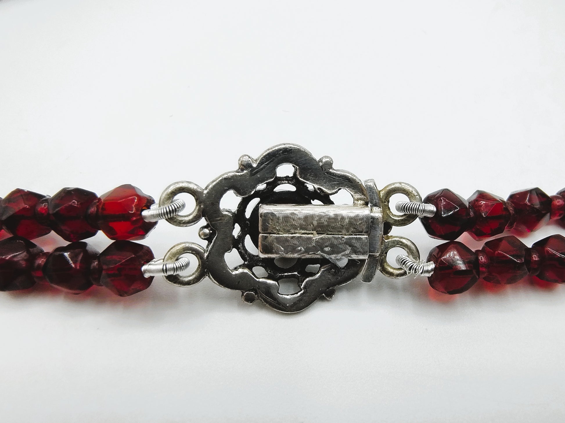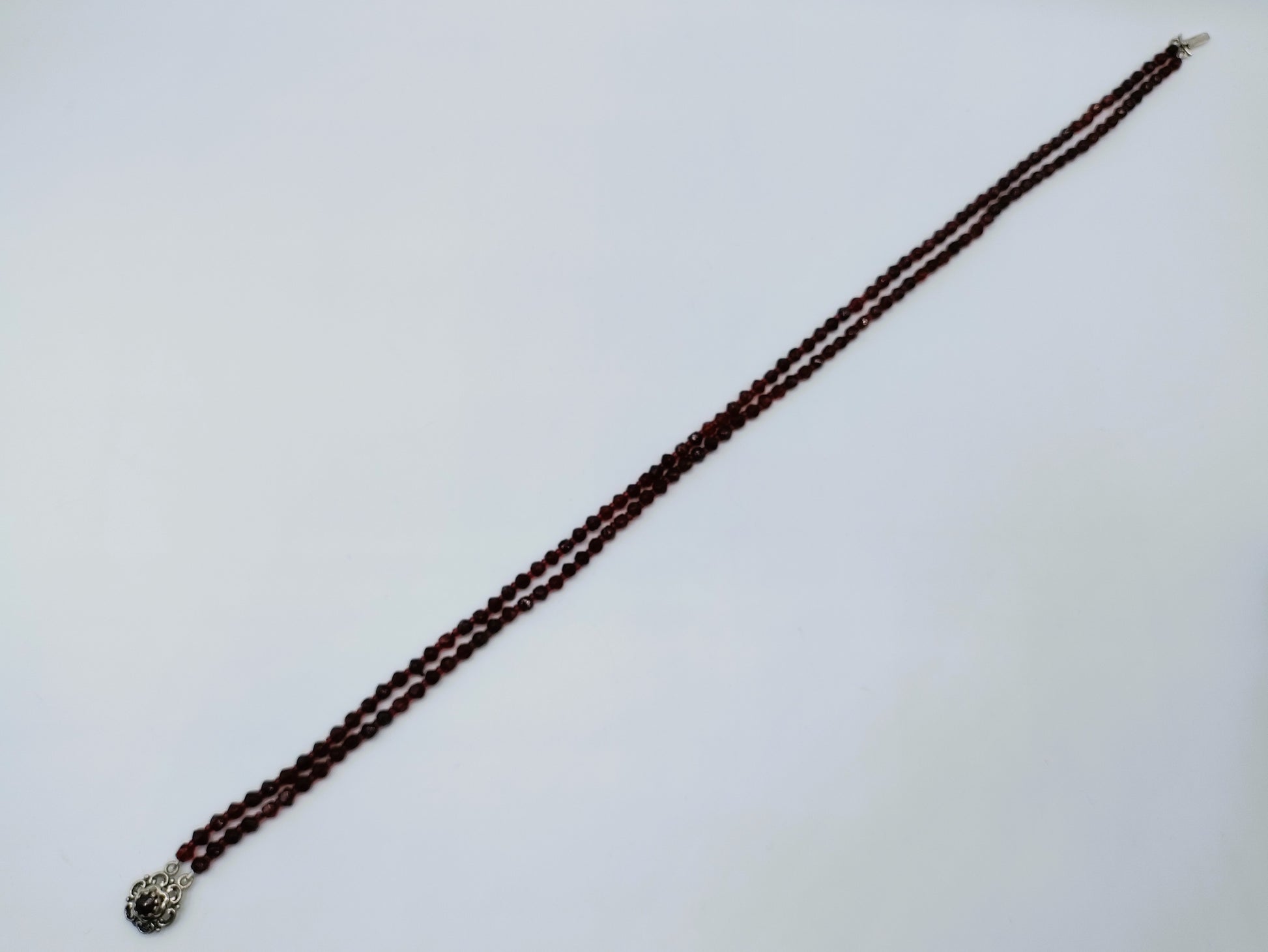 Ketting met 2 strengen glasgranaten verbonden aan een vintage zilveren slot waarin ook een granaat verwerkt is.