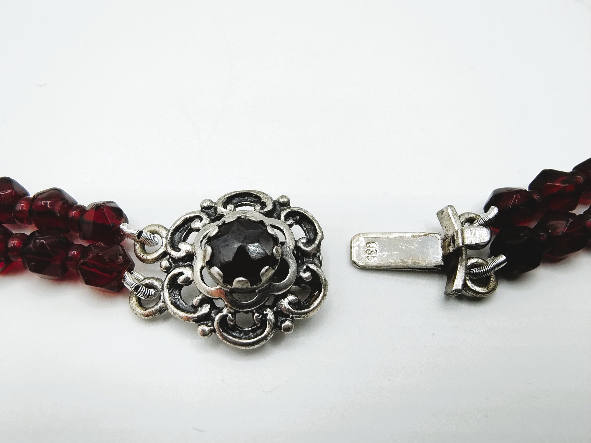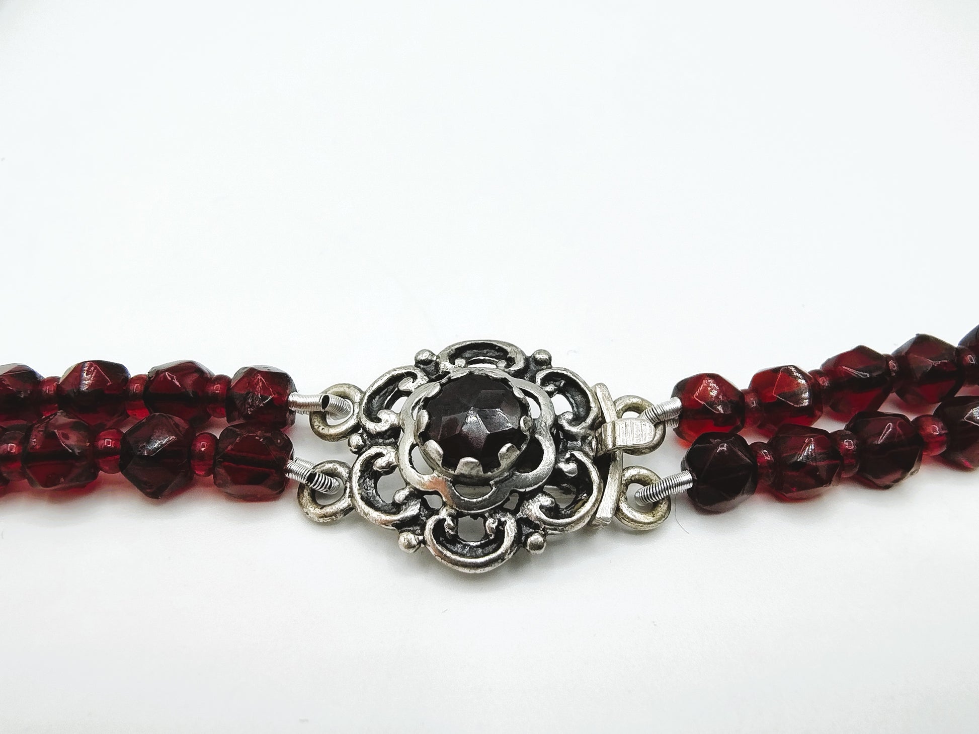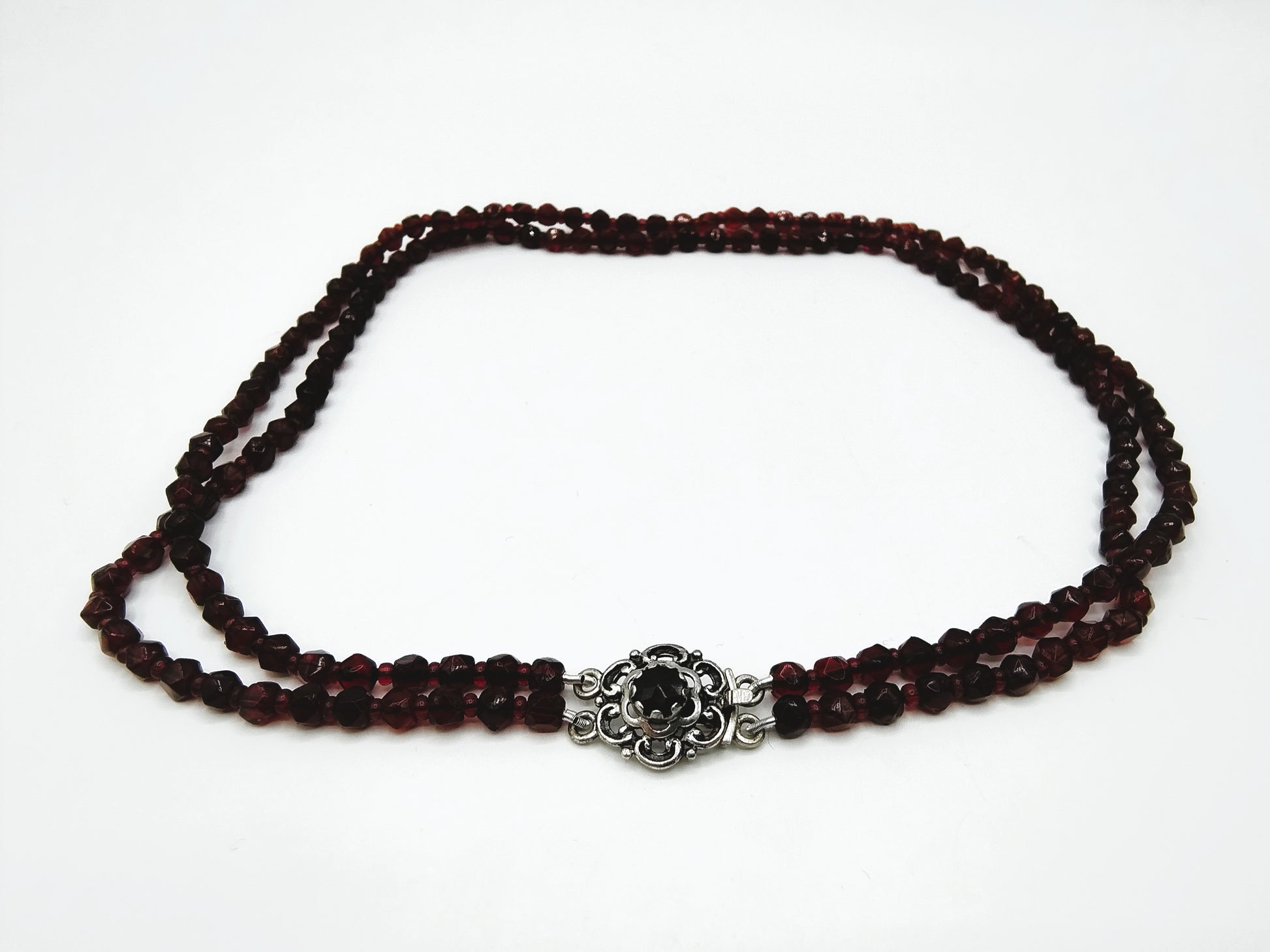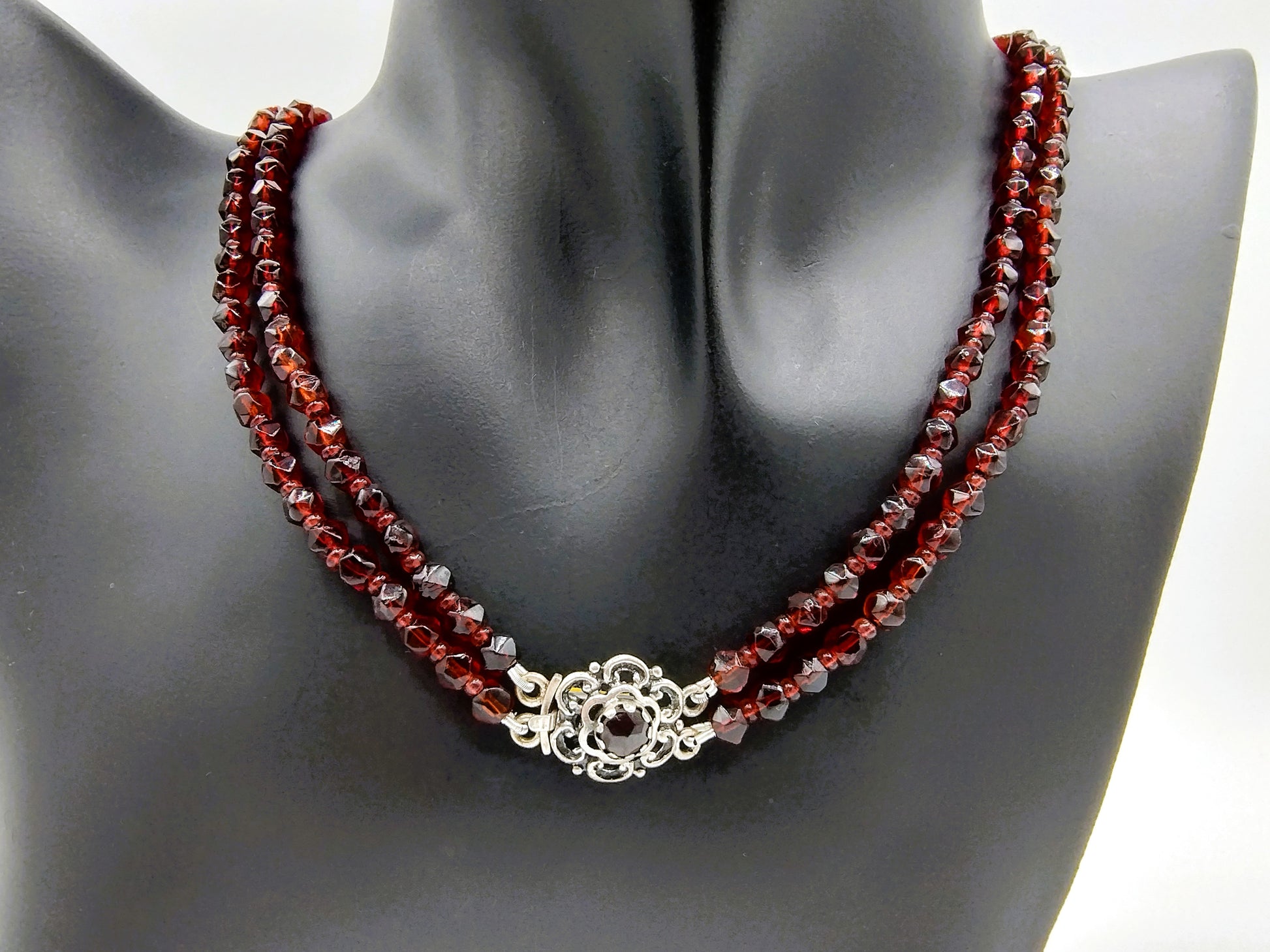 Ketting met 2 strengen glasgranaten verbonden aan een vintage zilveren slot waarin ook een granaat verwerkt is.
