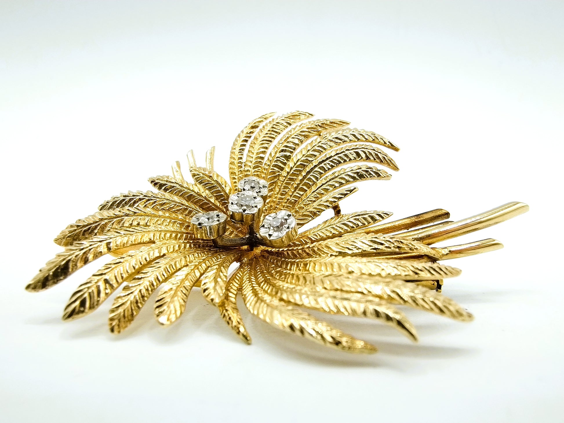 14 Karaats gouden broche, fijn uitgewerkt met bladeren en in het midden 4 diamanten in een chaton zetting.