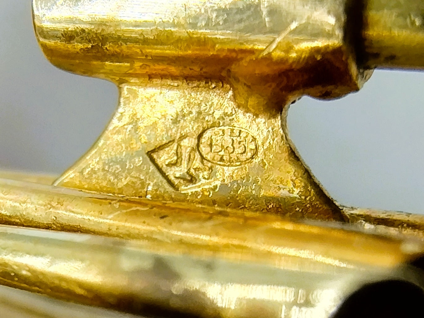 De broche is gekeurd met 585 voor 14 karaats goud. Tevens is het meesterkeur I hamer F / AK afgeslagen.