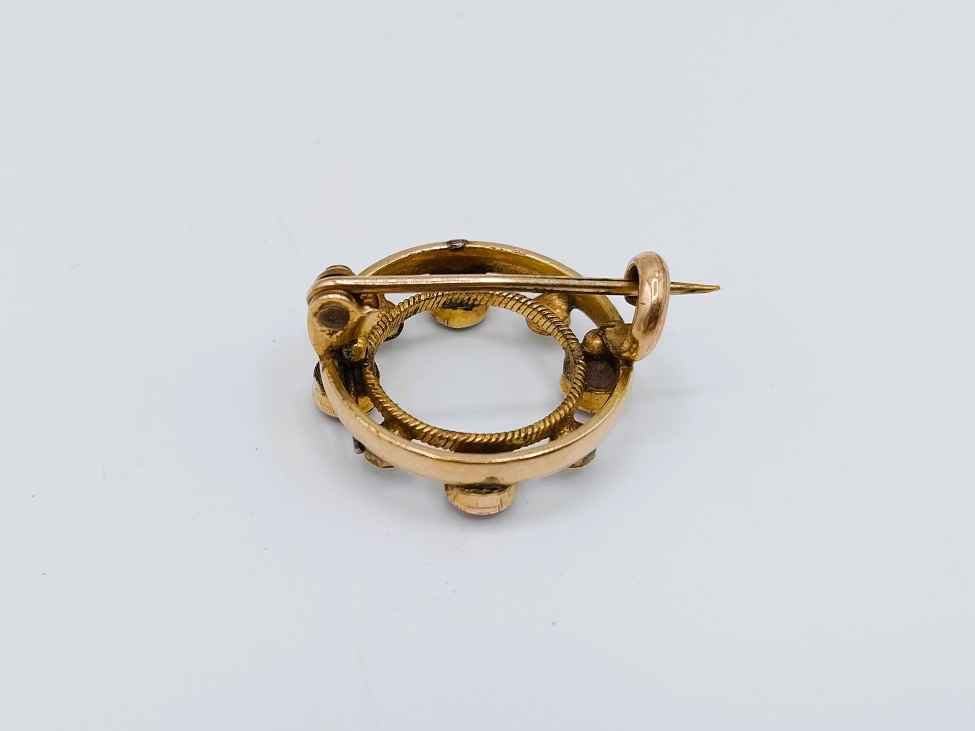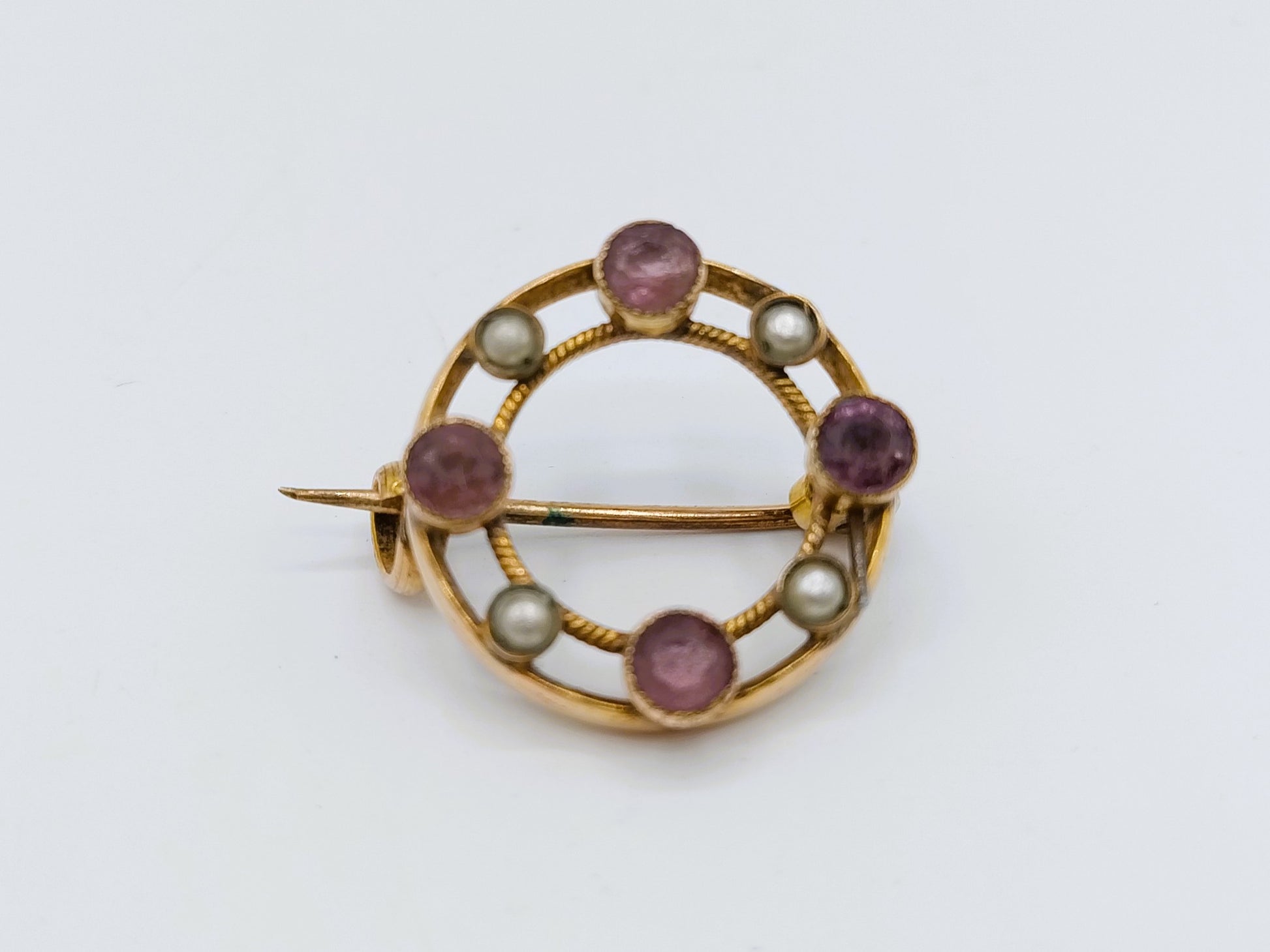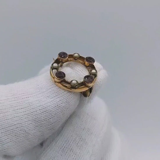 Gouden ringbroche bezet met 4 amethisten en 4 parels.