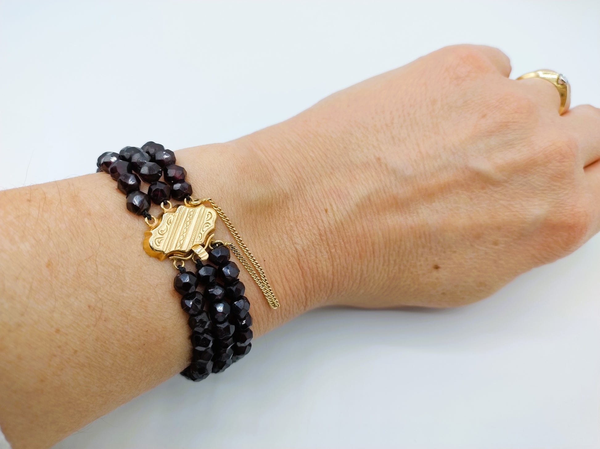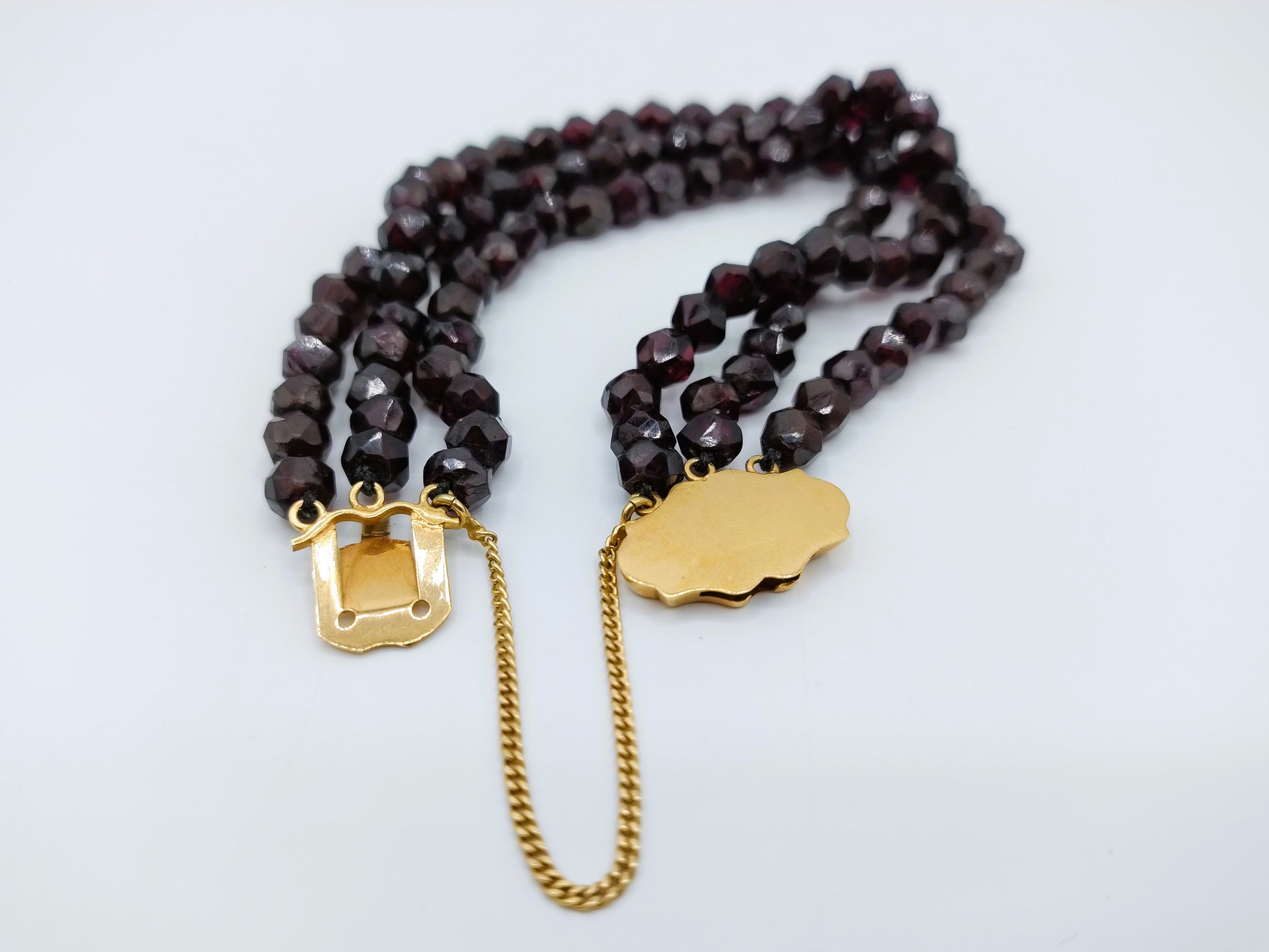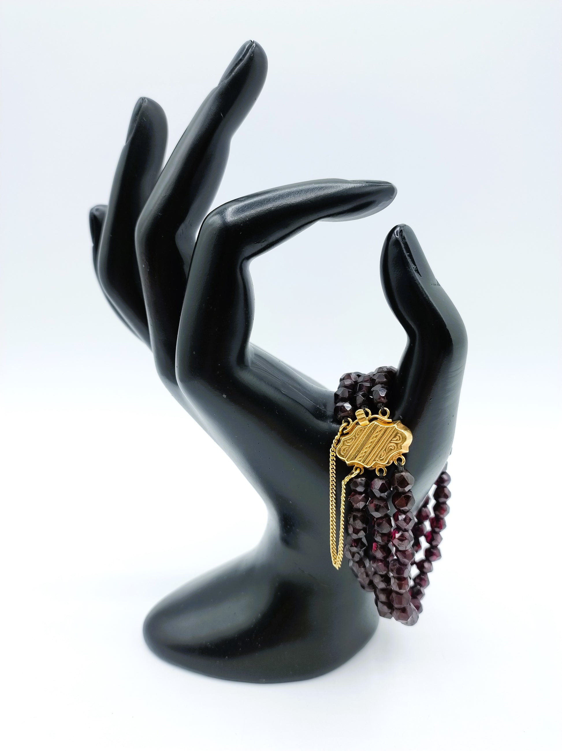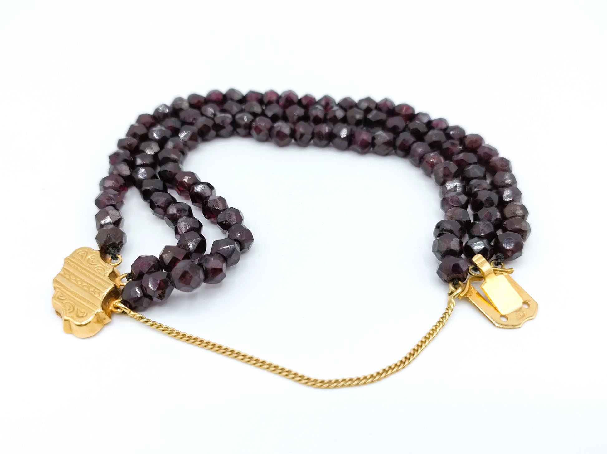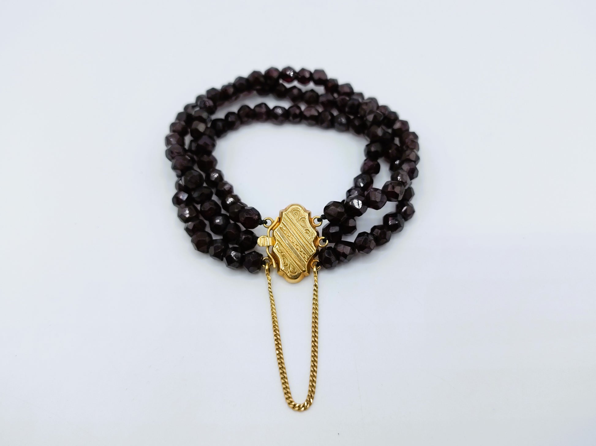 Granaten armband met gouden slot, 19 cm.