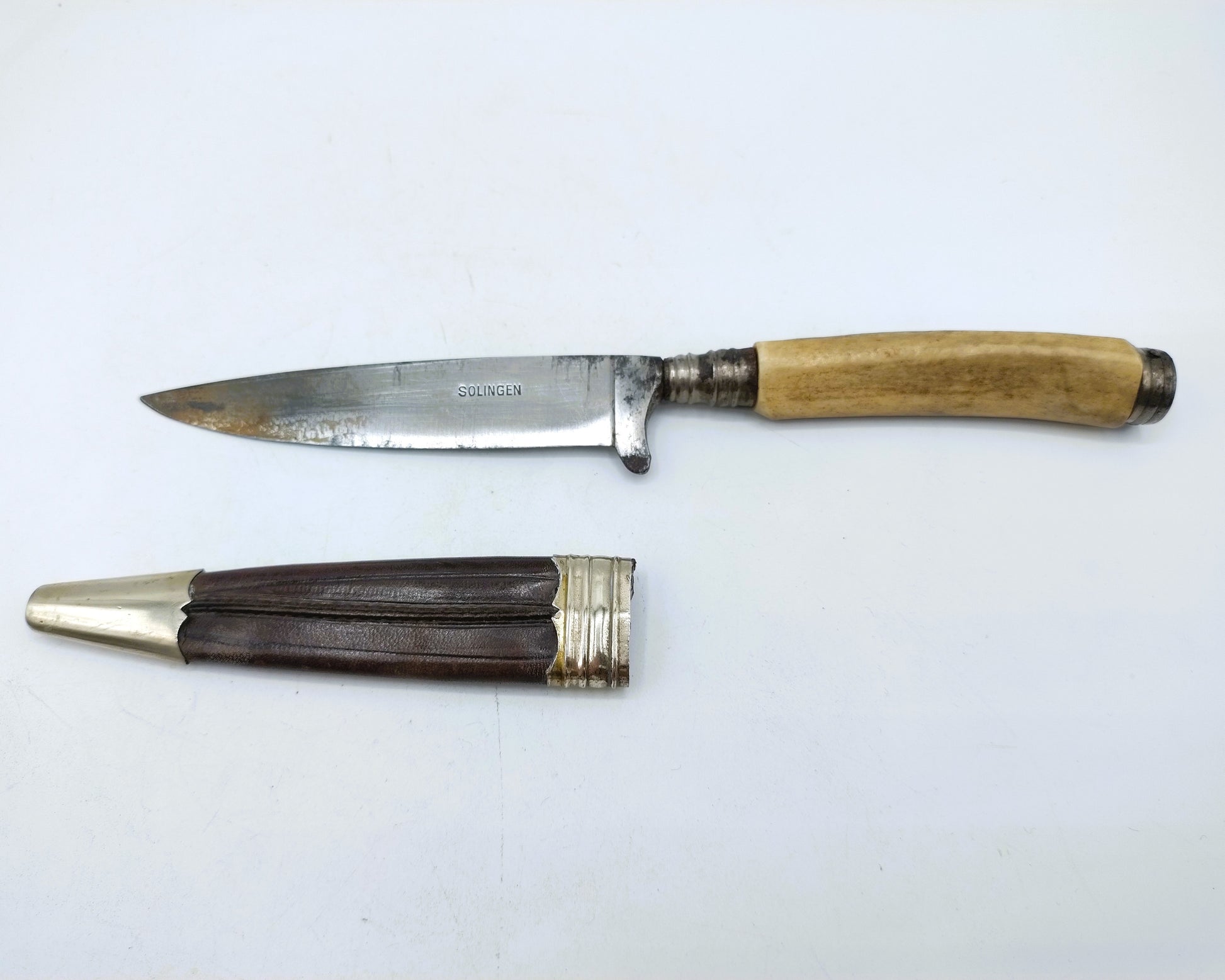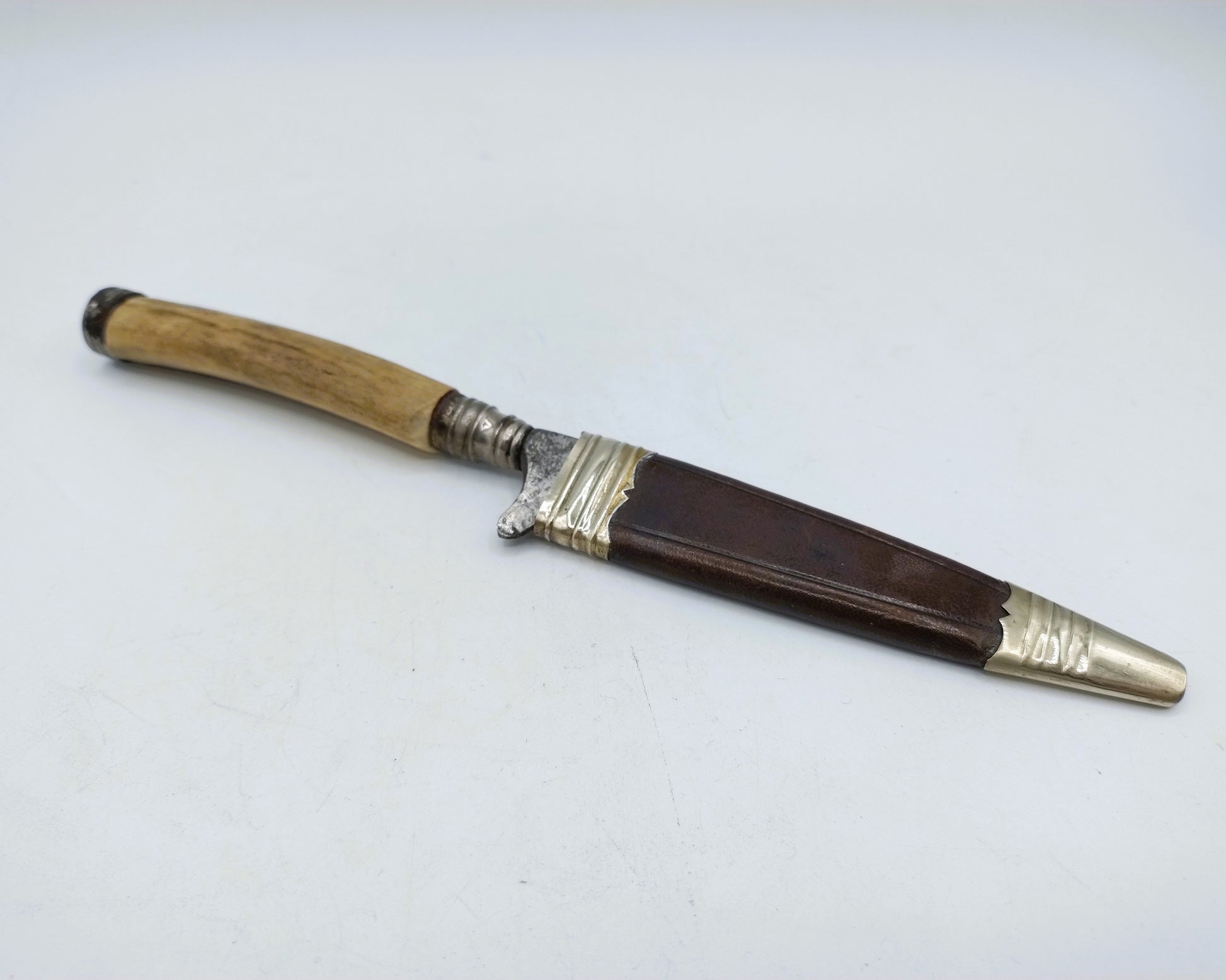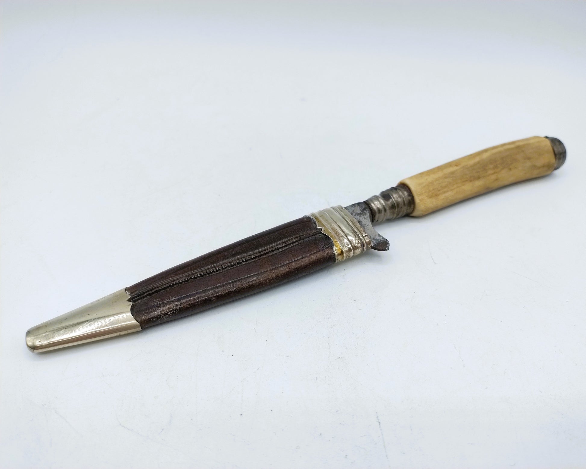 Jachtmes met hoornen greep in een leren foedraal met zilverbeslag.