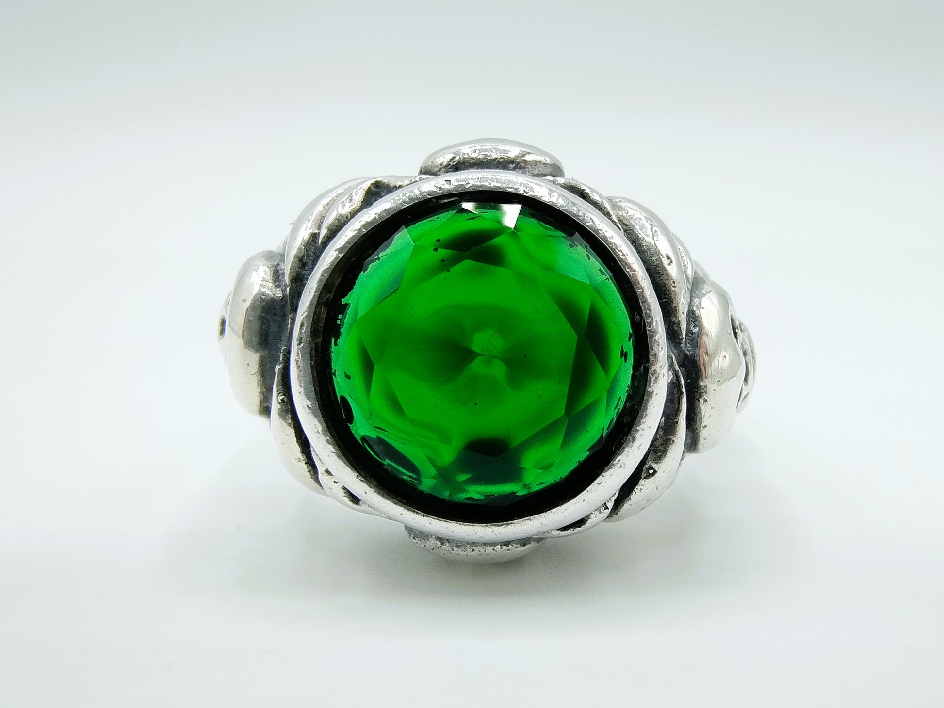 Zilveren schedel ring met groene steen. Dit is een replica van de ring die kapitein Jack Sparrow (Johnny Depp) droeg in Pirates of the caribbean: on stranger tide (2011)