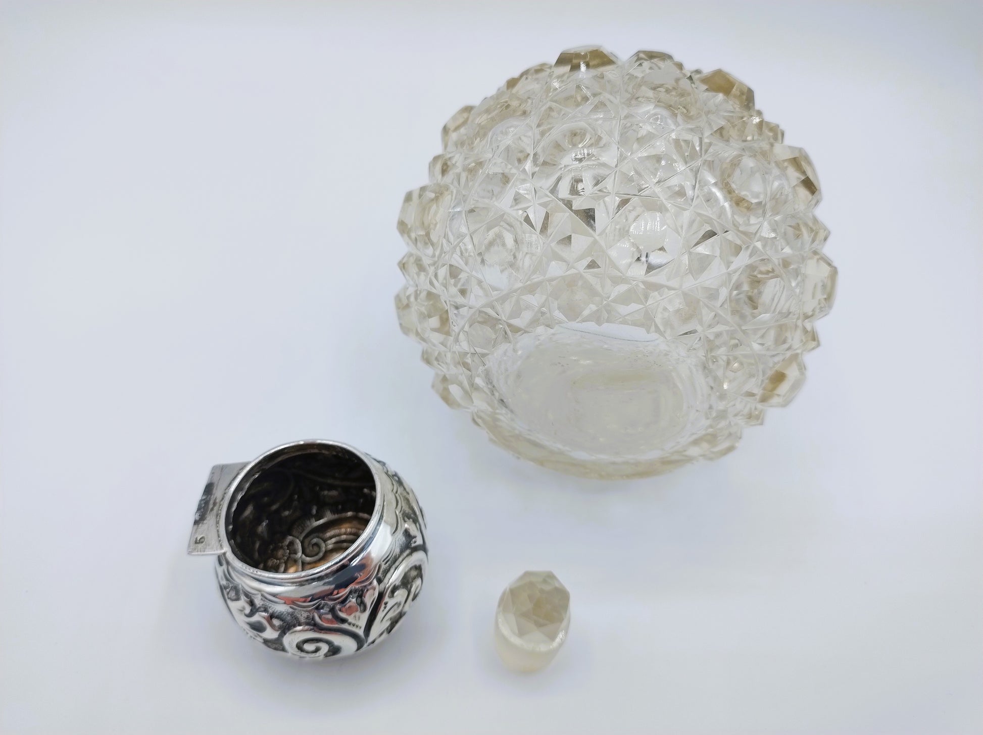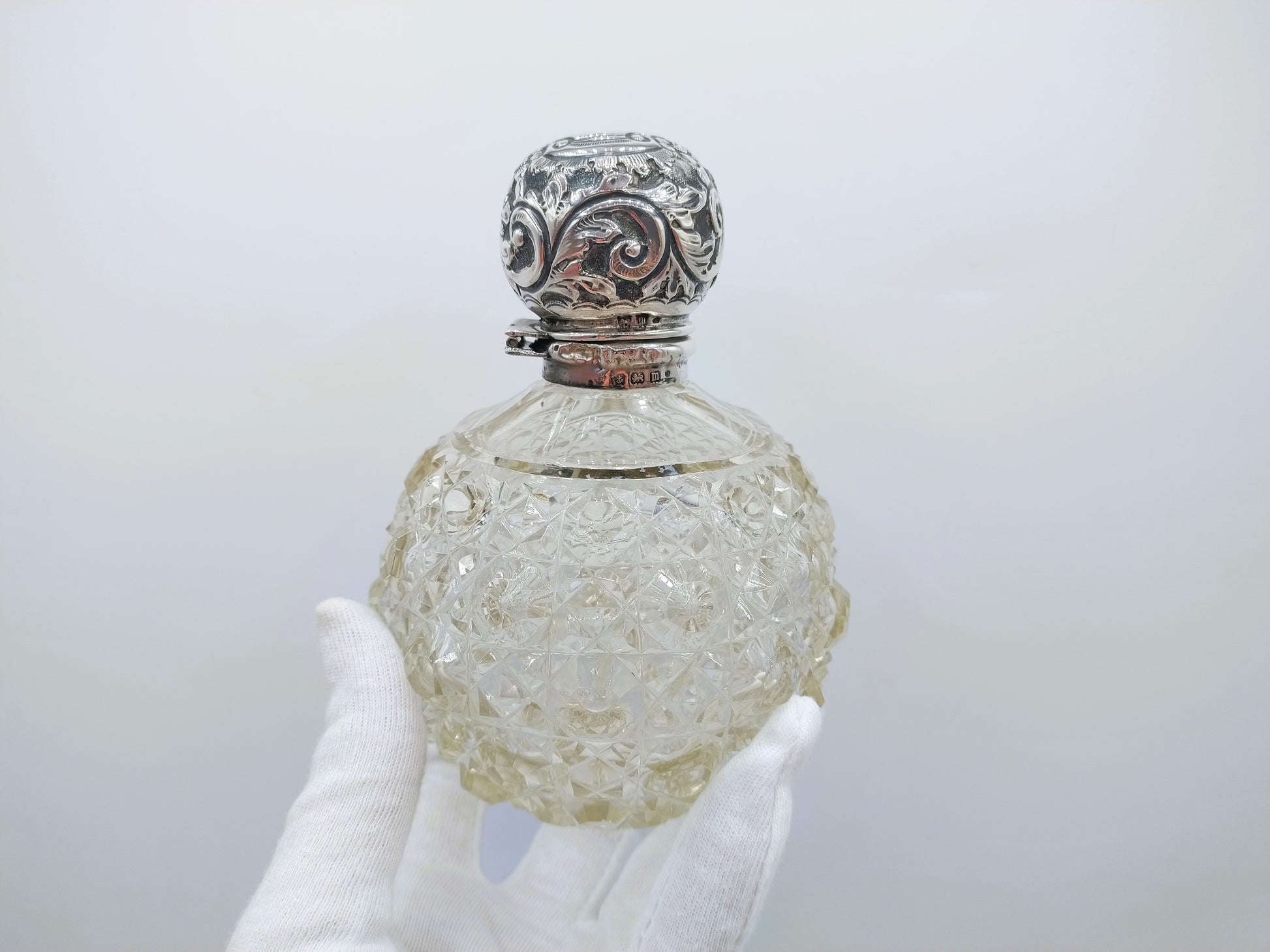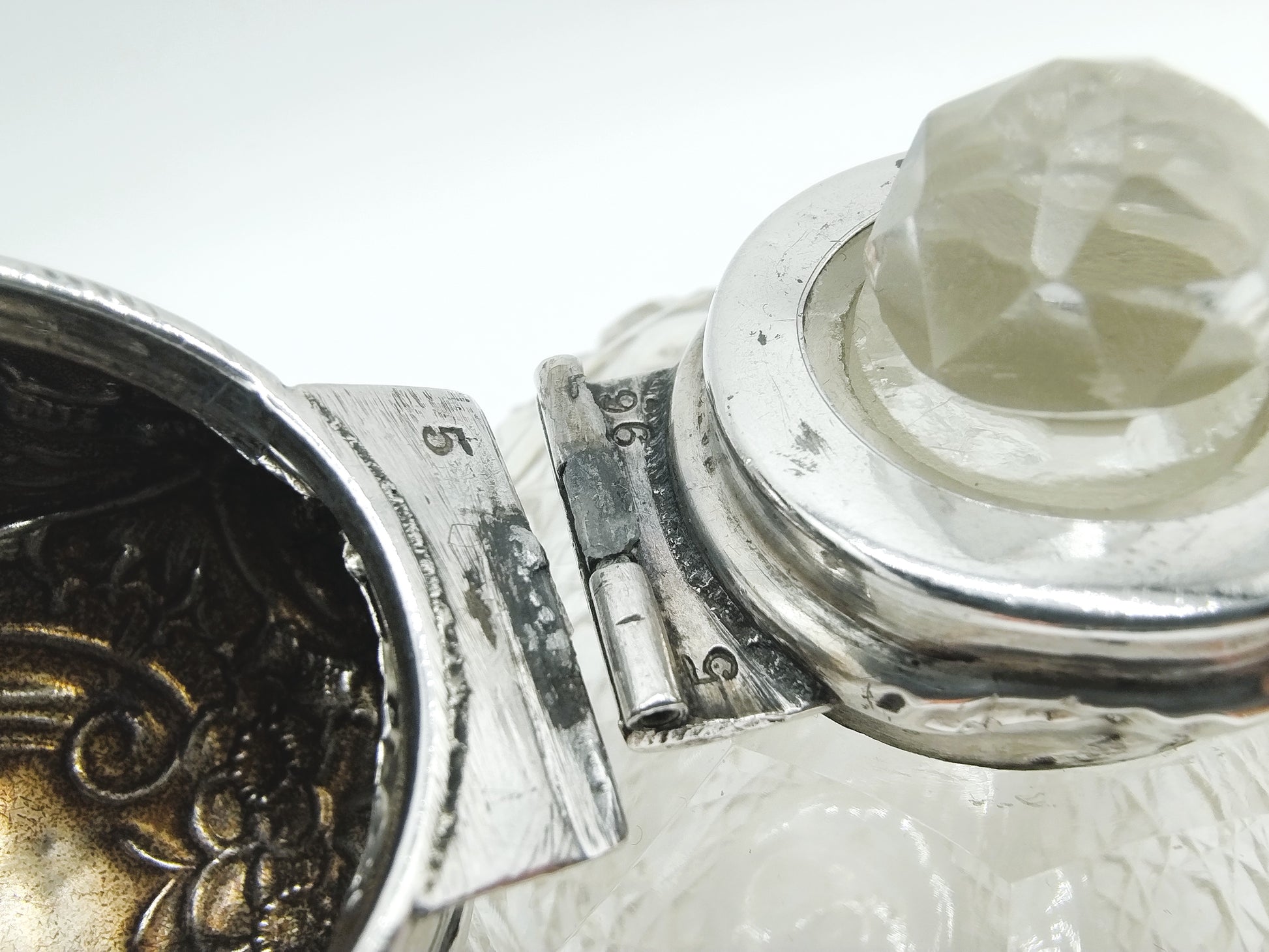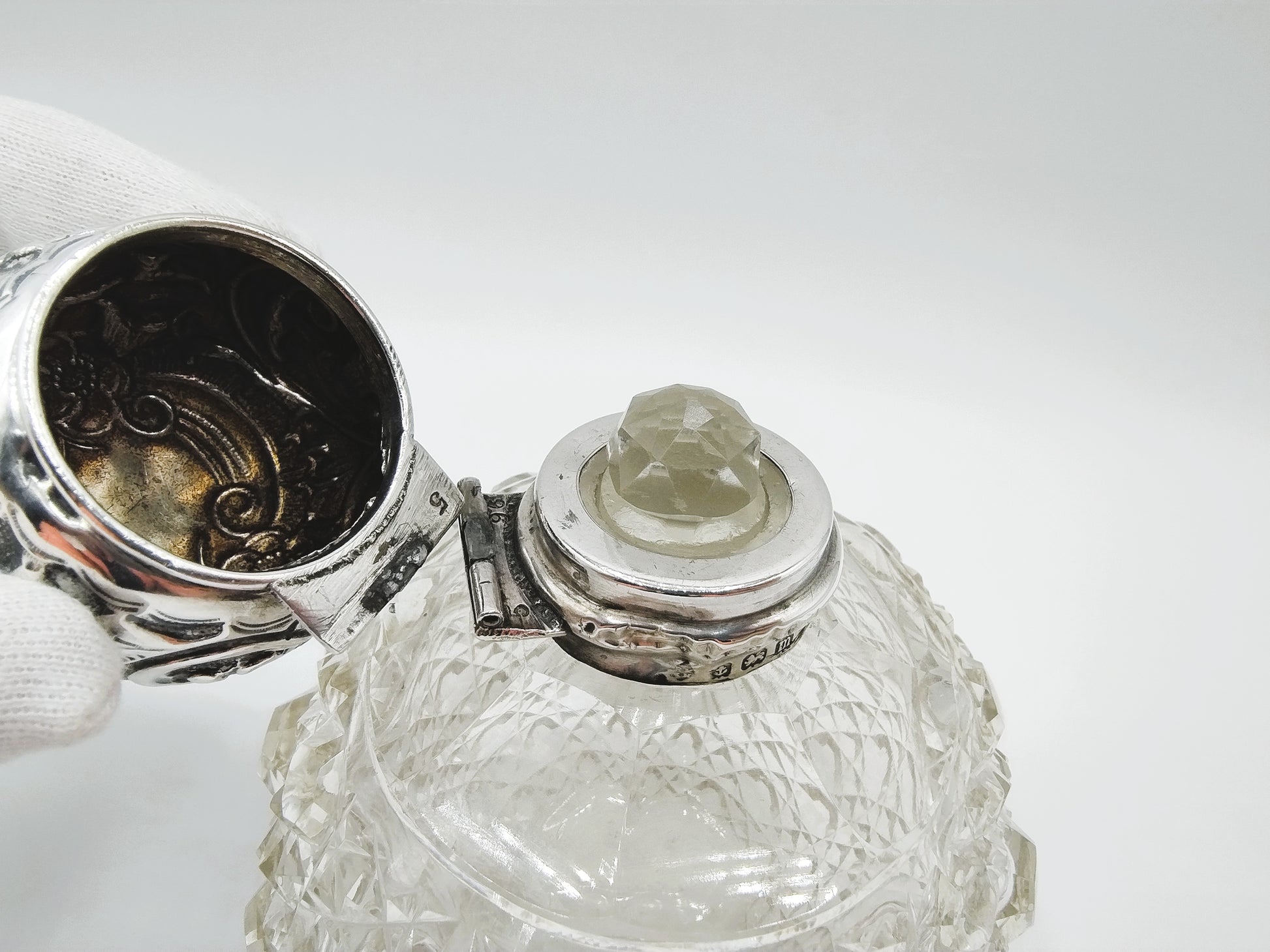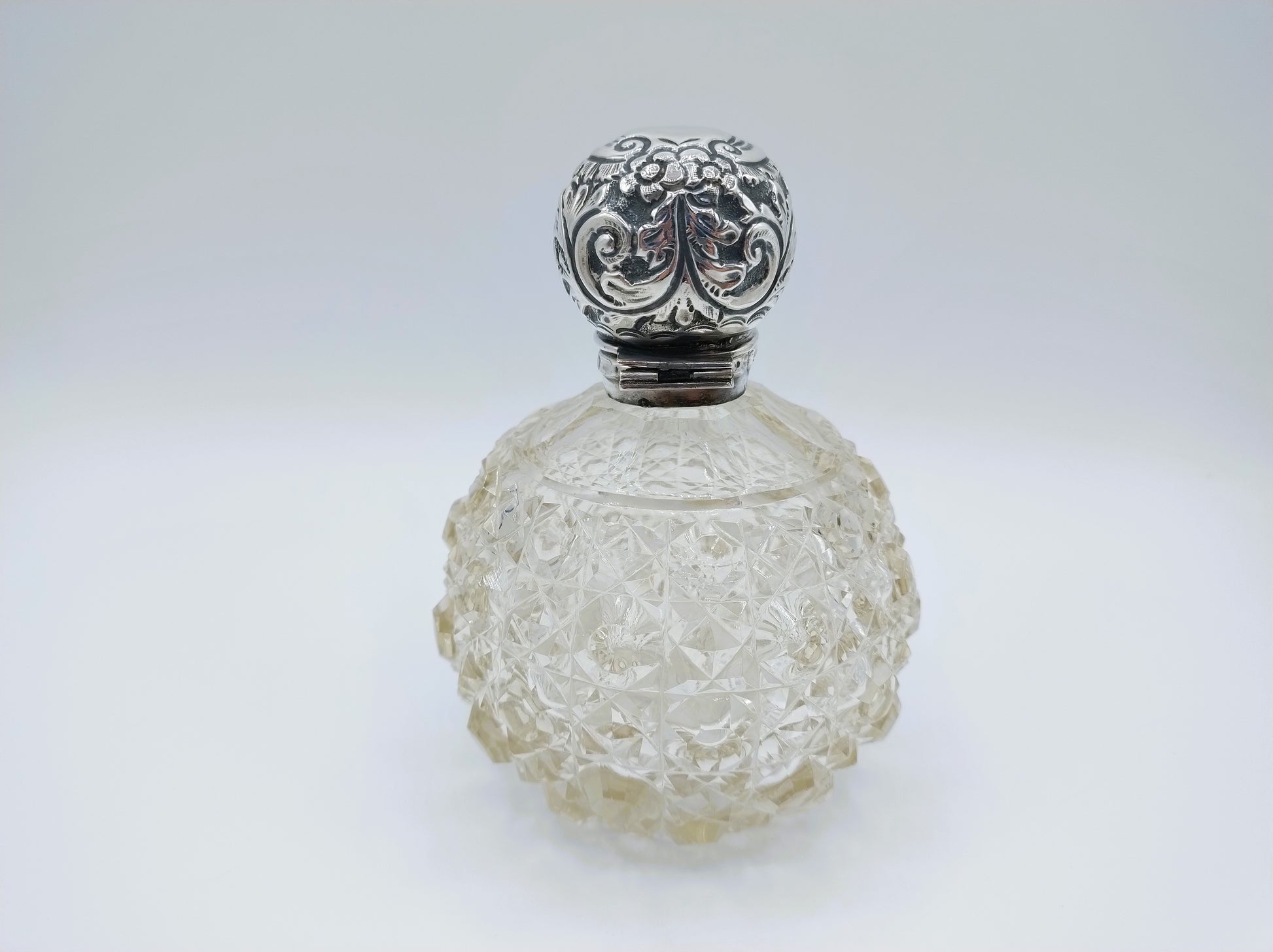 De fles is voorzien van een sterling zilveren dop die bewerkt is met krulmotieven.