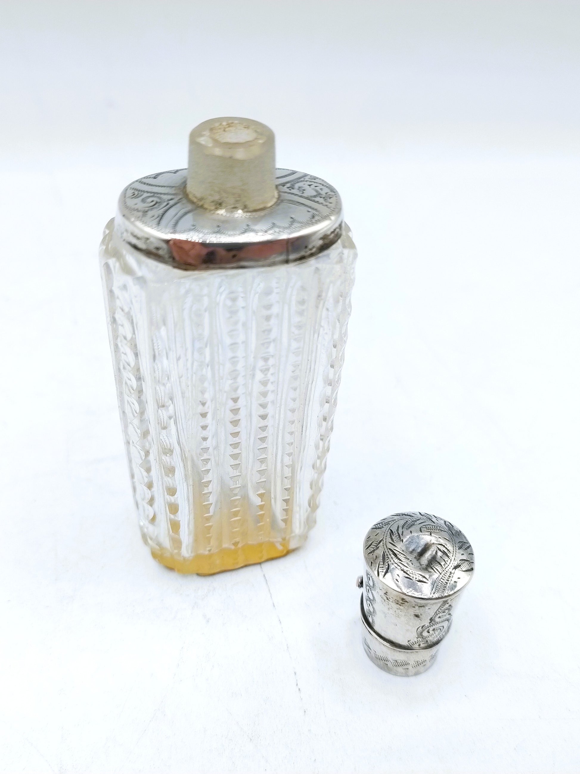 Kristallen parfumflesje voorzien van een zilveren dop. Ook het glazen stolpje is nog aanwezig.
