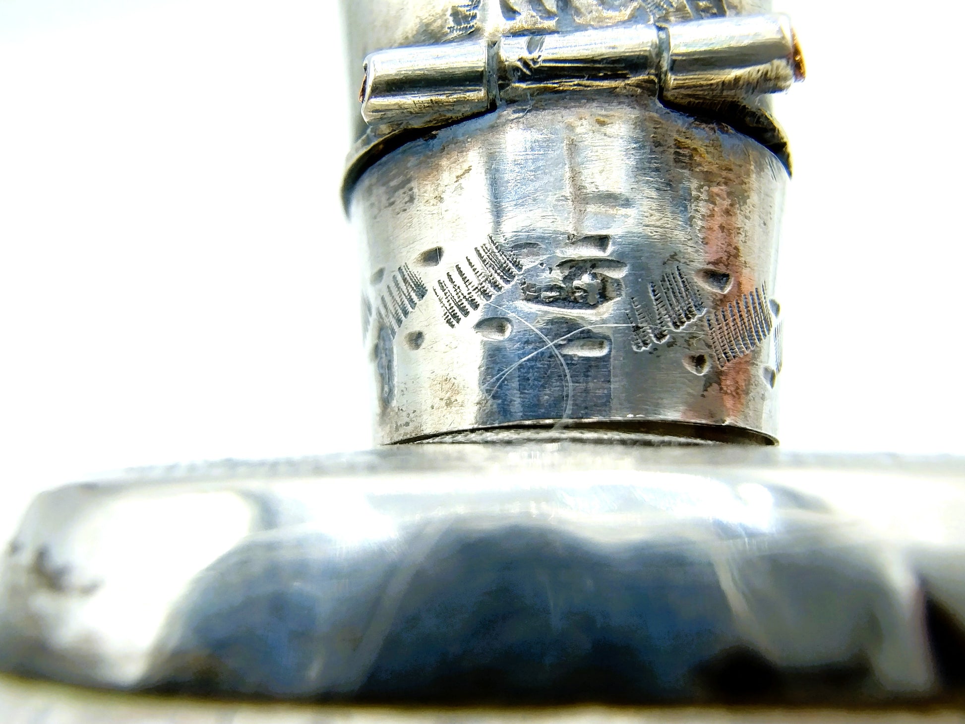 De zilveren dop is gekeurd met het zwaardje en een onbekend meesterkeur met een ster en een kruis.