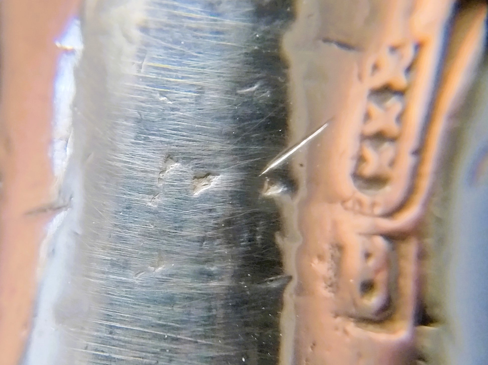 Het mes is voorzien van een banddecor met krul- en bladmotieven.