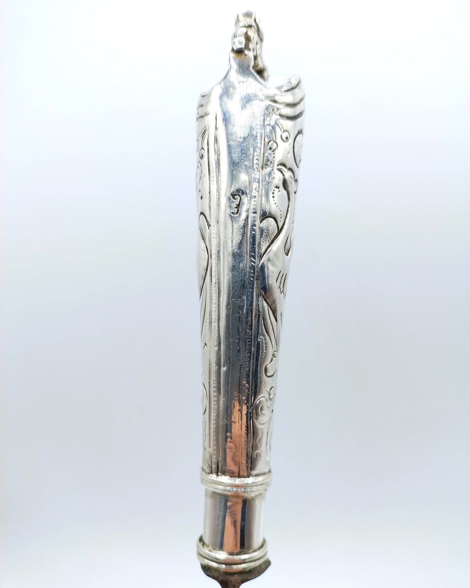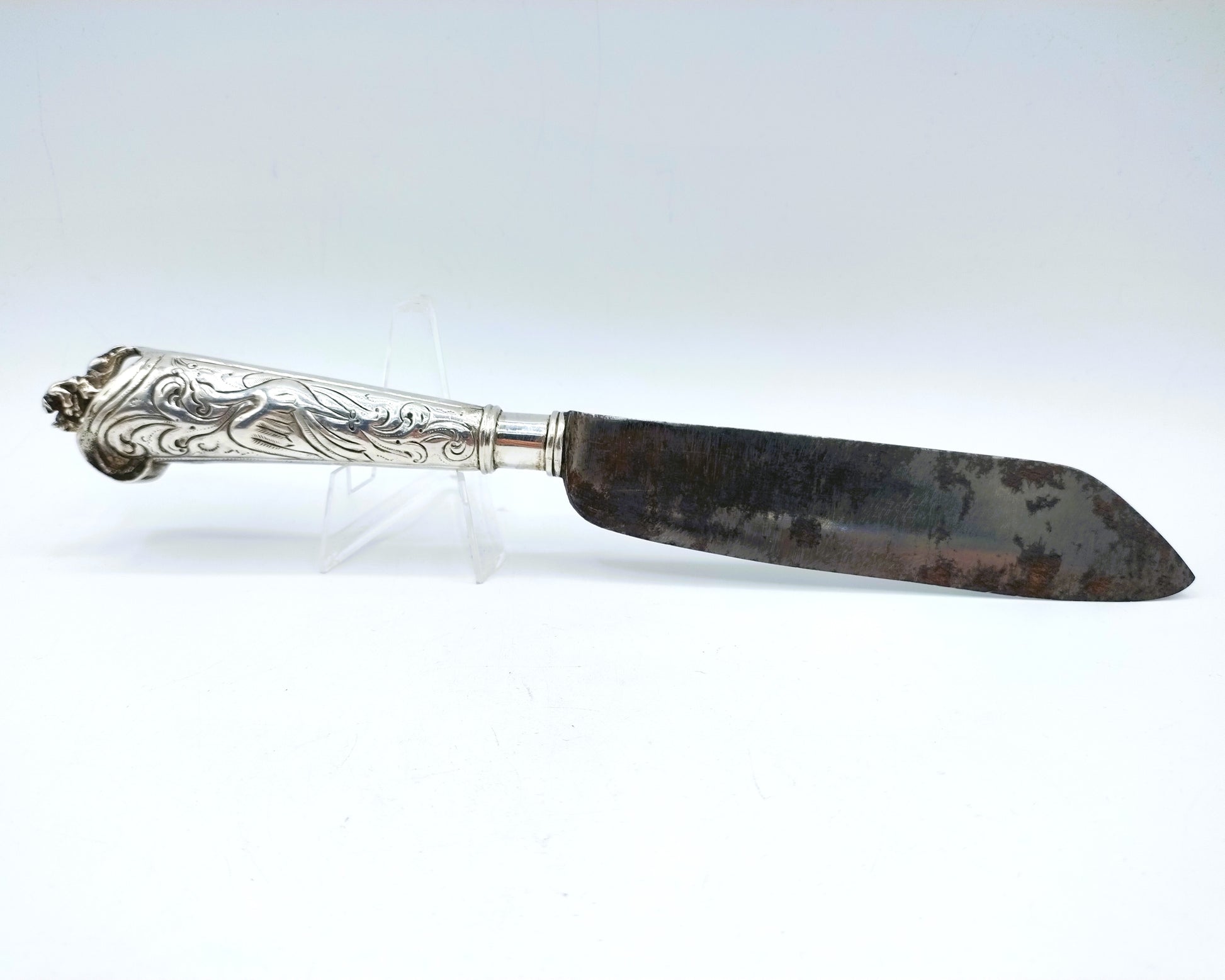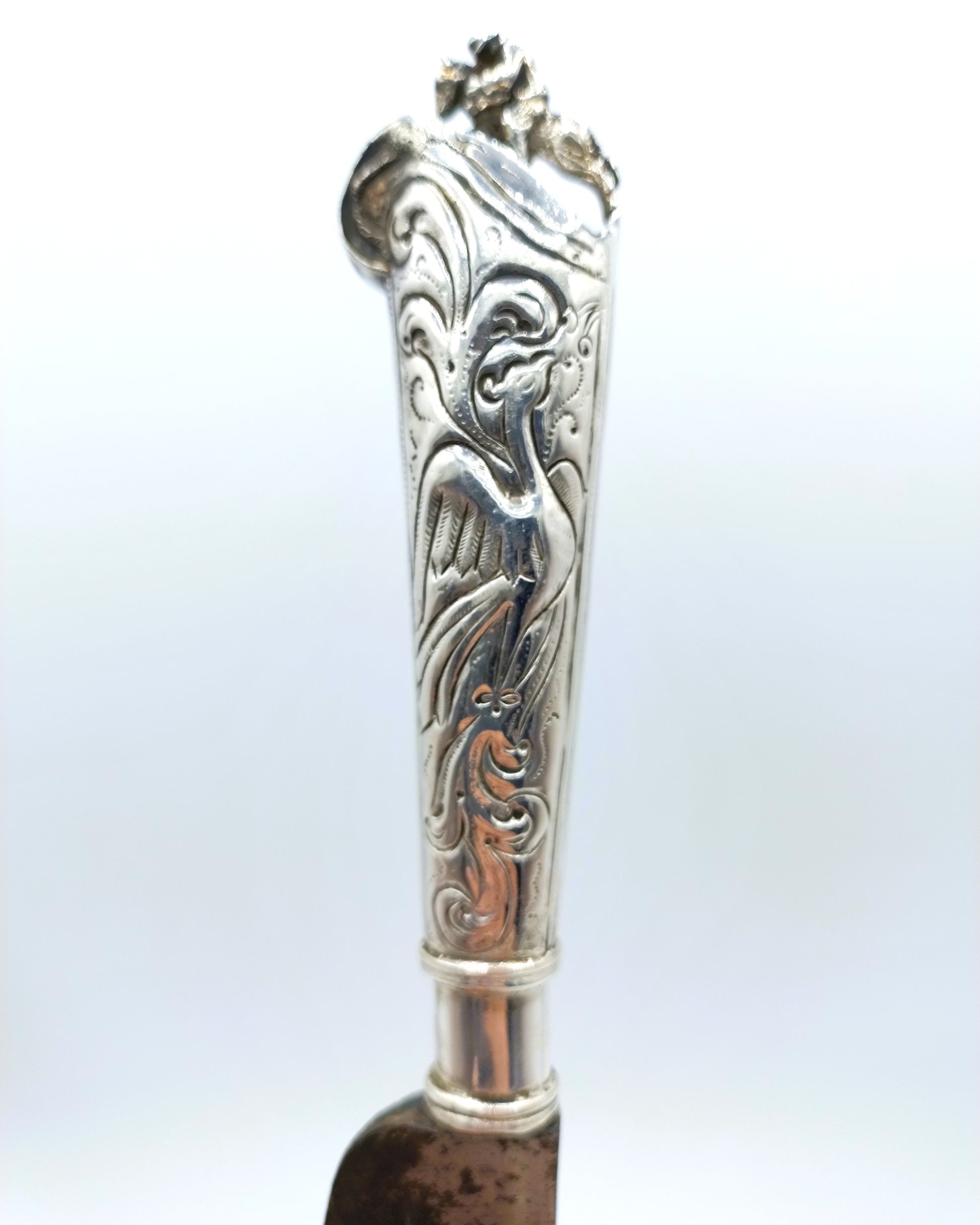 Zilveren mesheft aan een orgineel ijzeren lemmet met inscriptie Becker. Het heft is voorzien van krulmotieven en vogelfiguren en heeft als bekroning een ruiter te paard.