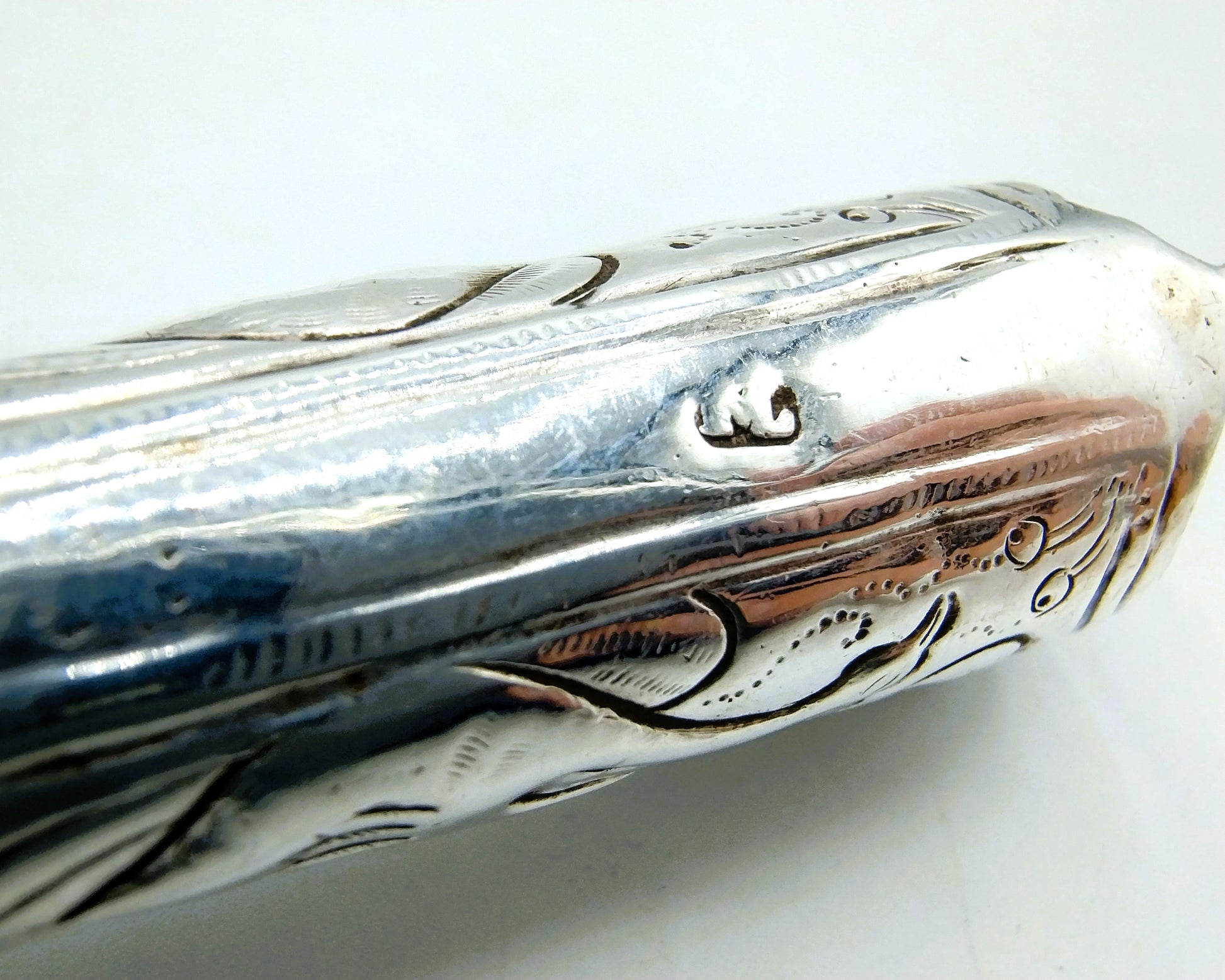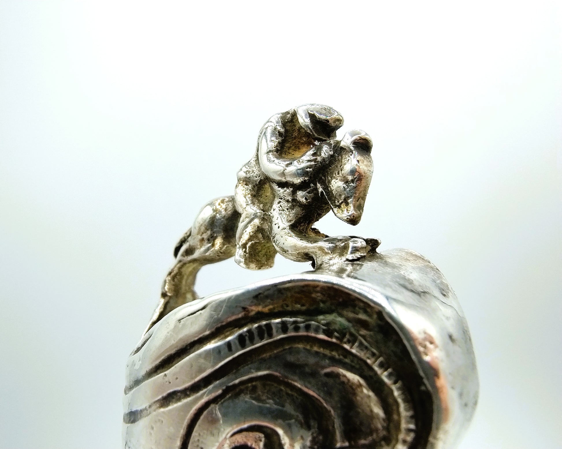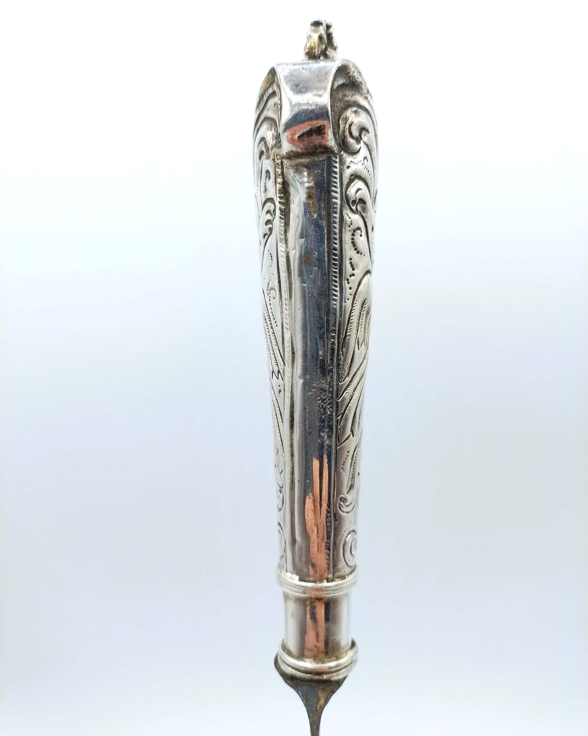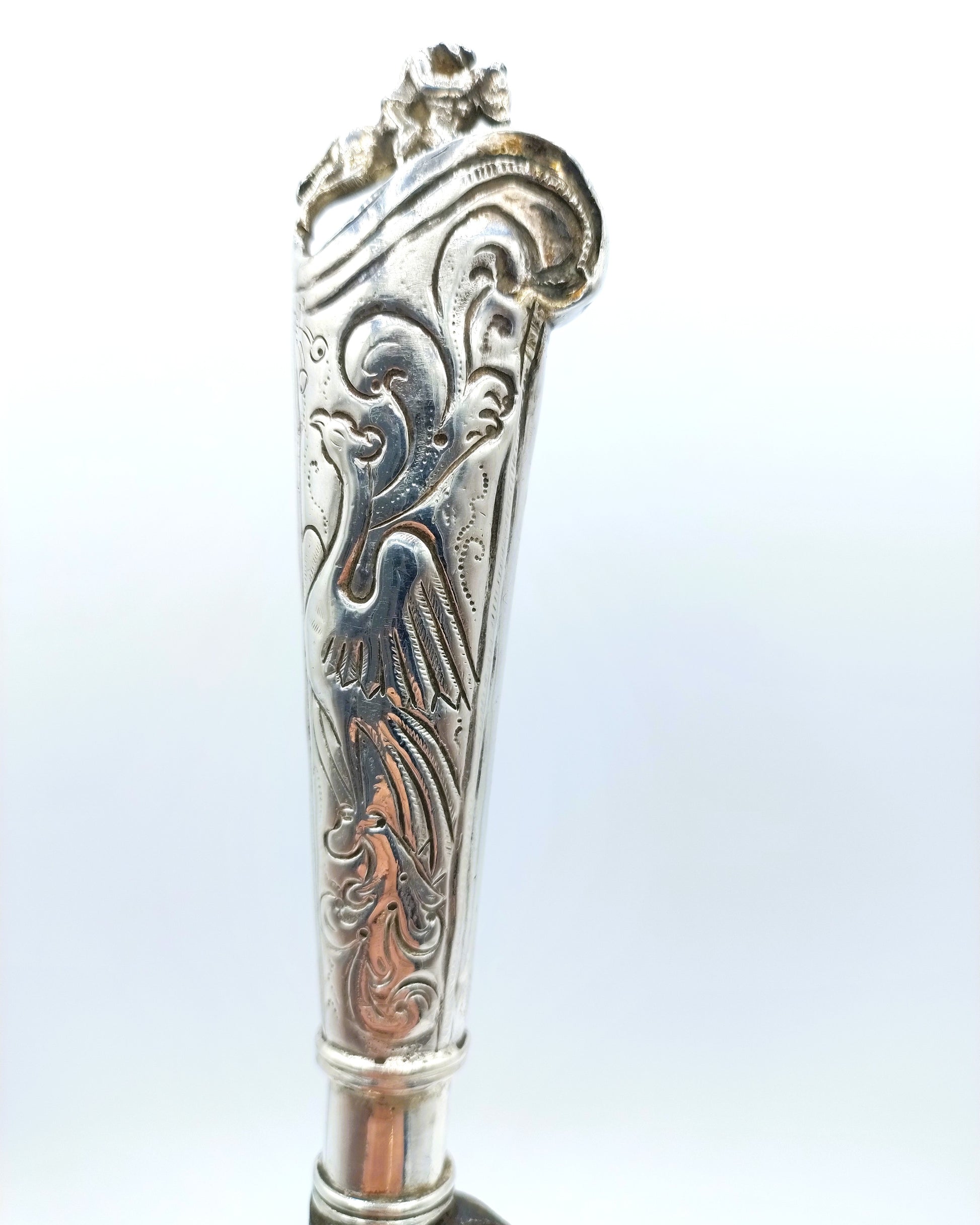 Zilveren mesheft aan een orgineel ijzeren lemmet met inscriptie Becker. Het heft is voorzien van krulmotieven en vogelfiguren en heeft als bekroning een ruiter te paard.