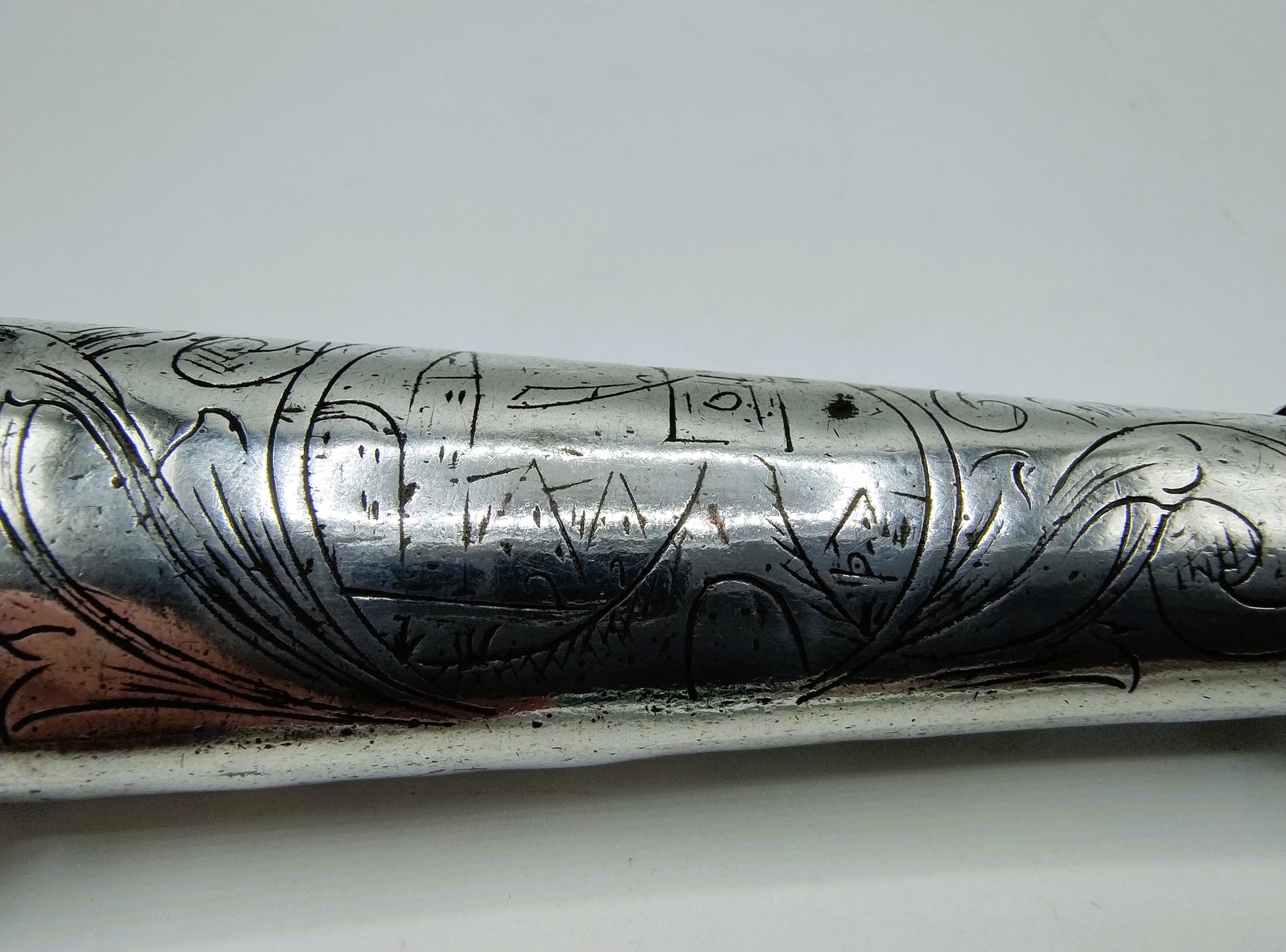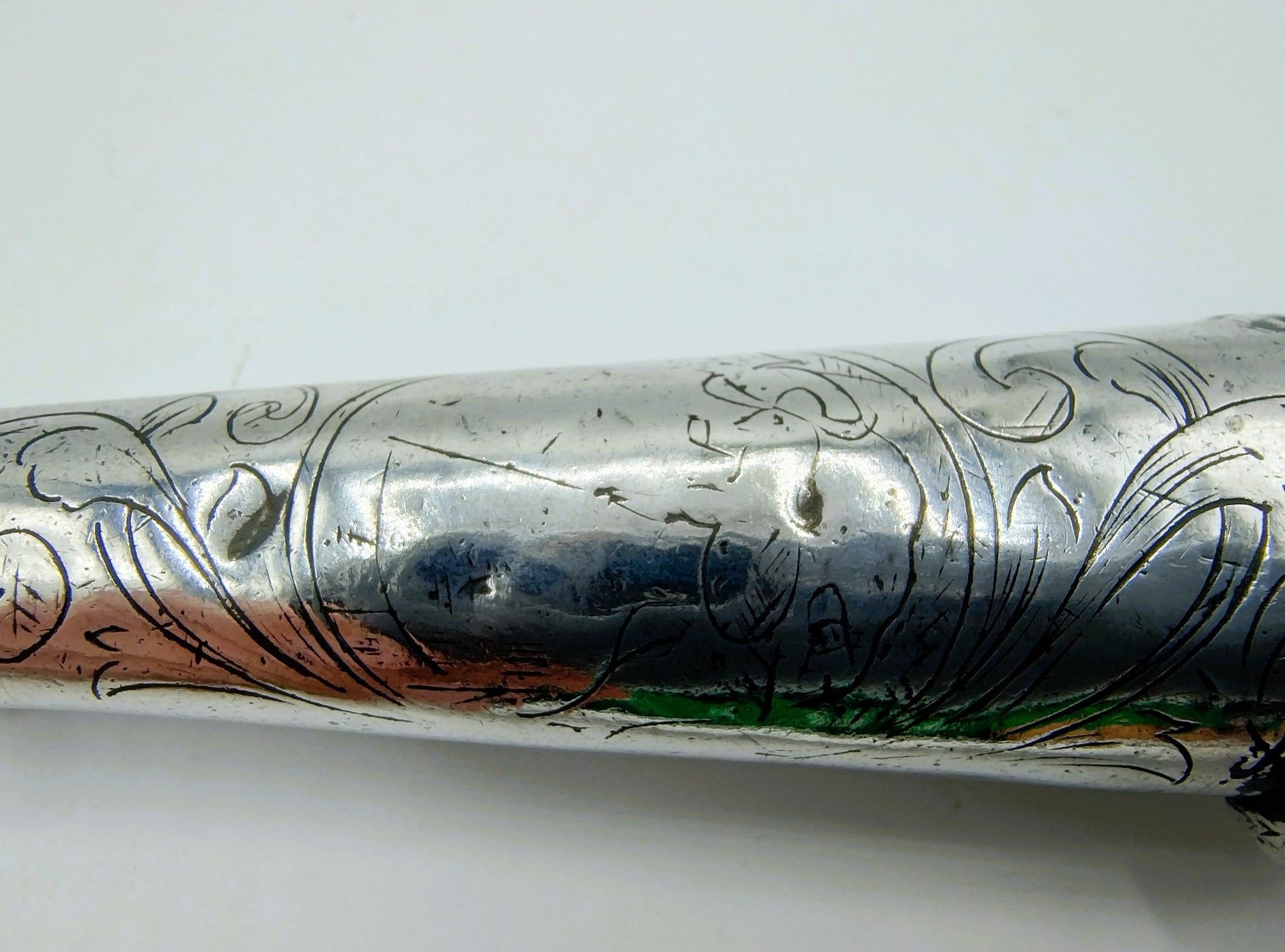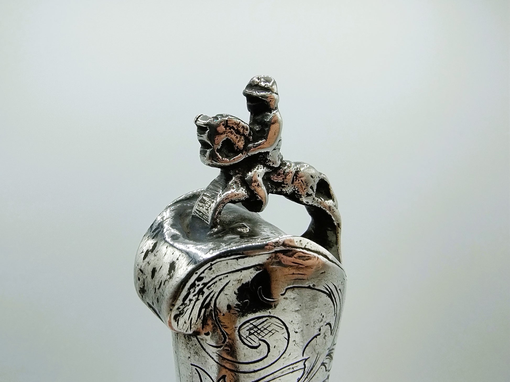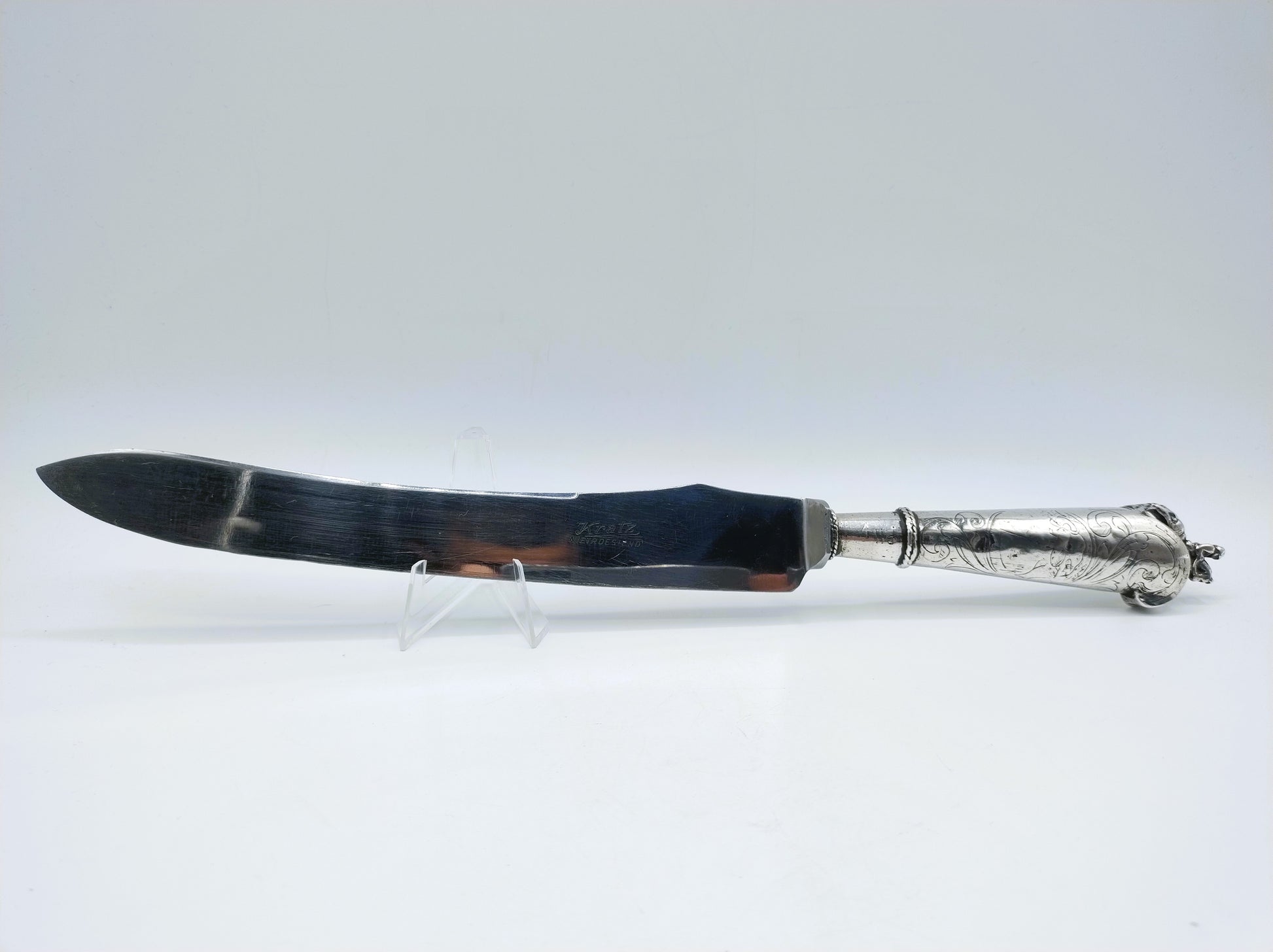 18e Eeuws zilveren mes met banddecor (krul en bladmotieven met afbeelding van visser en dorpsdecor met molen). Aan de achterkant een paard met ruiter als bekroning.