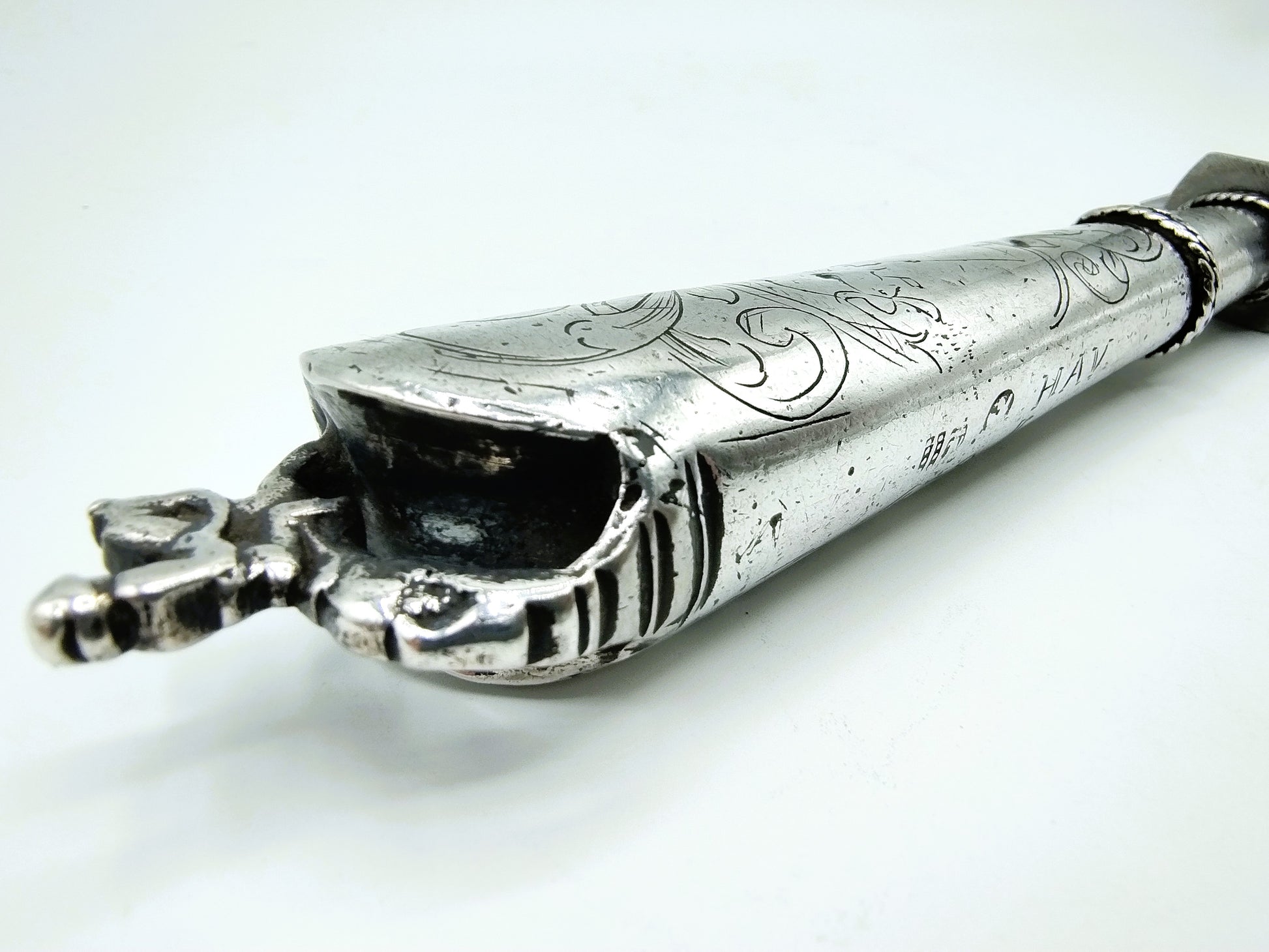 Het mes is gekeurd met het meesterkeur eenhoorn (unicorn), stadskeur van Gouda en een moeilijk leesbaar jaarletter mogelijk N voor 1718 of 1742.