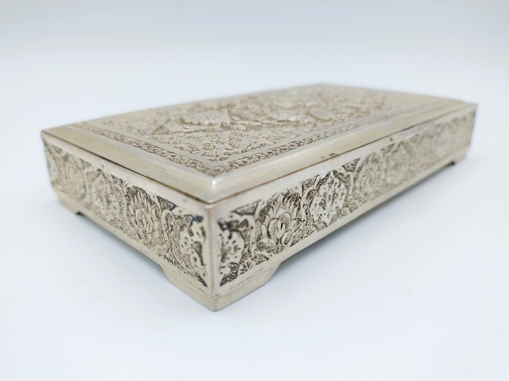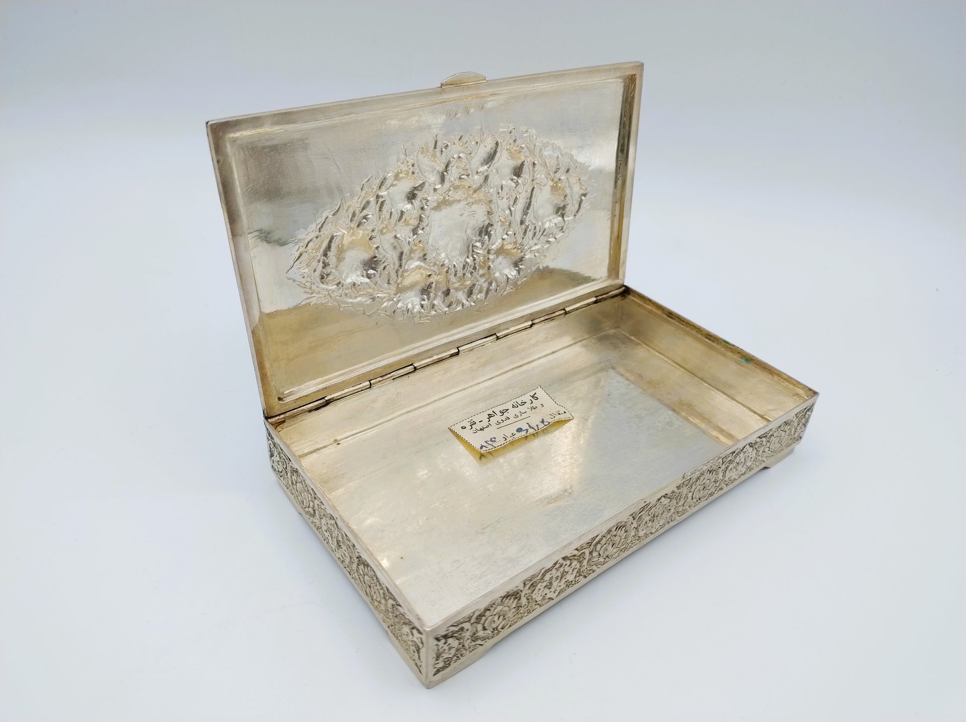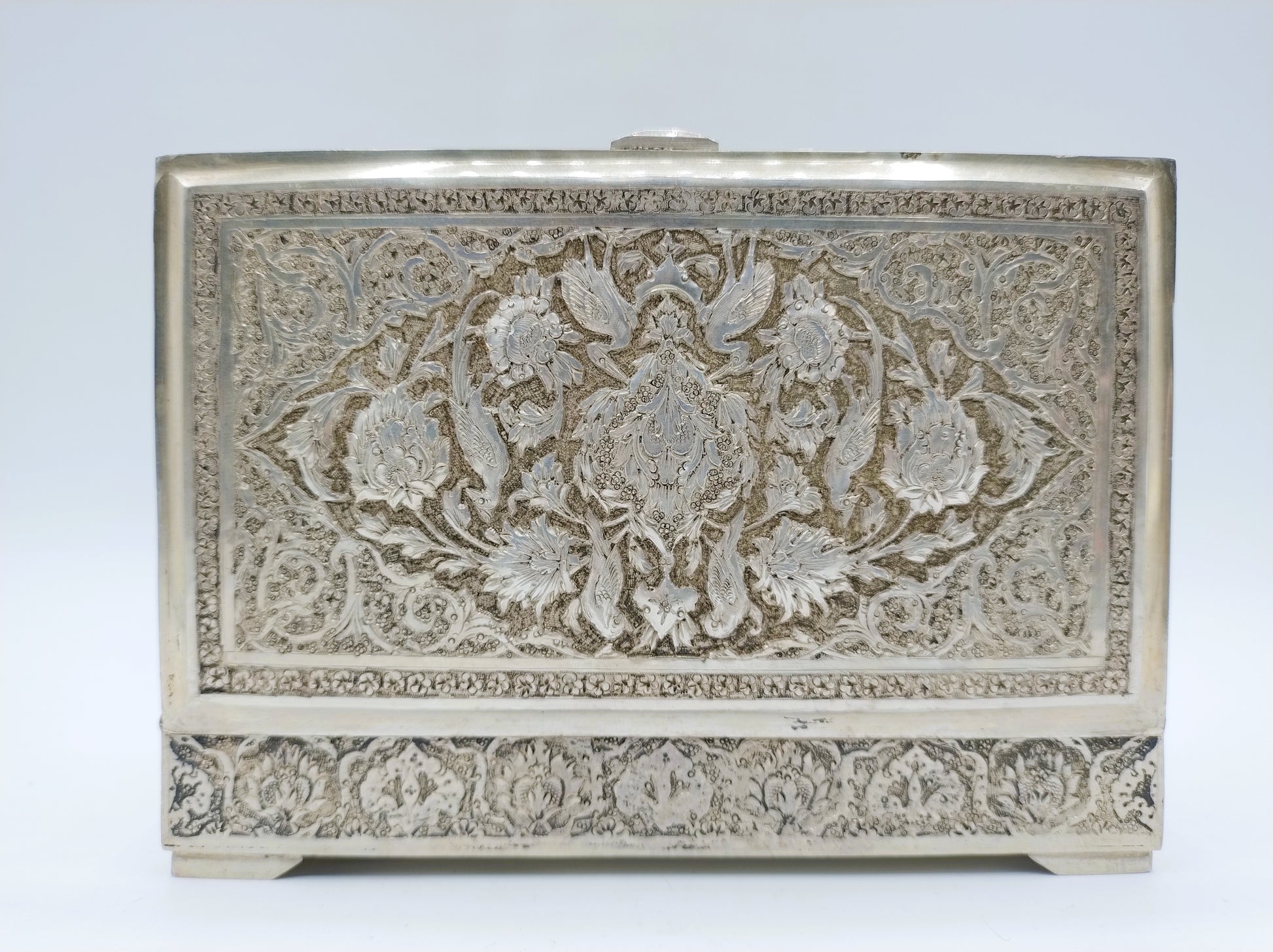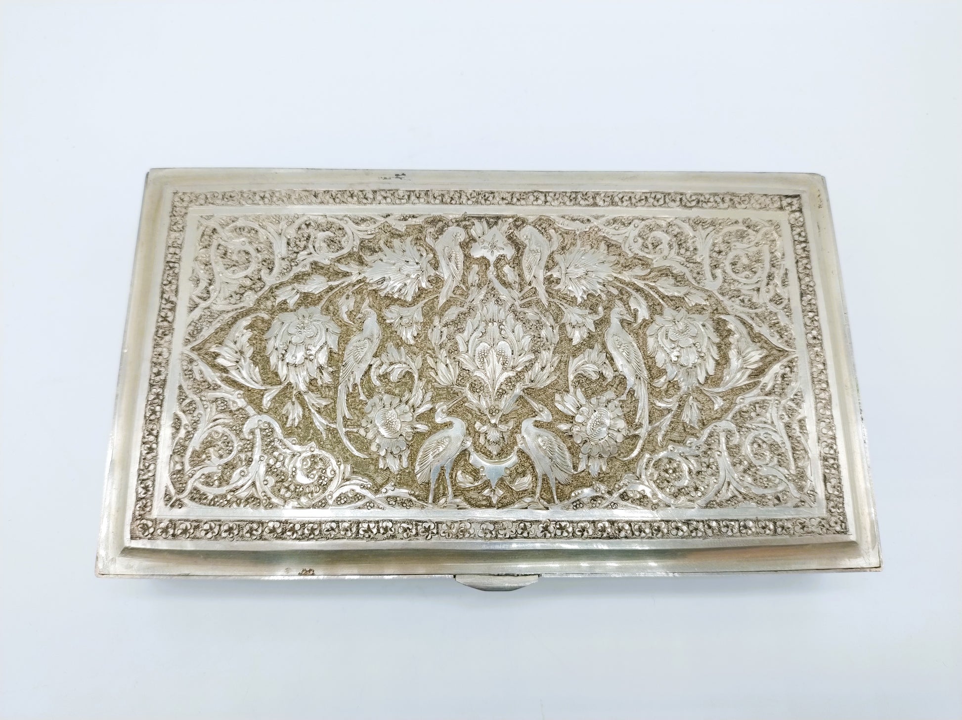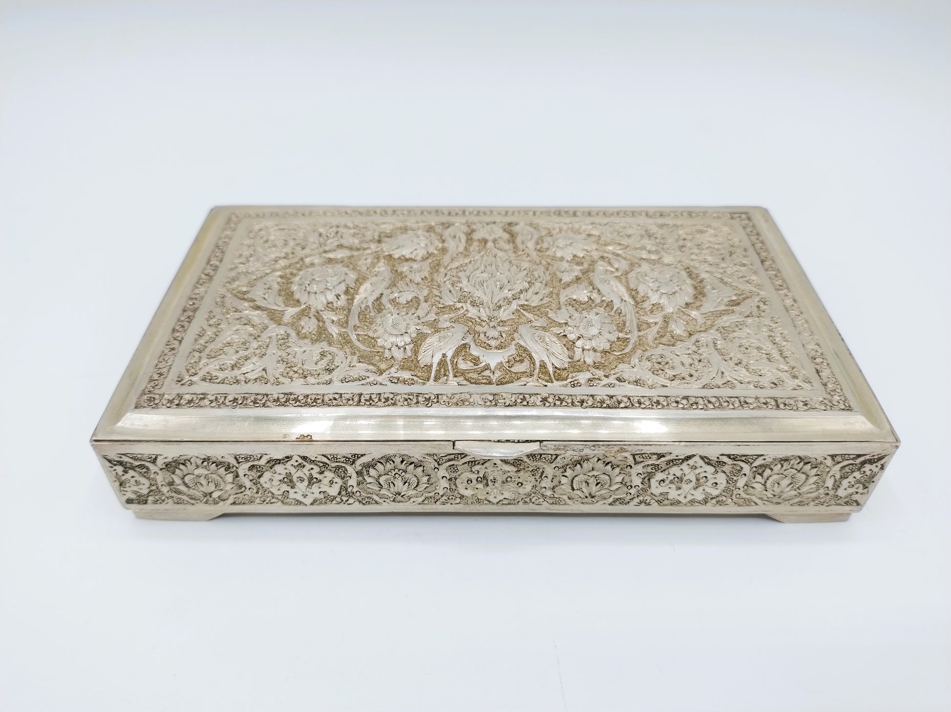 De doos is rijk versierd met filigrein zilversmeedwerk. Tussen de versiering zijn vogels en bloemen te herkennen.