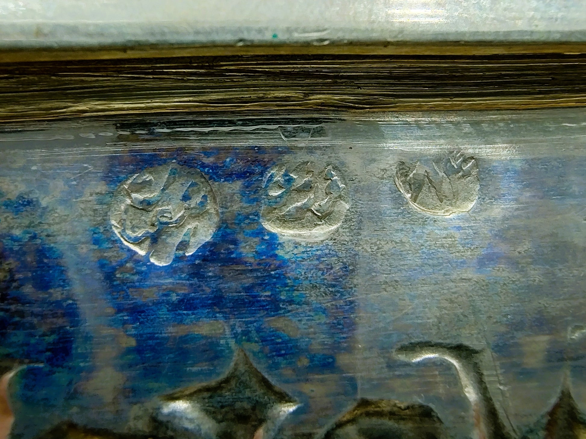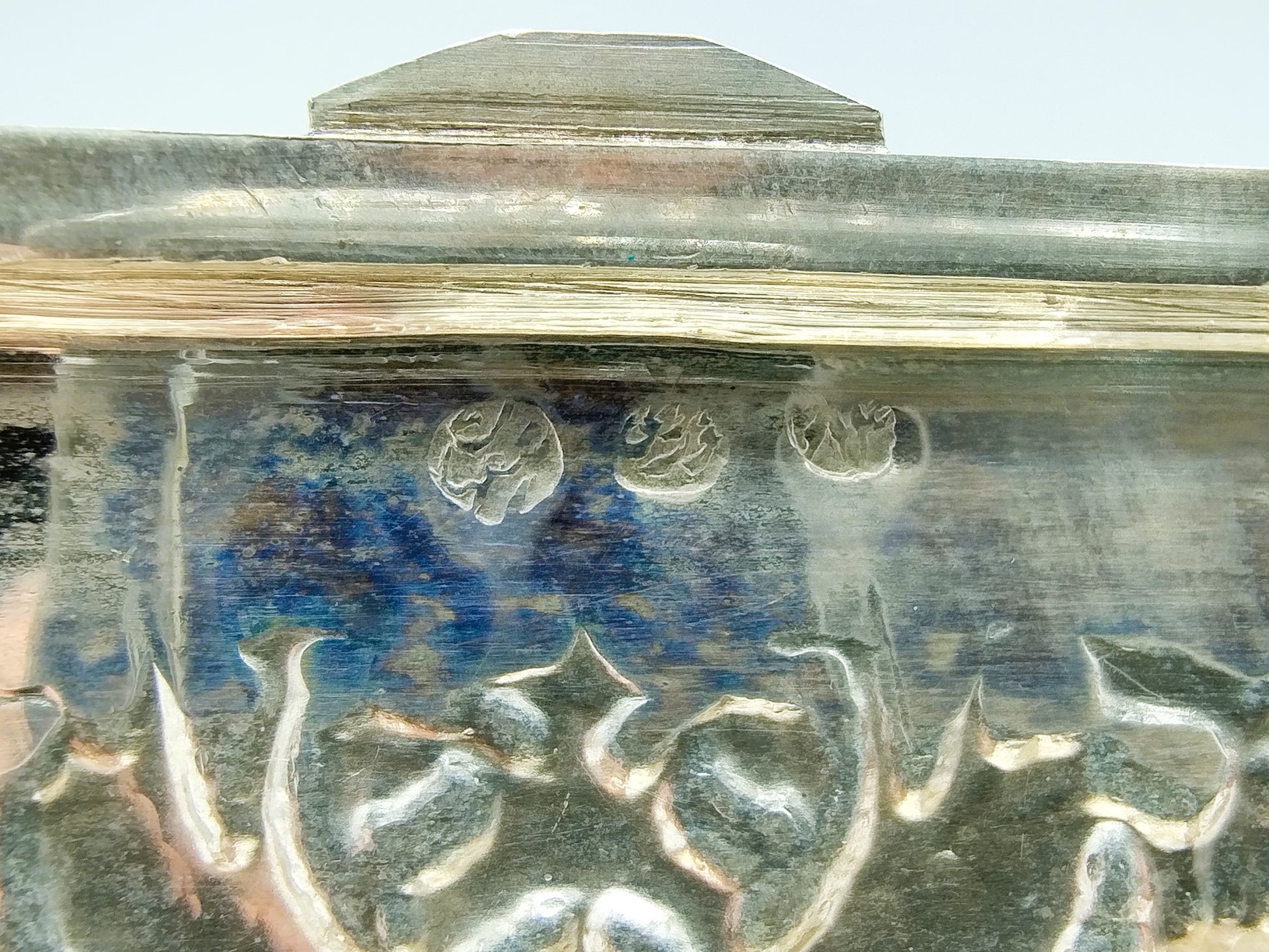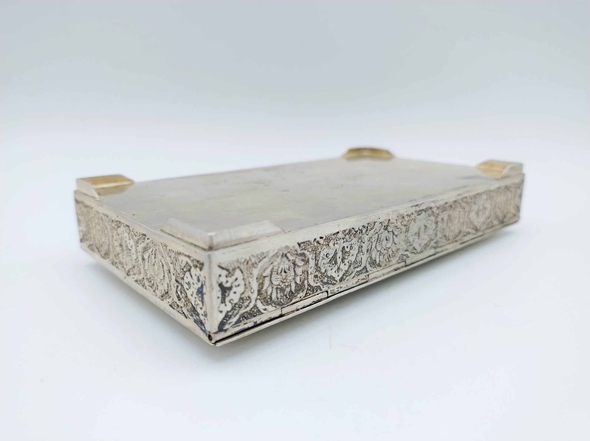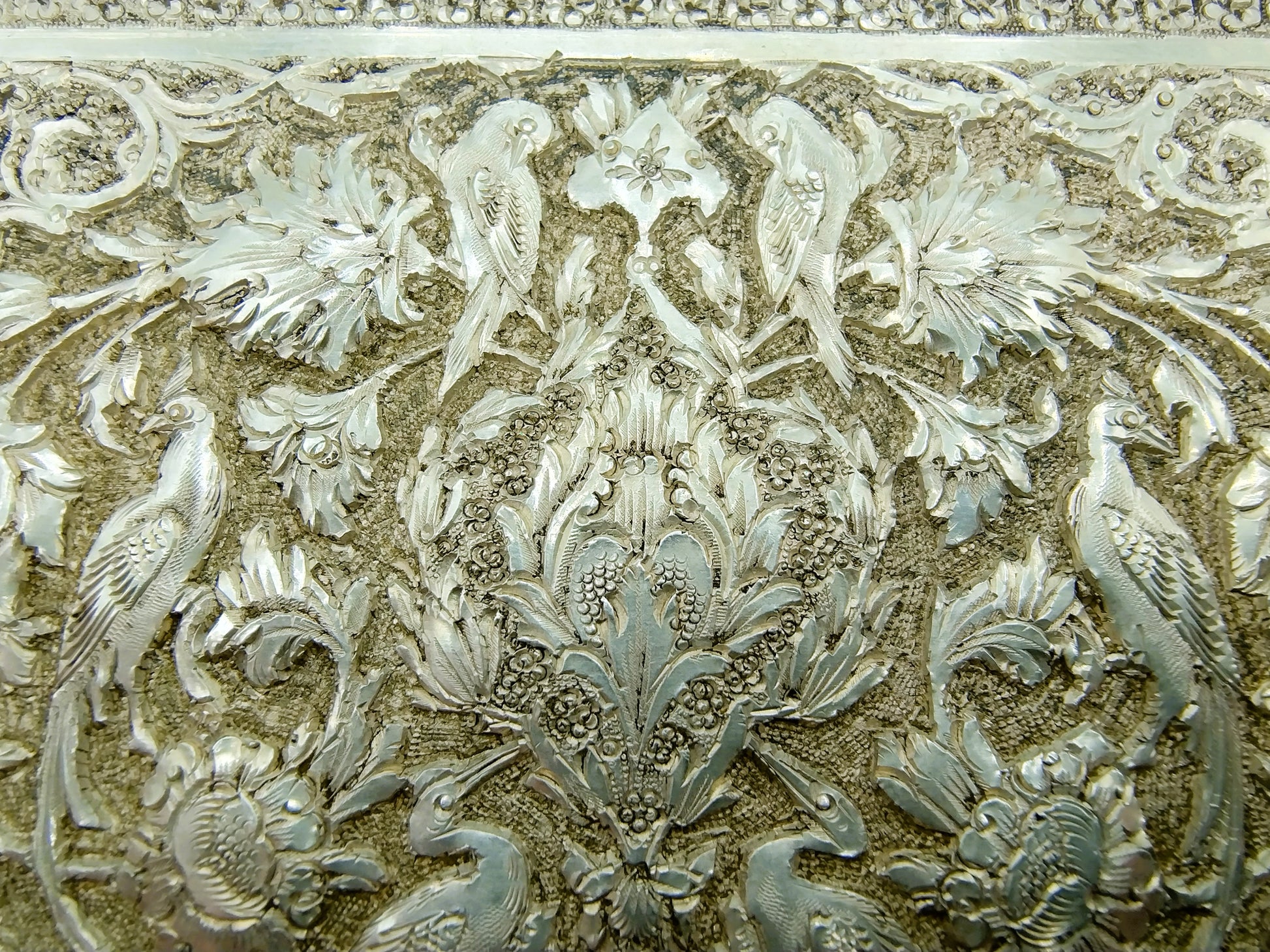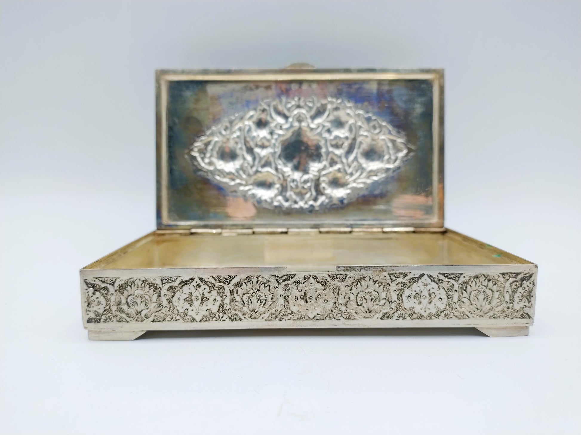 De doos is rijk versierd met filigrein zilversmeedwerk. Tussen de versiering zijn vogels en bloemen te herkennen.