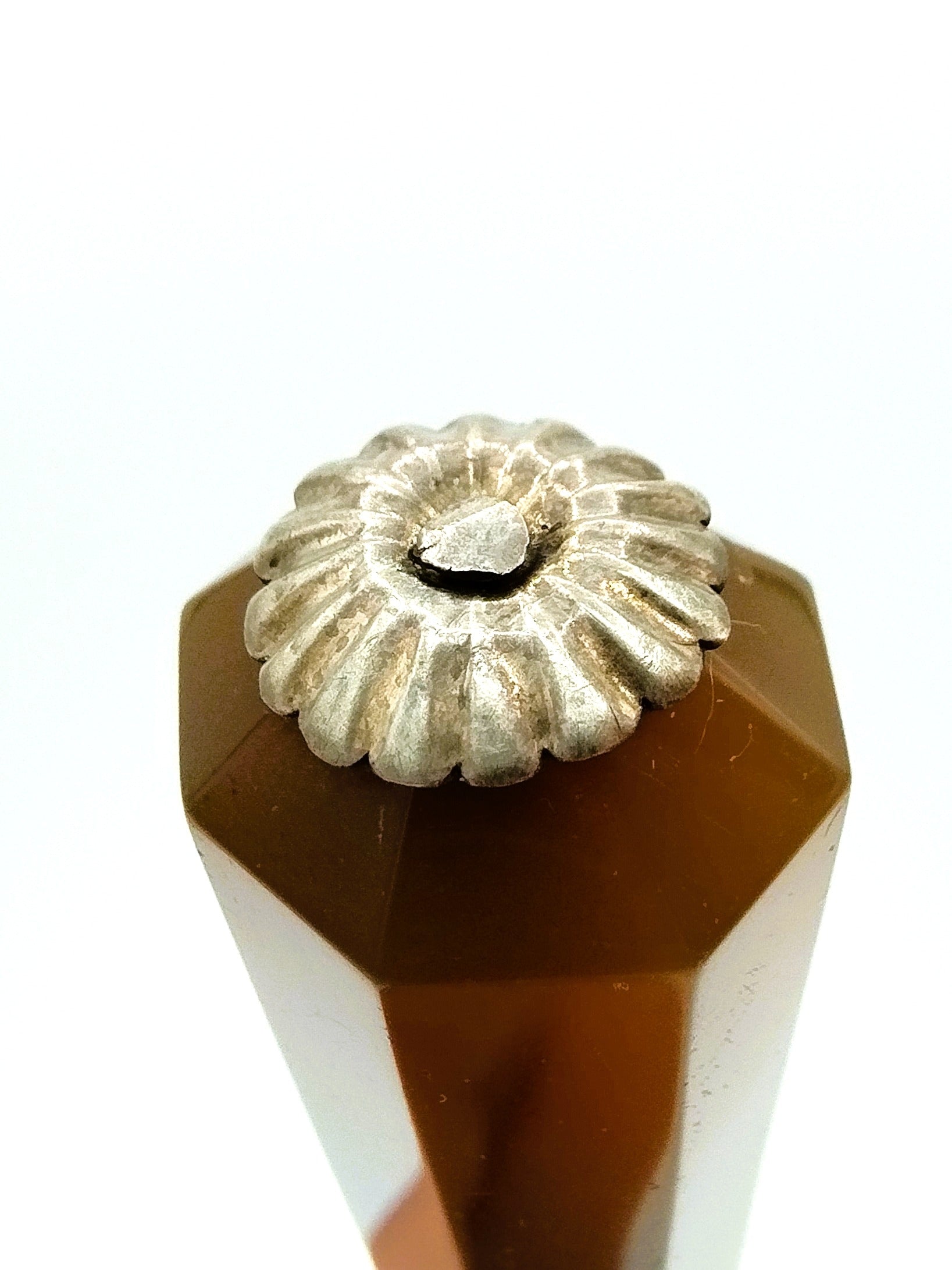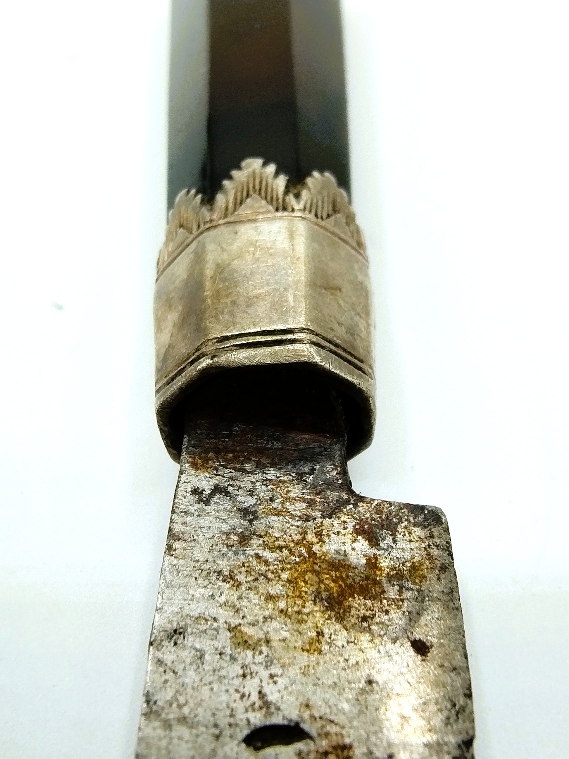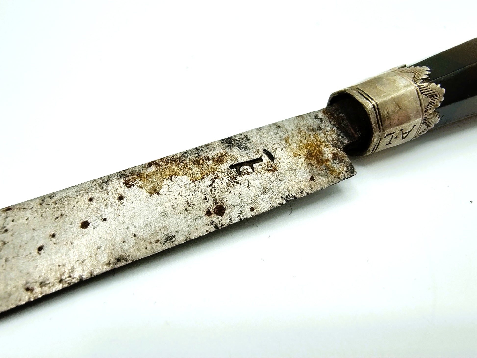 Het heft is voorzien van een zilveren versiering met daarin de eigenaarsinitialen: A.L.