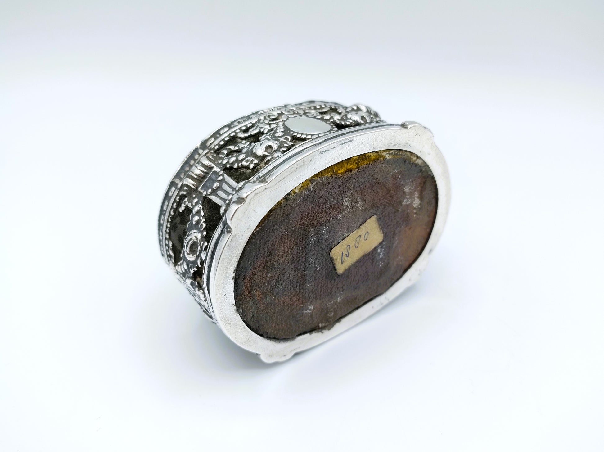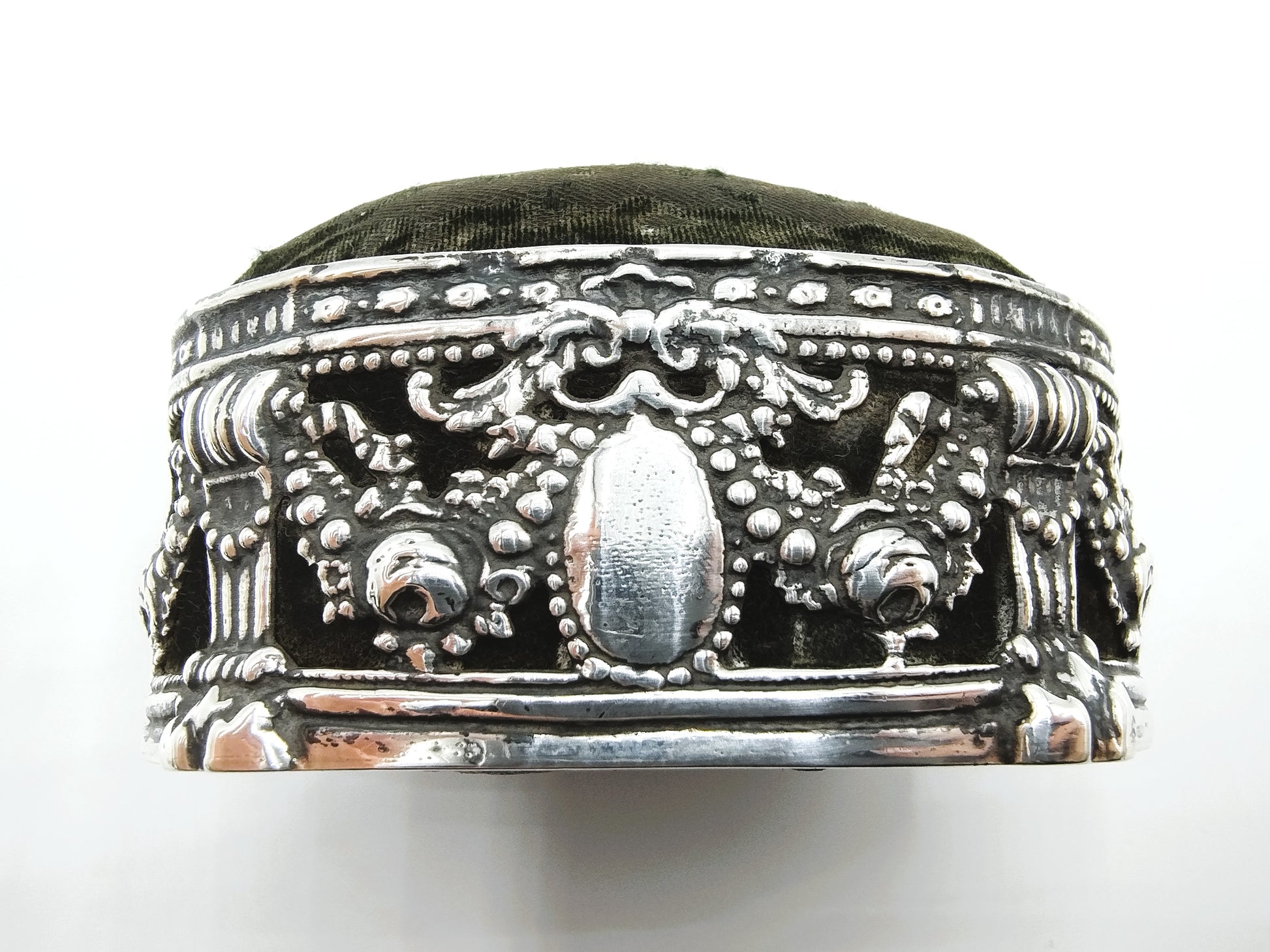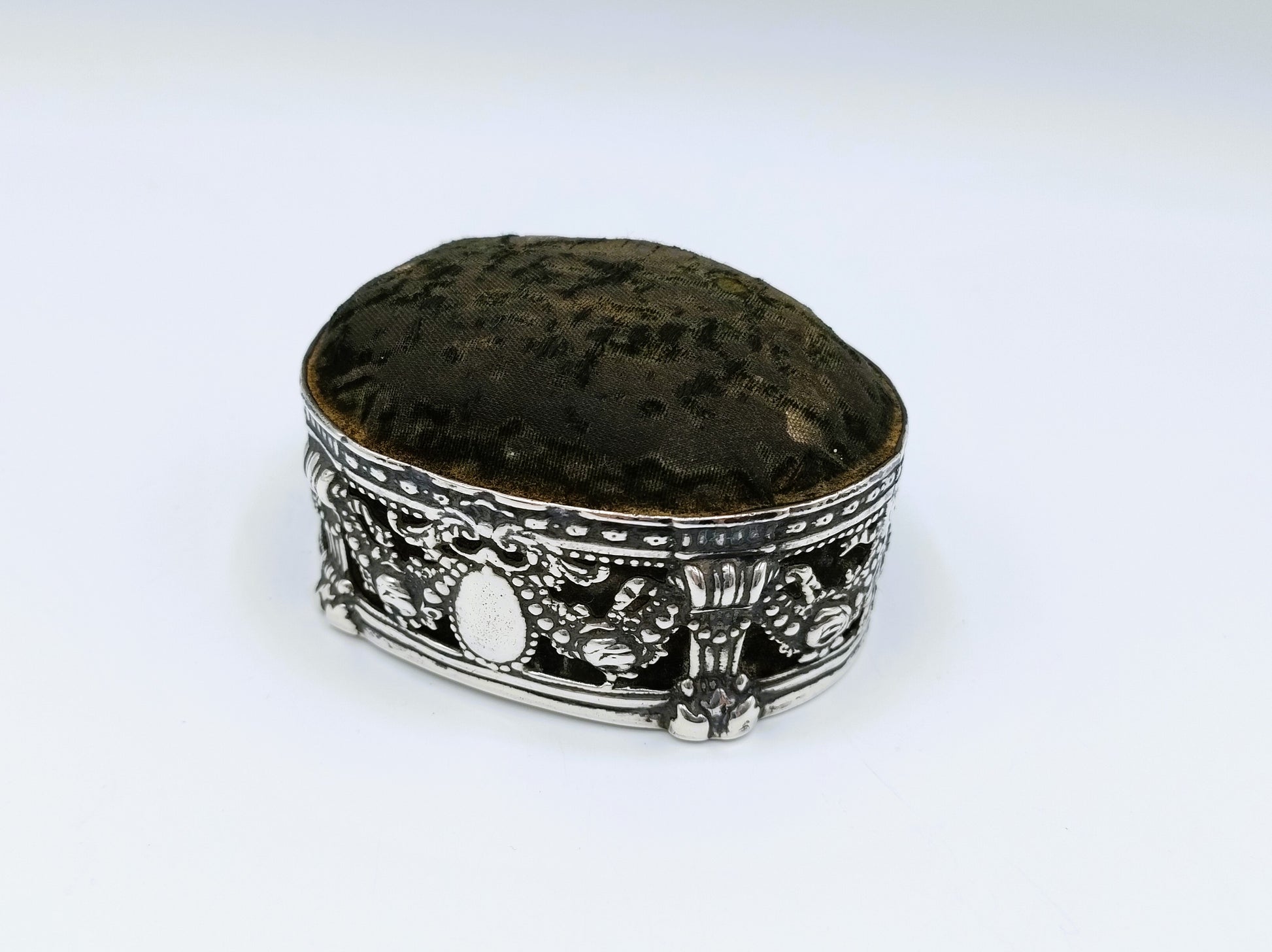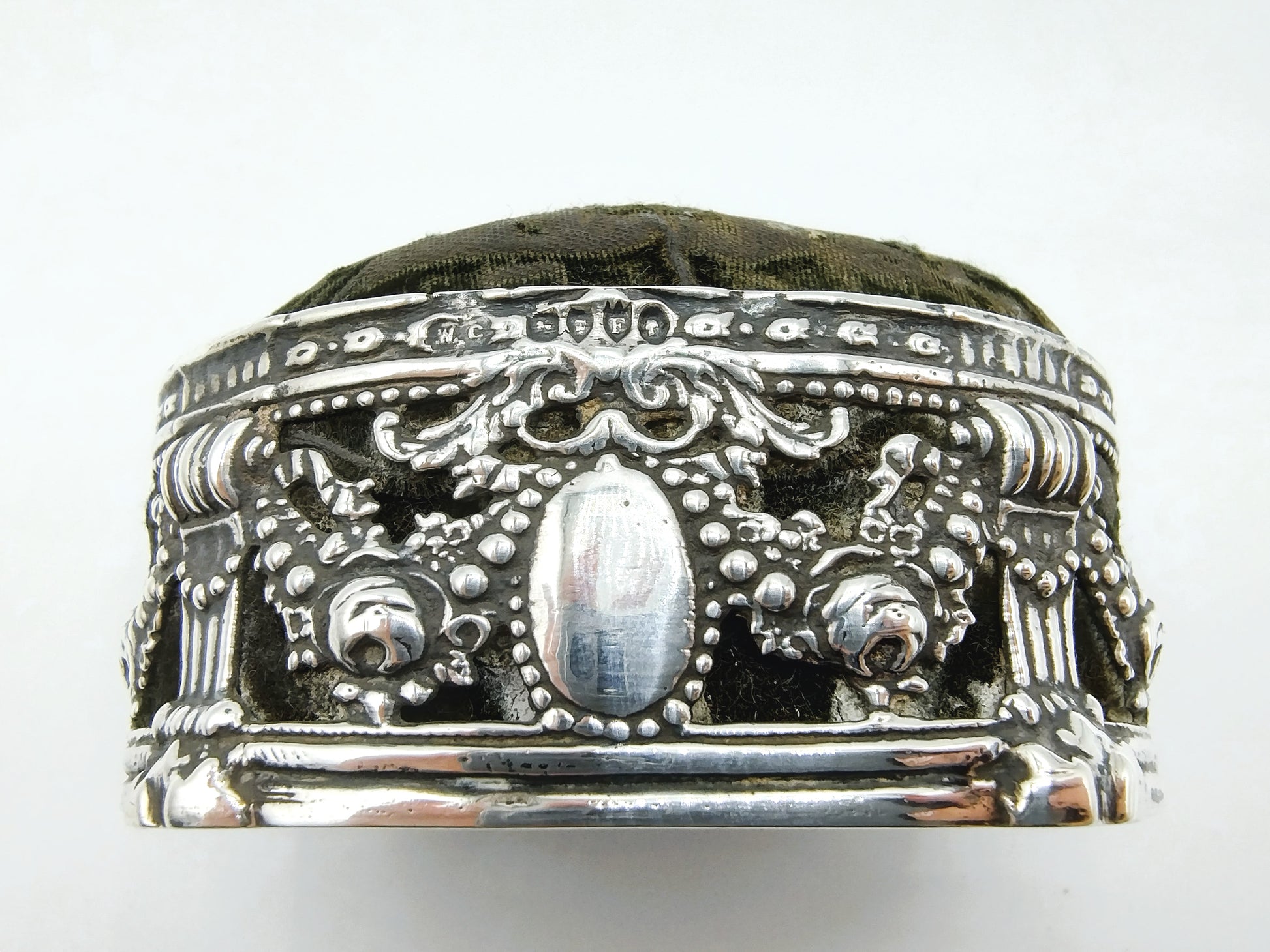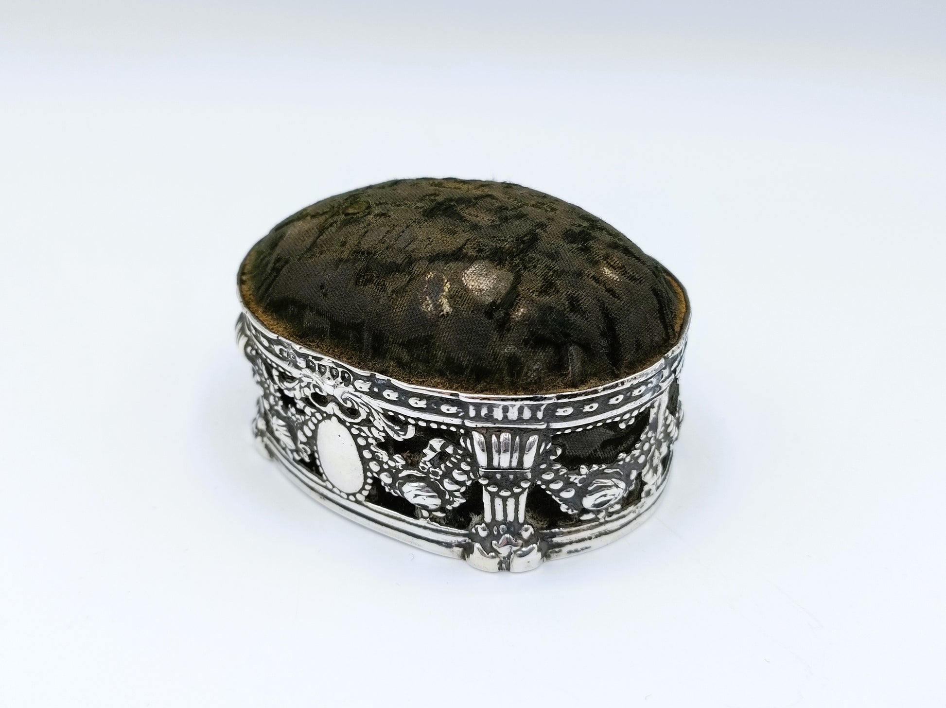 Speldenkussen in een ovale vorm. Gemaakt door de zilversmid William Comyns uit Londen in 1880. Deze zilversmid was werkzaam vanaf 1859.