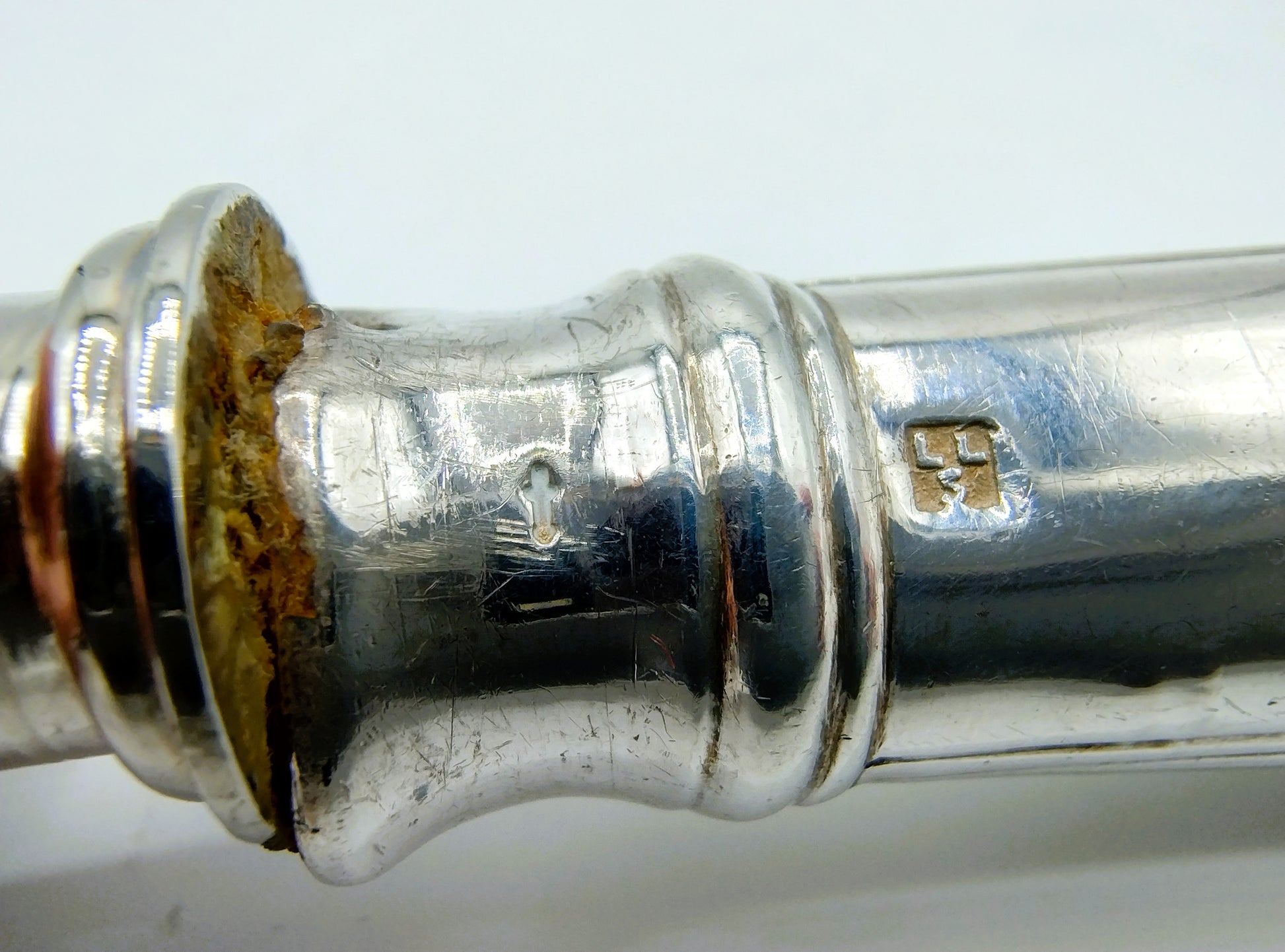 Het heft is gekeurd met meesterkeur LL5 en het zwaardje voor 2e gehalte zilver.