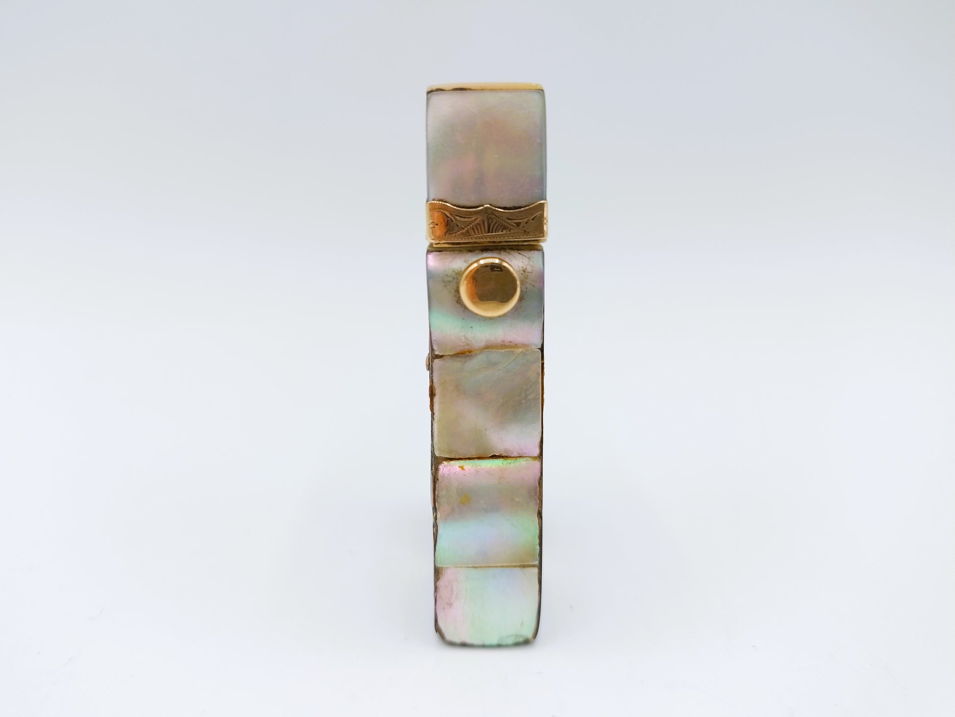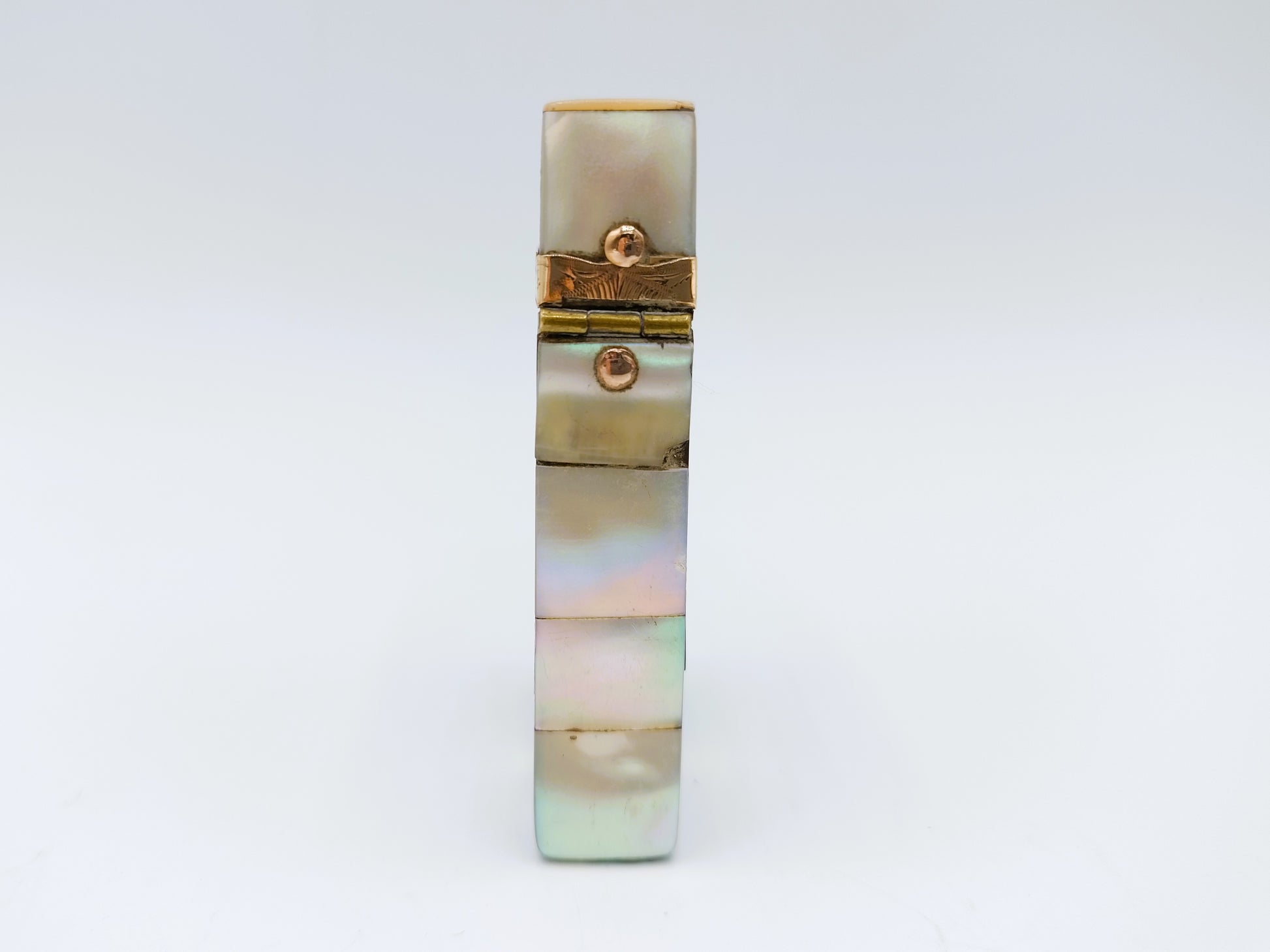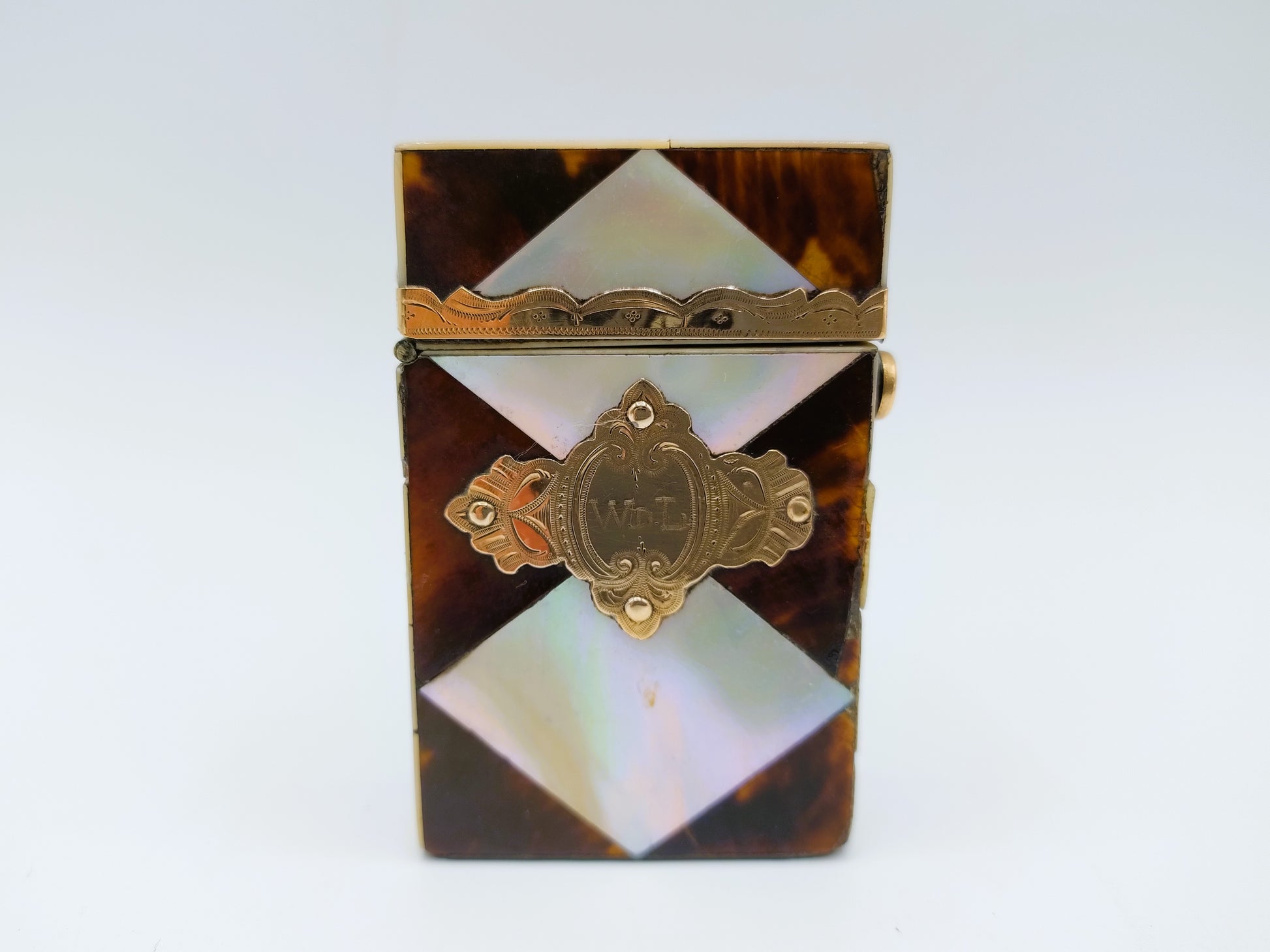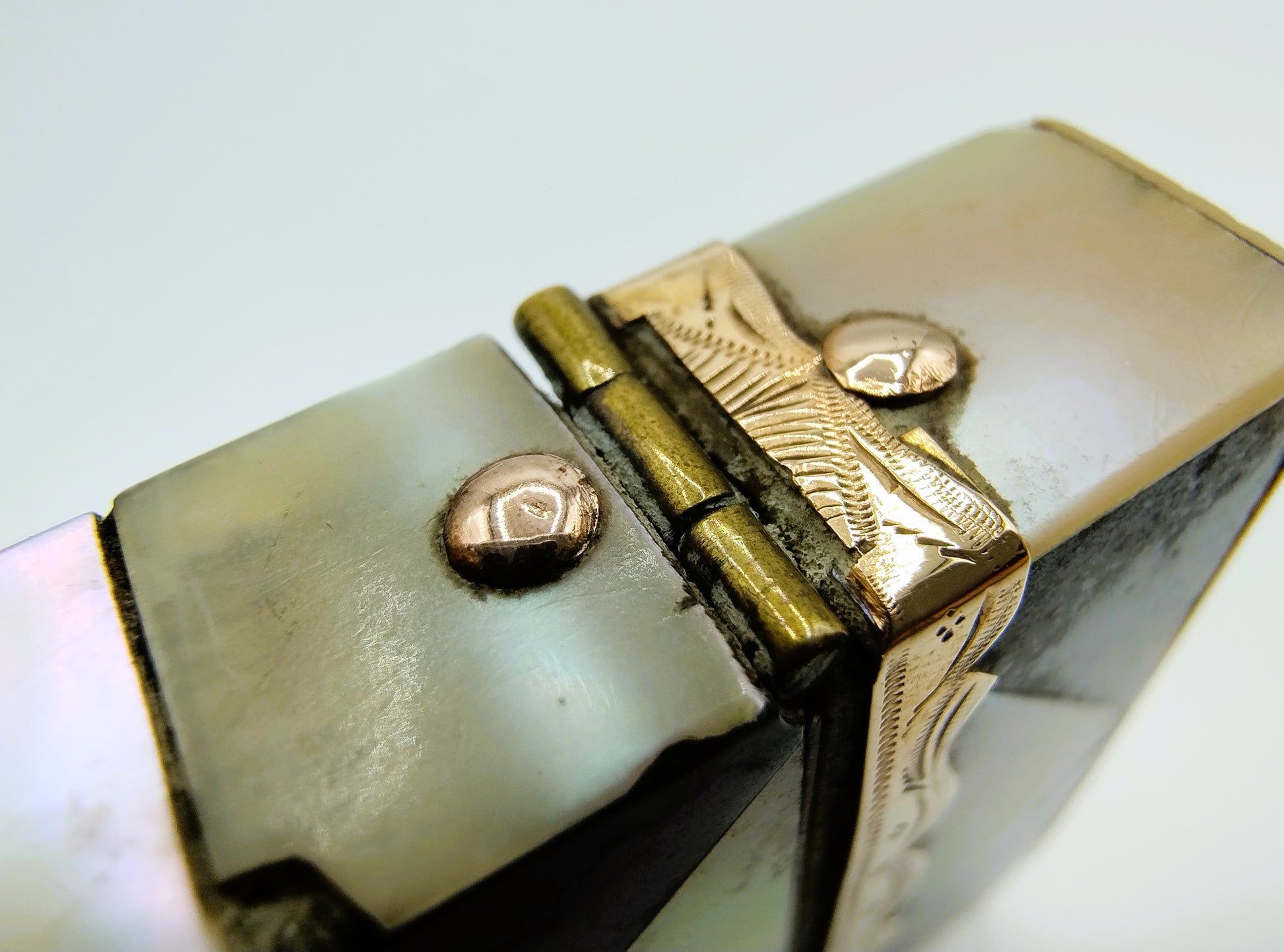 Antieke tondeldoos ingelegd met parelmoer en schildpad. Rondom voorzien van gouden beslag.