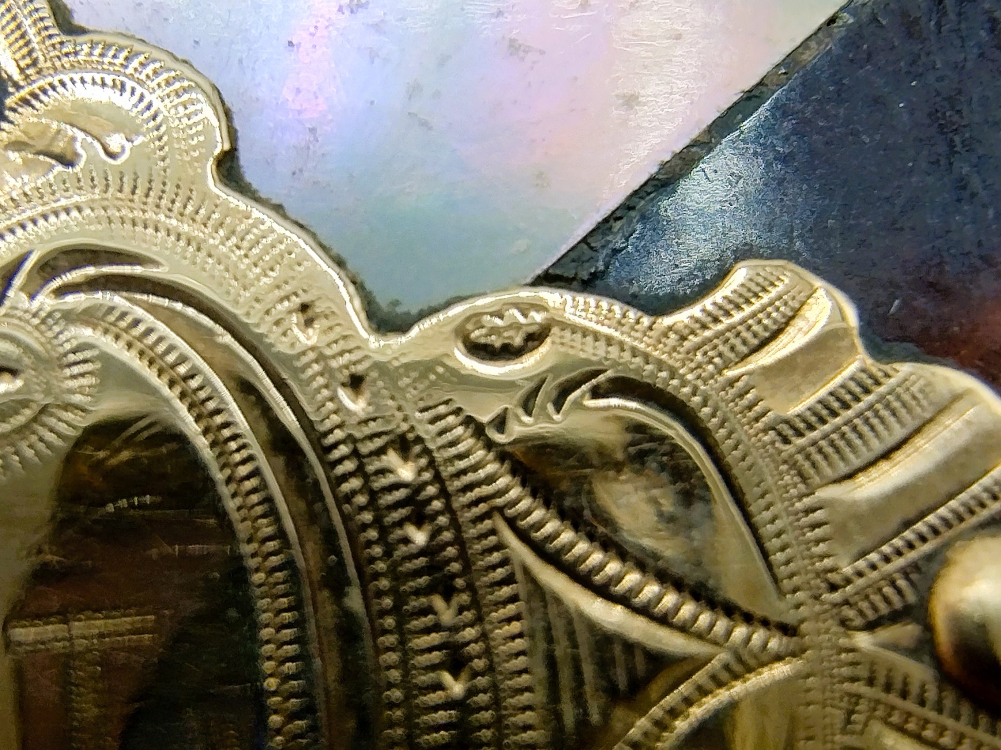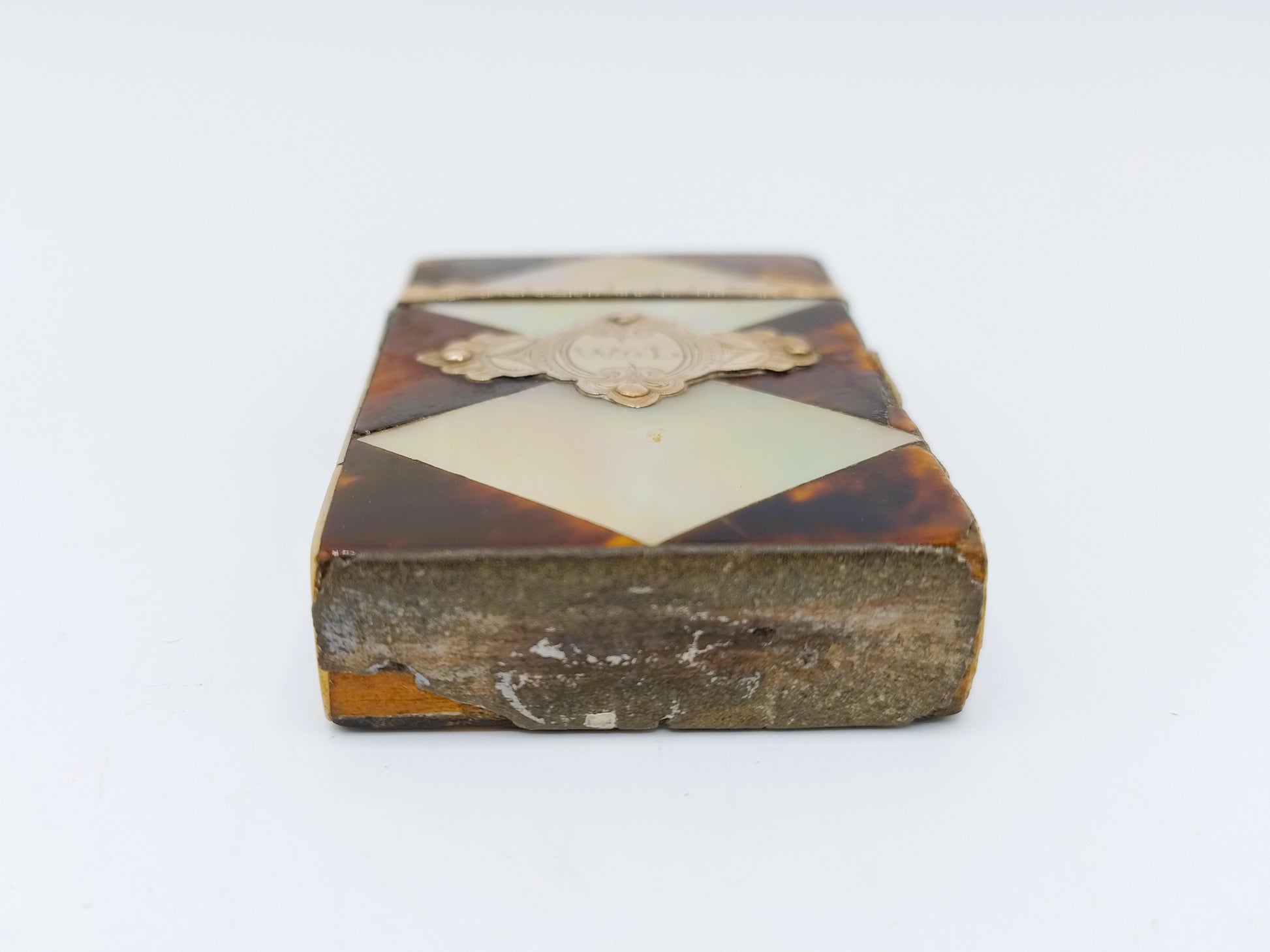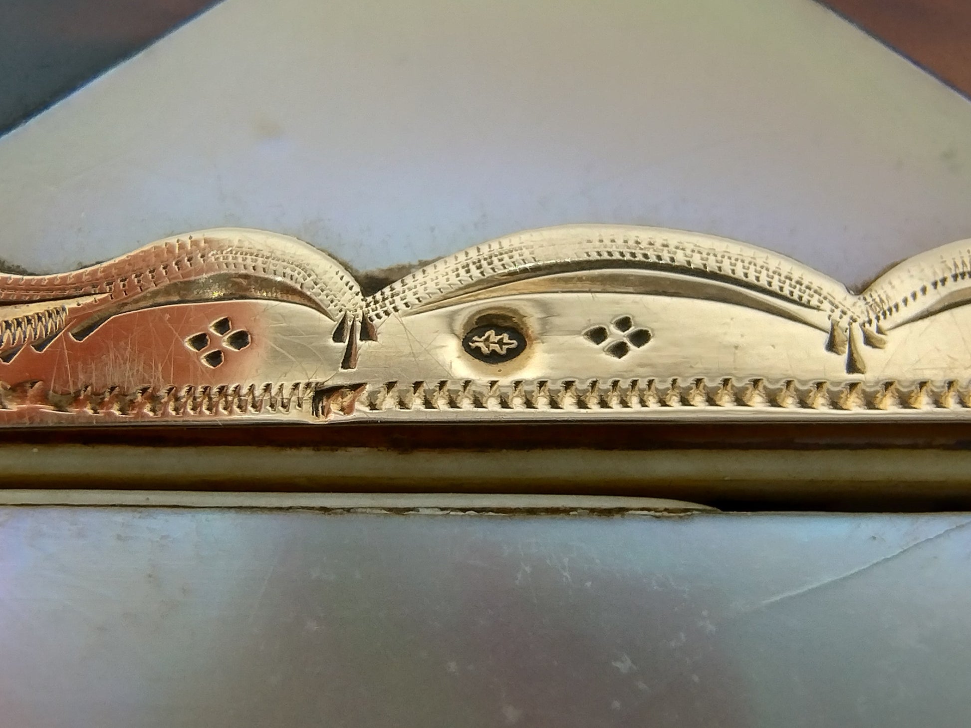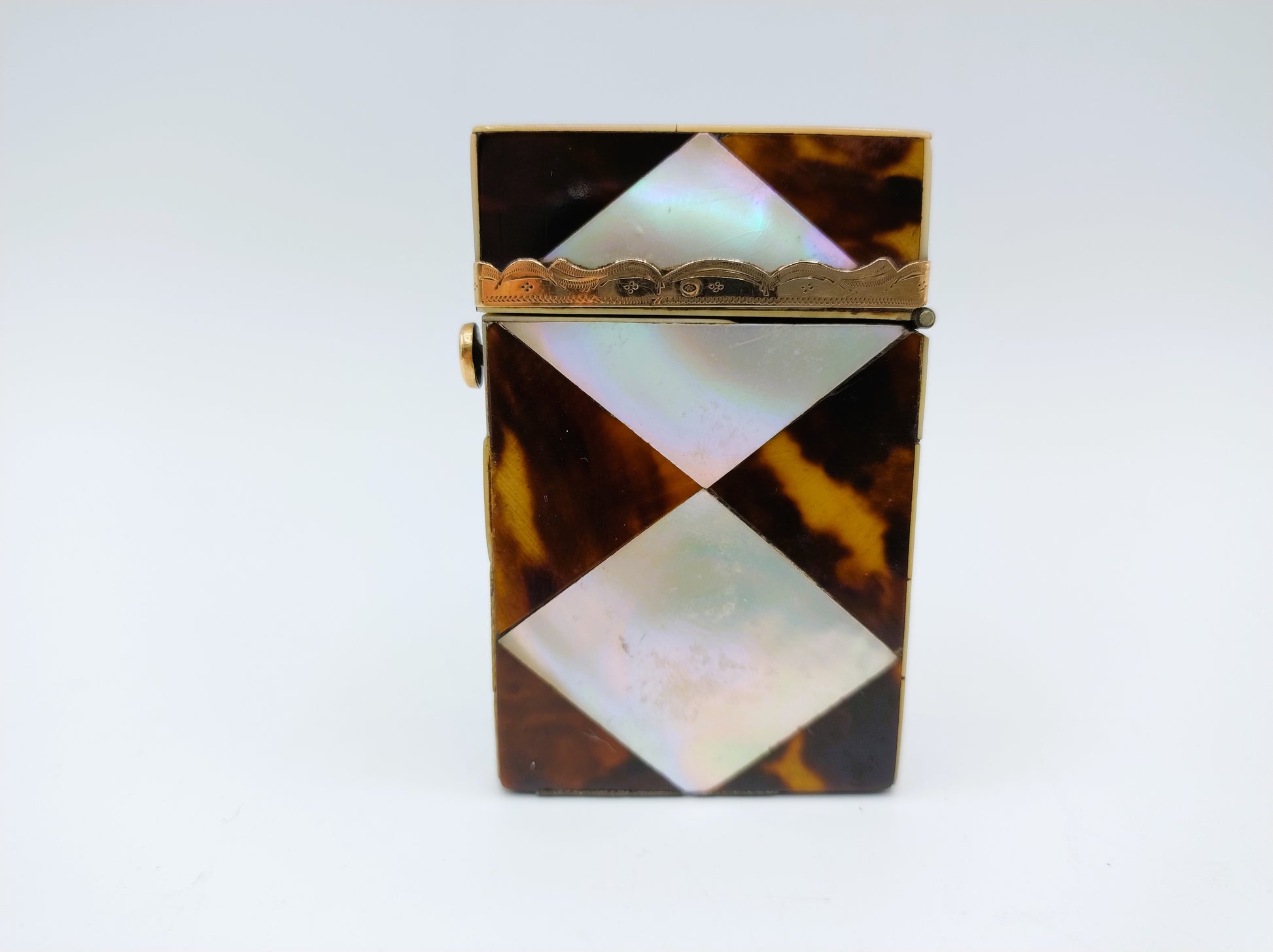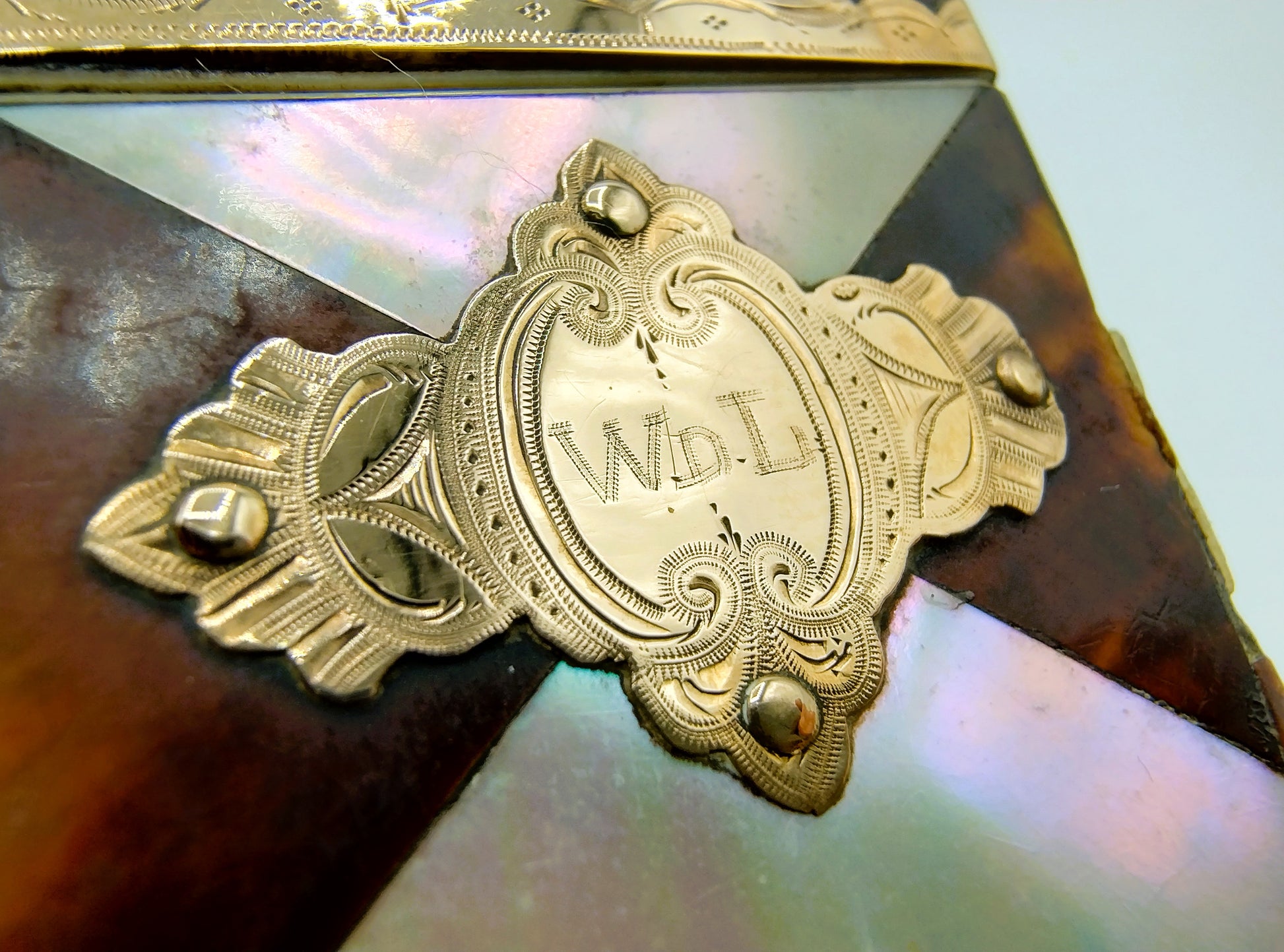 Tondeldoos ingelegd met parelmoer en schildpad met gouden beslag. 19e eeuws