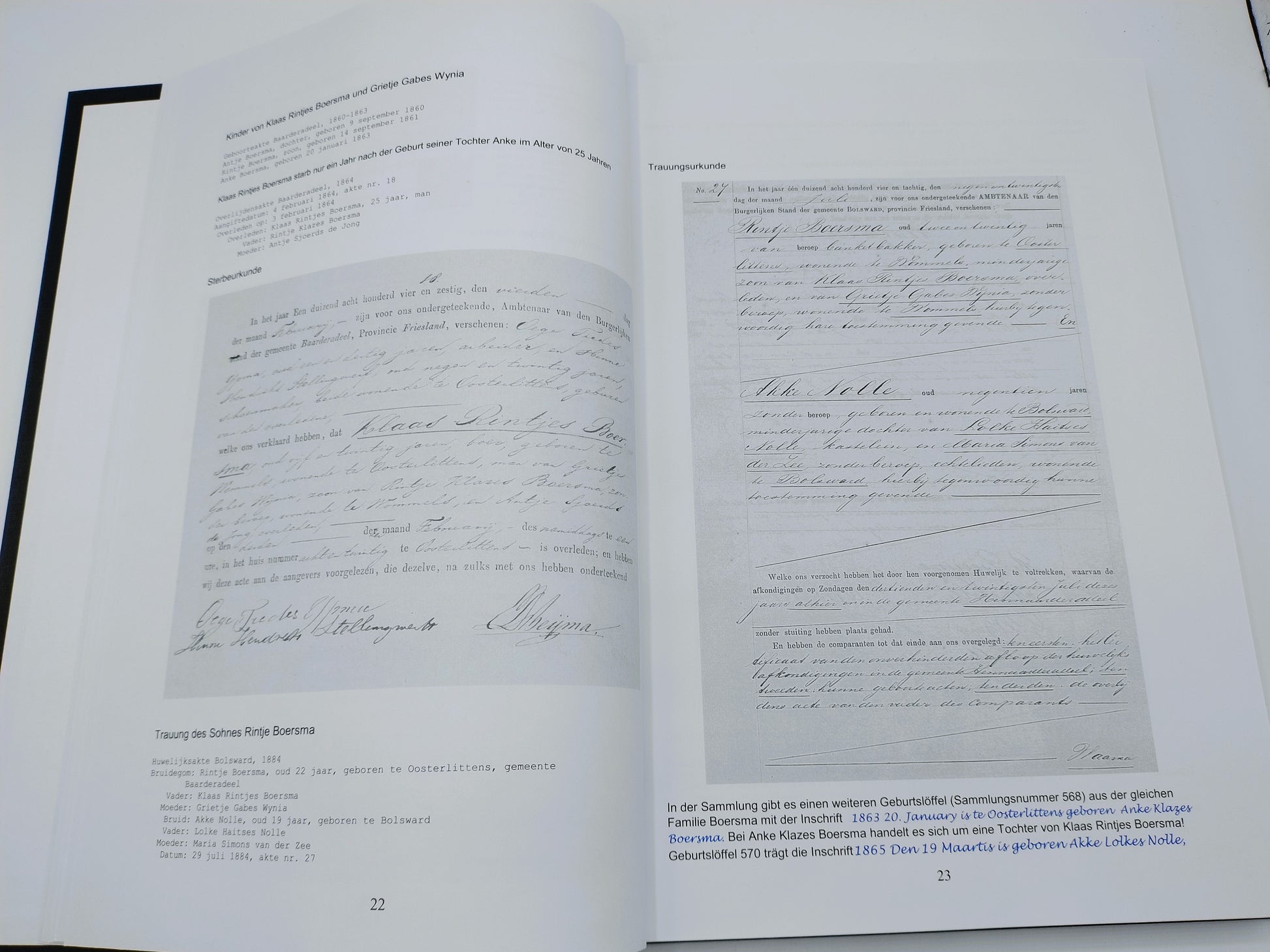 Elke lepel vertelt immers een verhaal van de eigenaar? De ouders, doopdatum, trouwdatum, sterfdatum alles is verzameld in het bijgeleverde boek. Inclusief de aktes als deze beschikbaar waren.