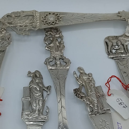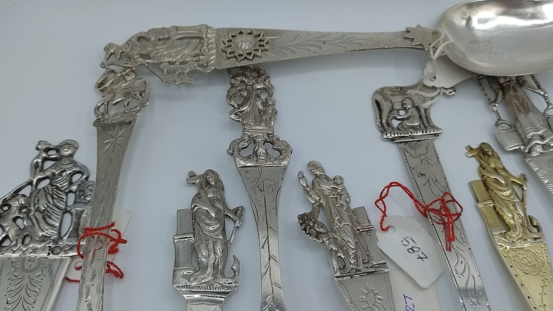 Het gaat hier uitsluitend om geboortelepels met platte stelen. De schrijver heeft ze per categorie gerangschikt. De volgende 39 lepels zitten in de collectie: