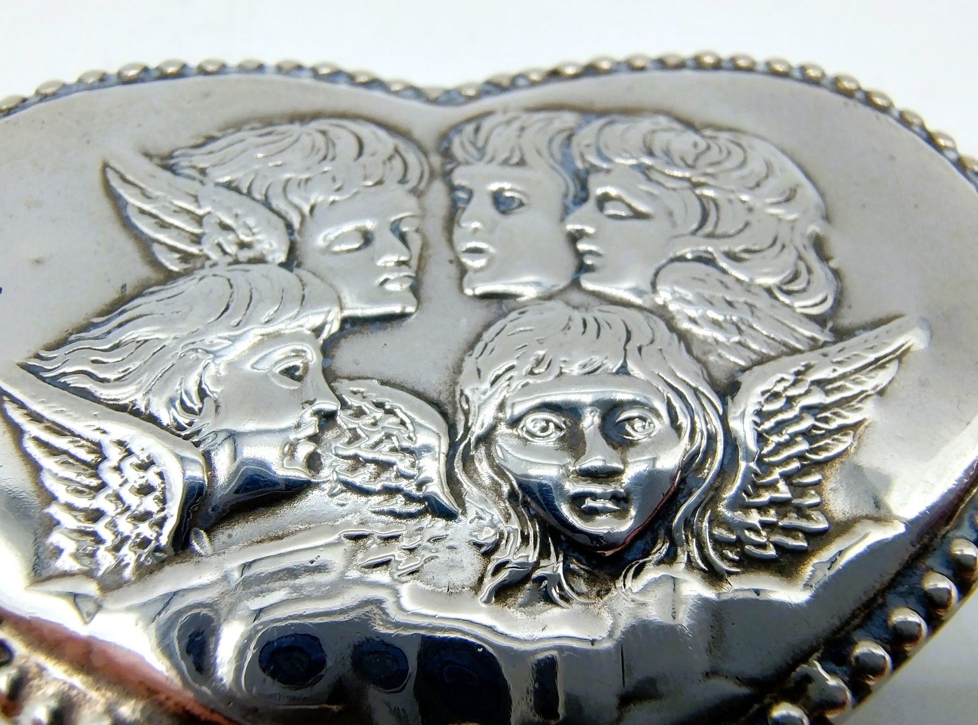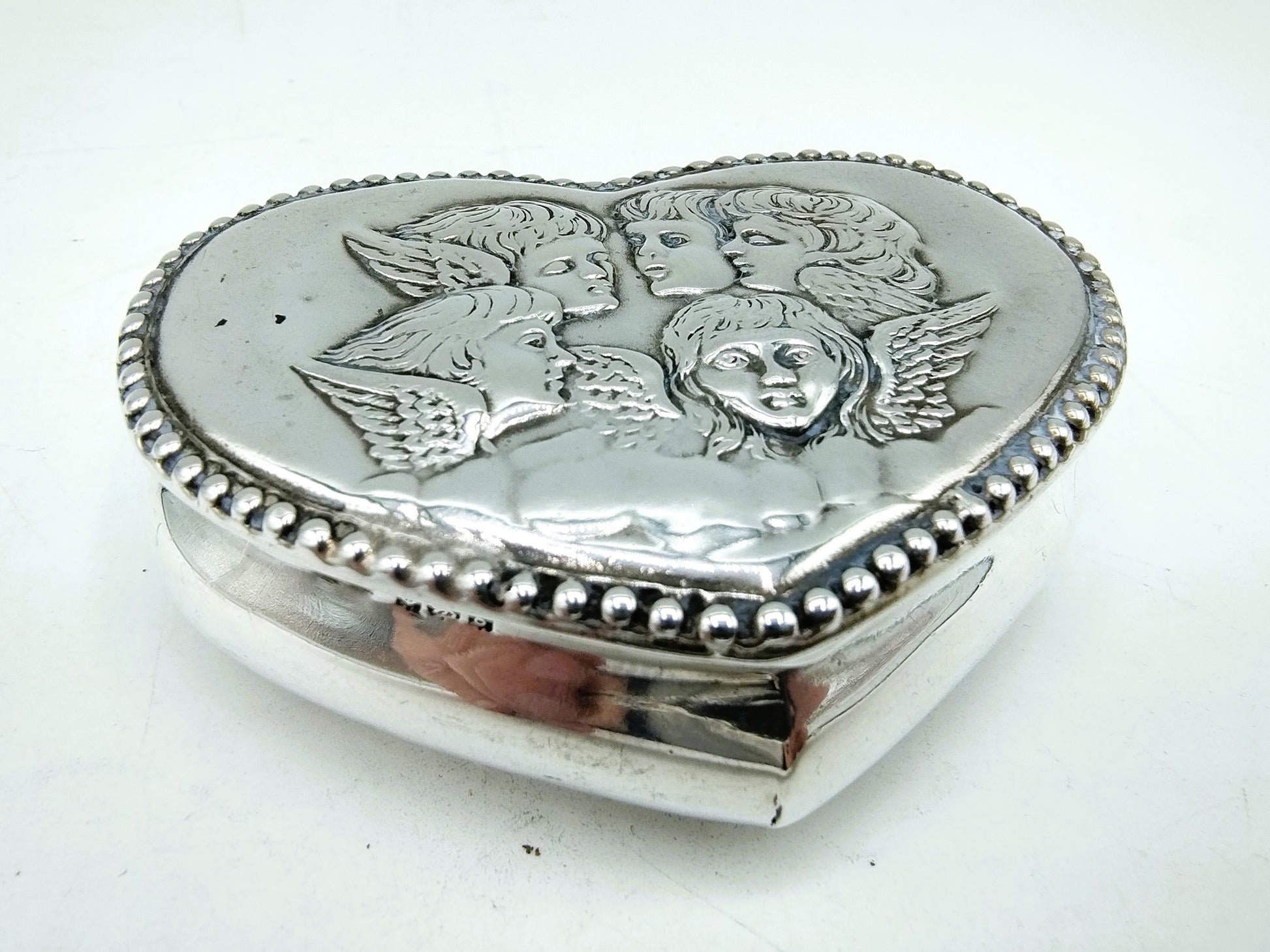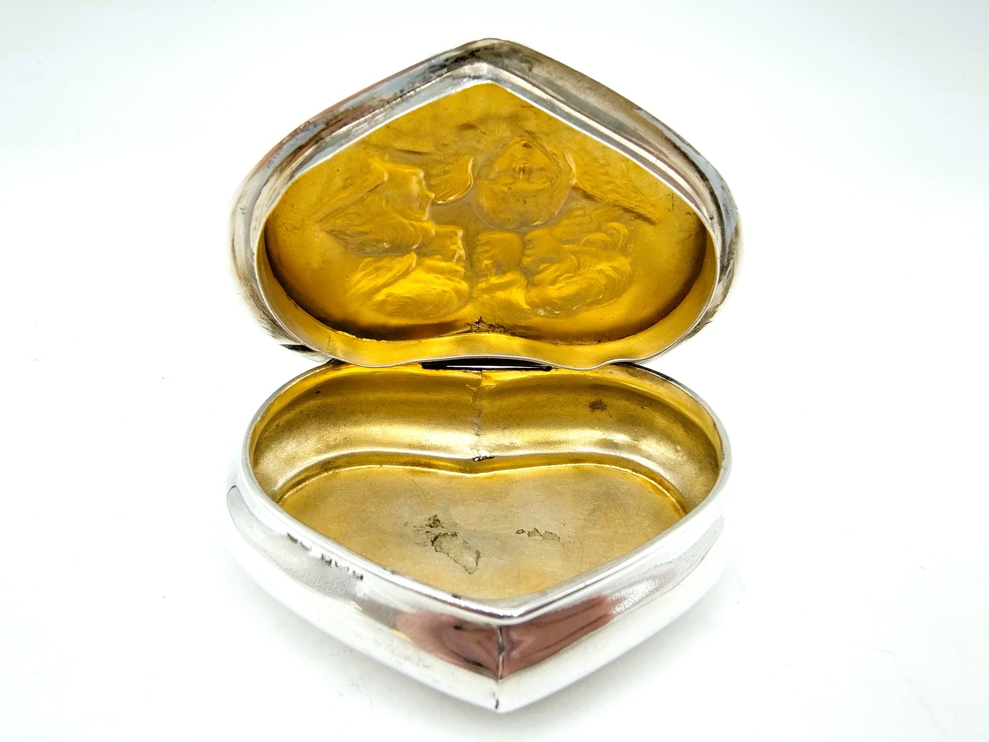 Het hartvormige pillendoosje met vergulde binnenkant, heeft als dekselversiering 3 engelen en twee manfiguren in een fraai gedreven decor.