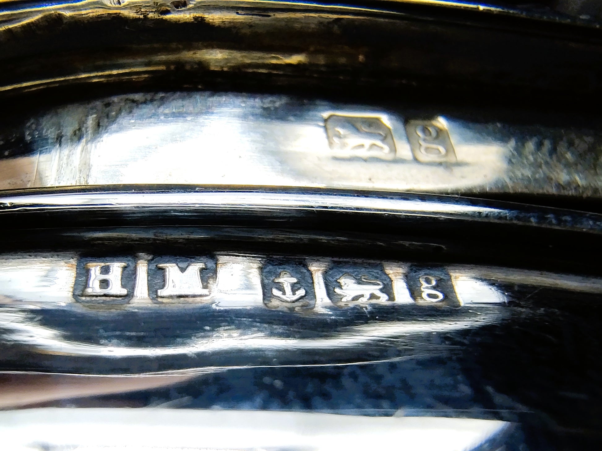 Het doosje is gekeurd met meesterkeur: HM, stadskeur anker van Birmingham, lopende leeuw voor sterling zilver en jaarletter g voor 1906.