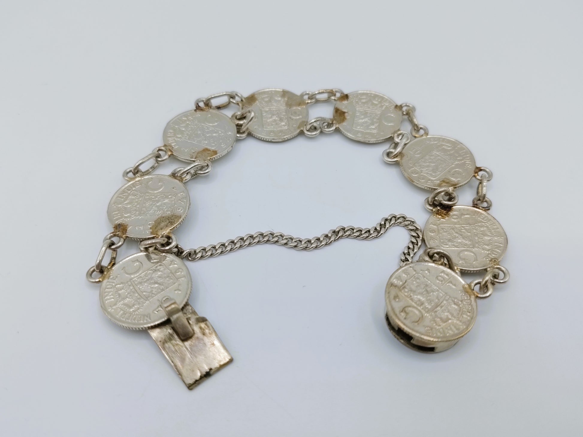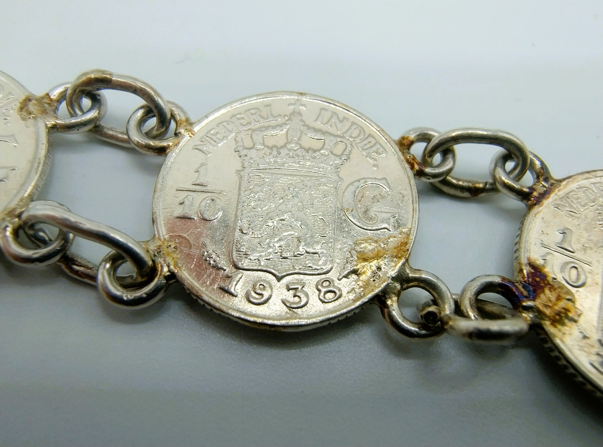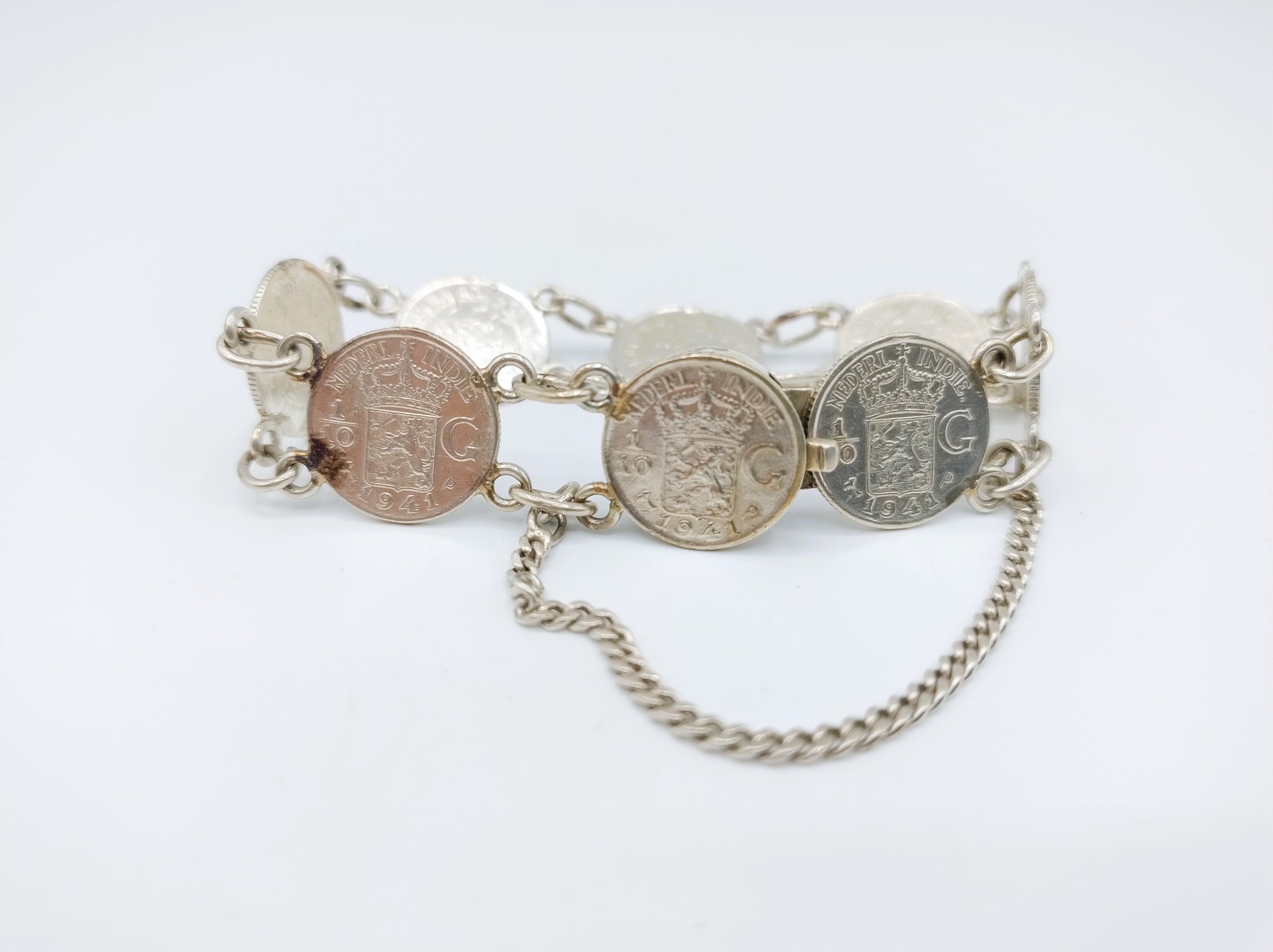 Zilveren armband gemaakt van 8 munten van 1/10 gulden uit Nederlands Indië.