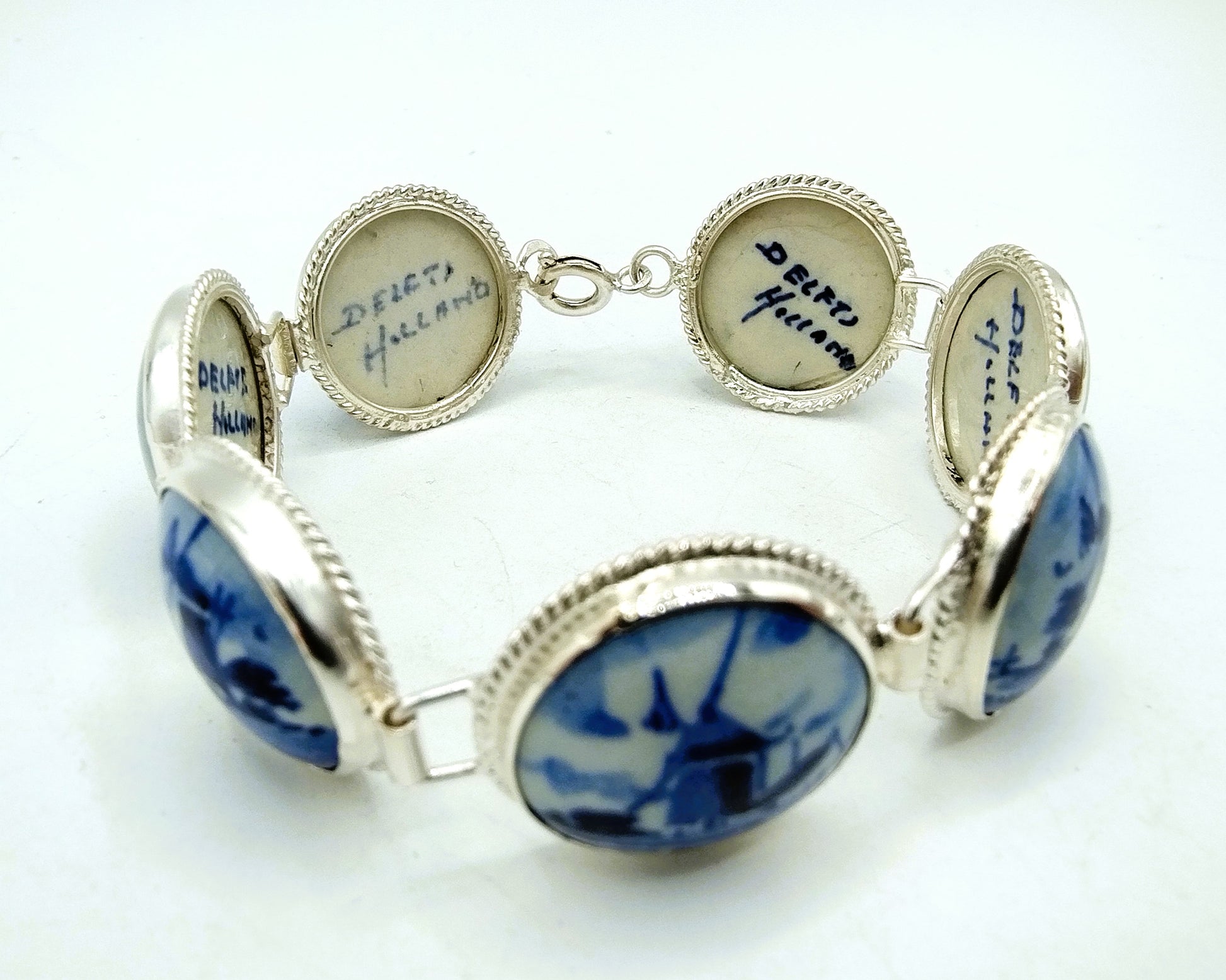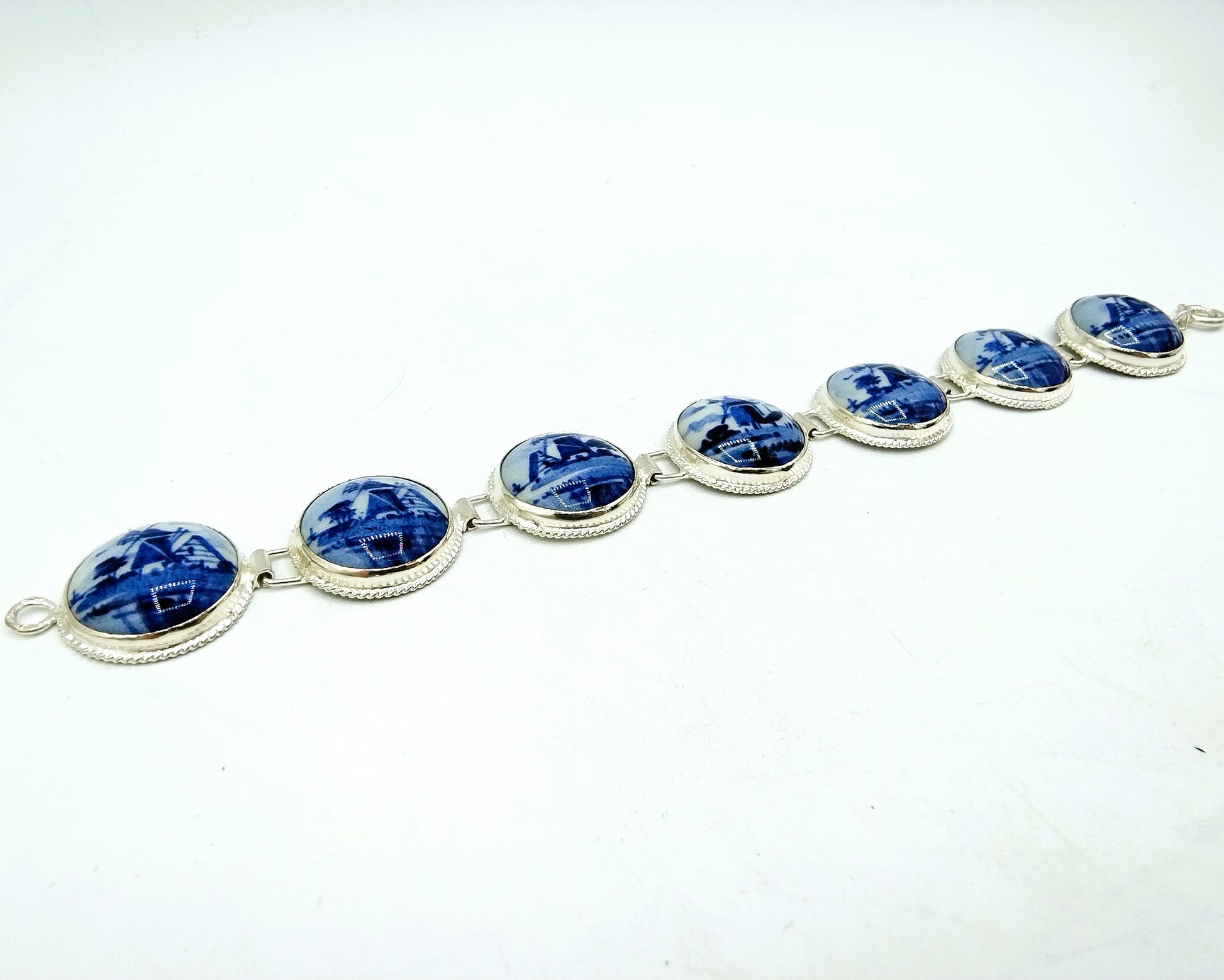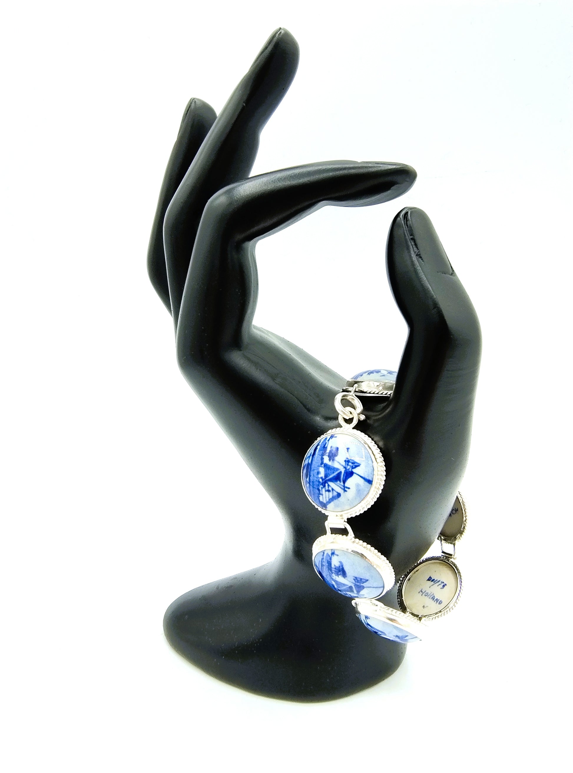 Zilveren armband met 5 Delfts blauwe keramieken afbeeldingen van een molen. Deze afbeeldingen zijn gezet in een gladde kast.