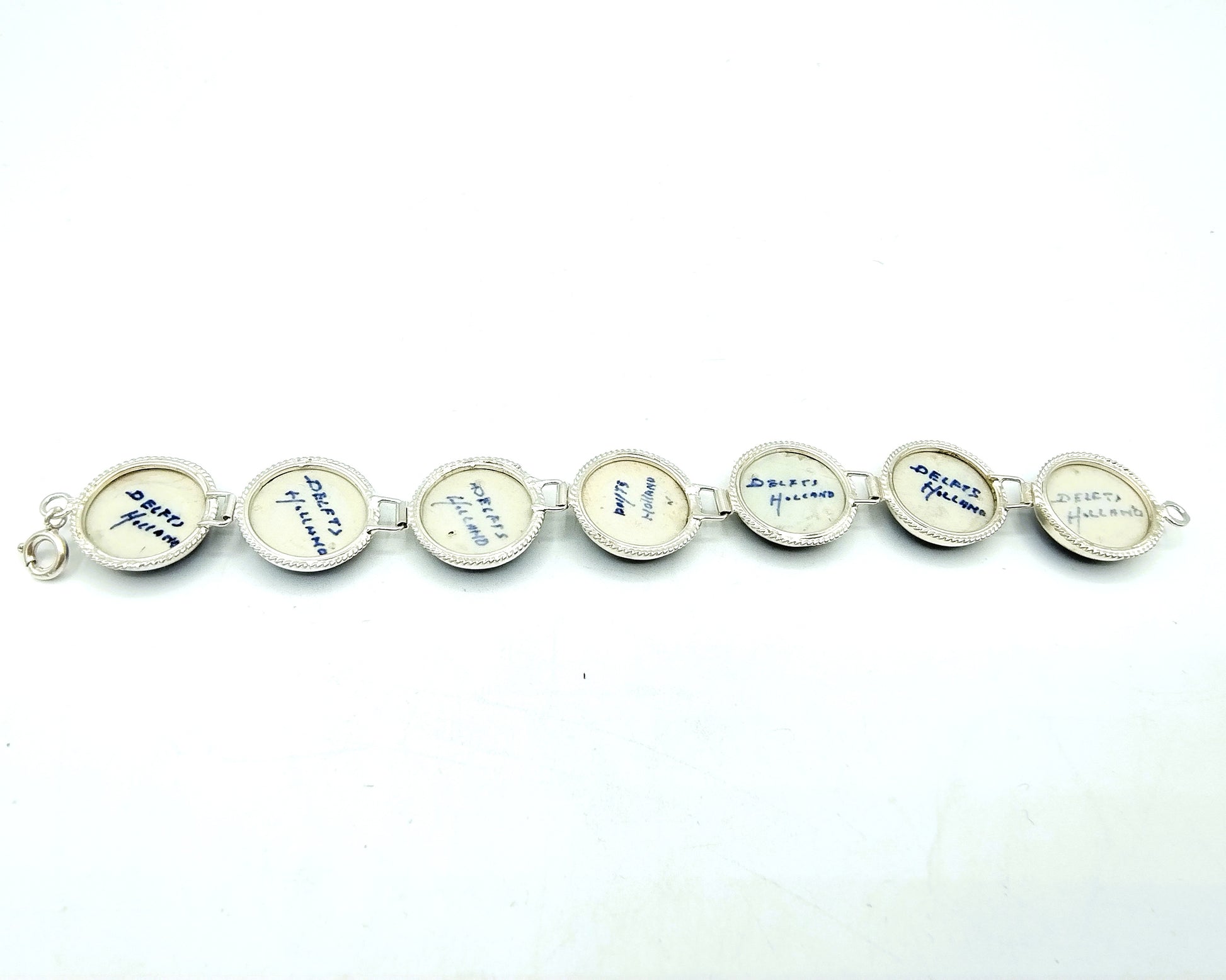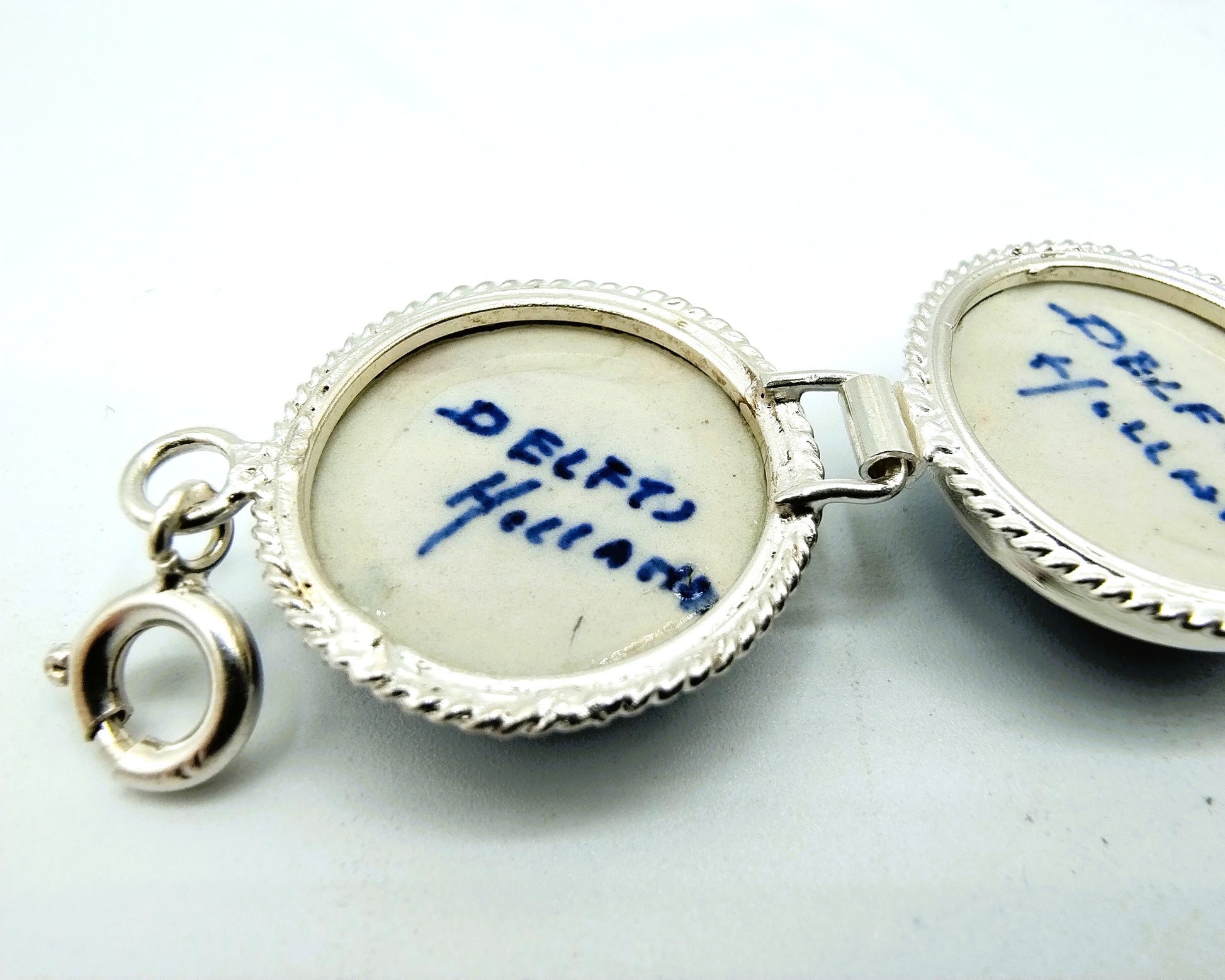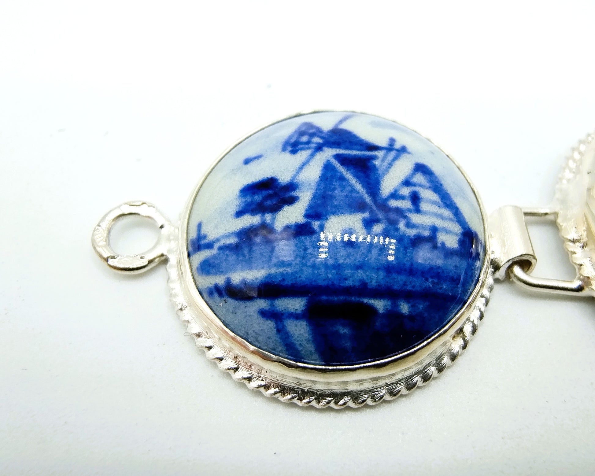Zilveren armband met 5 Delfts blauwe keramieken afbeeldingen van een molen. Deze afbeeldingen zijn gezet in een gladde kast.
