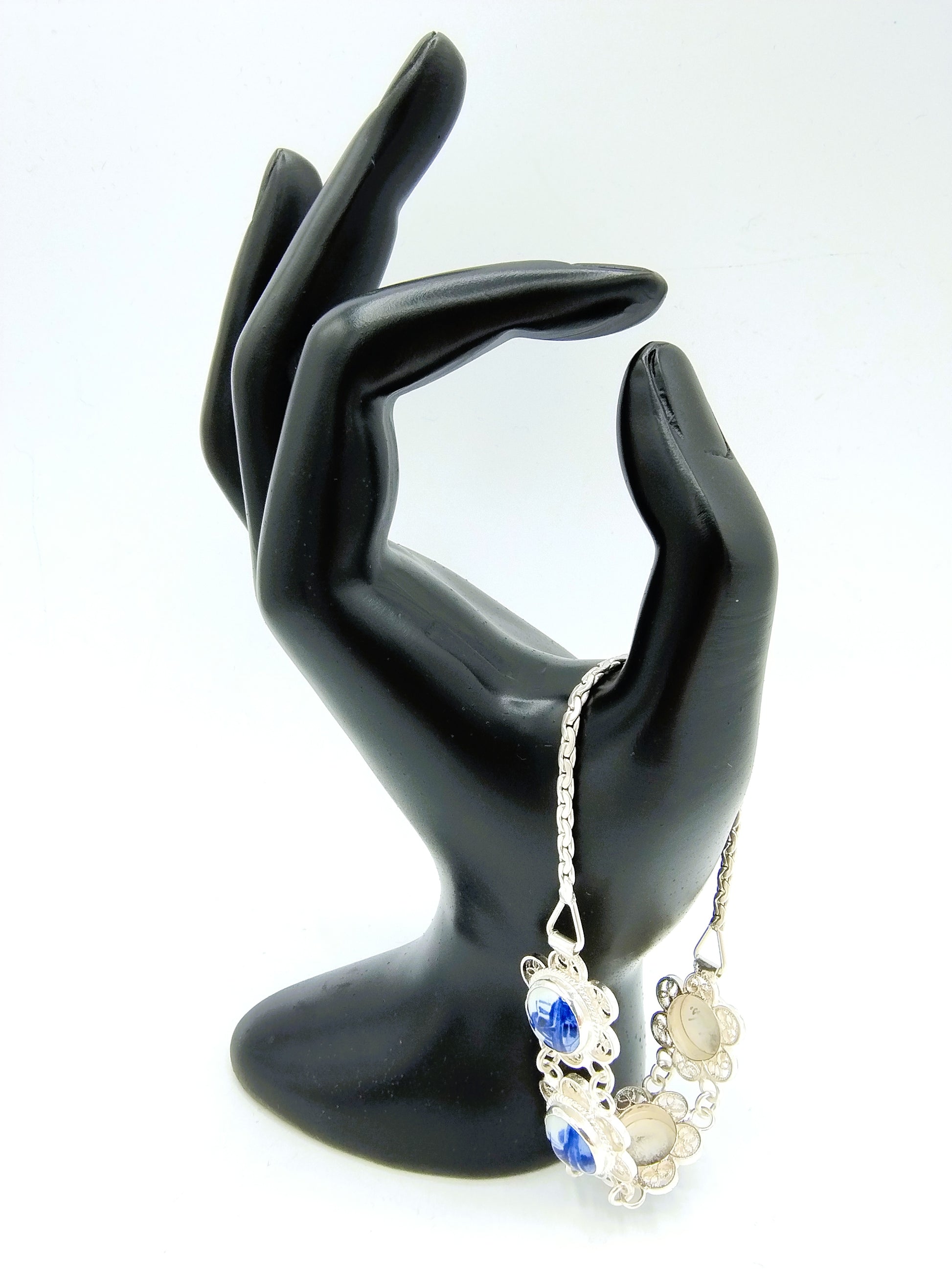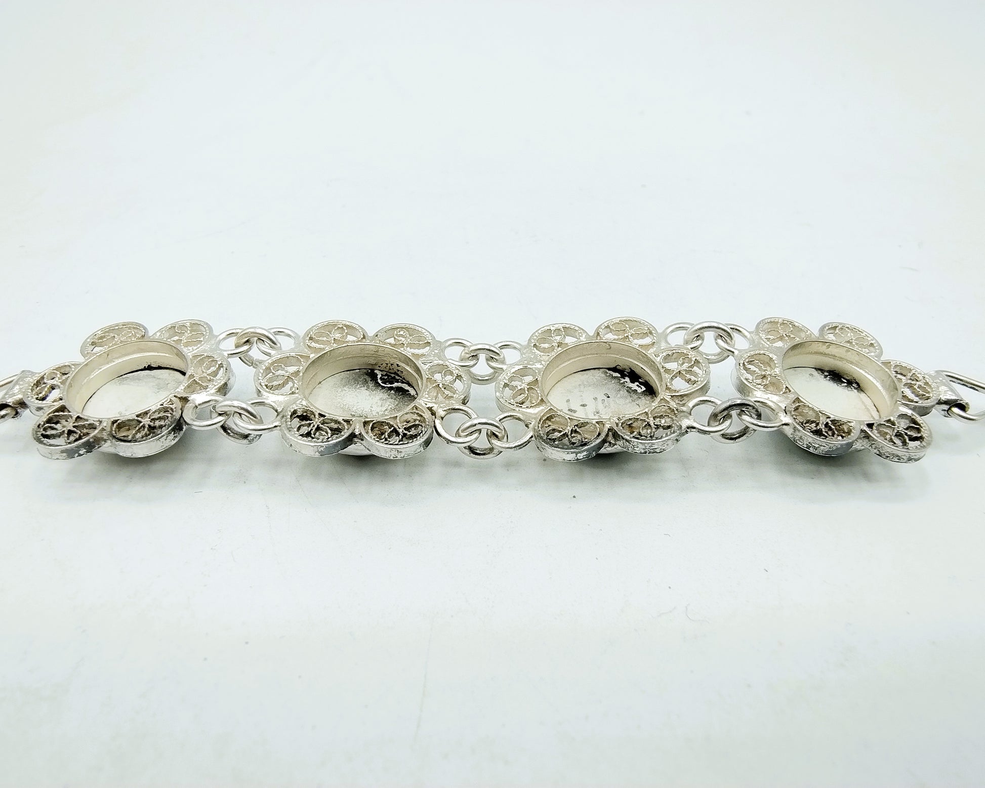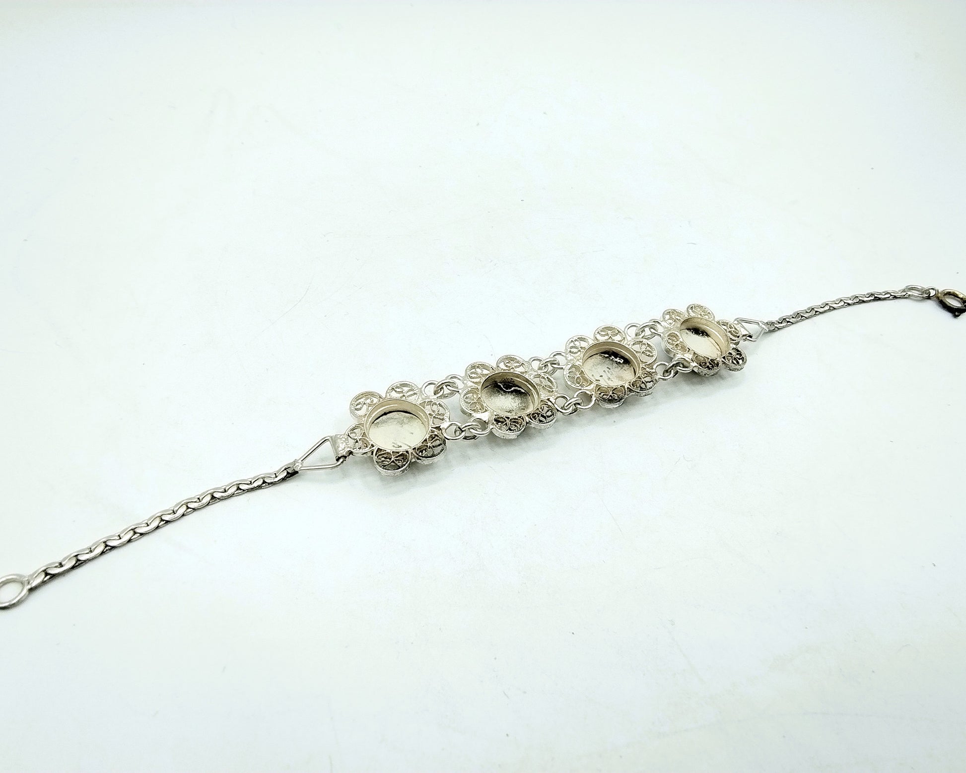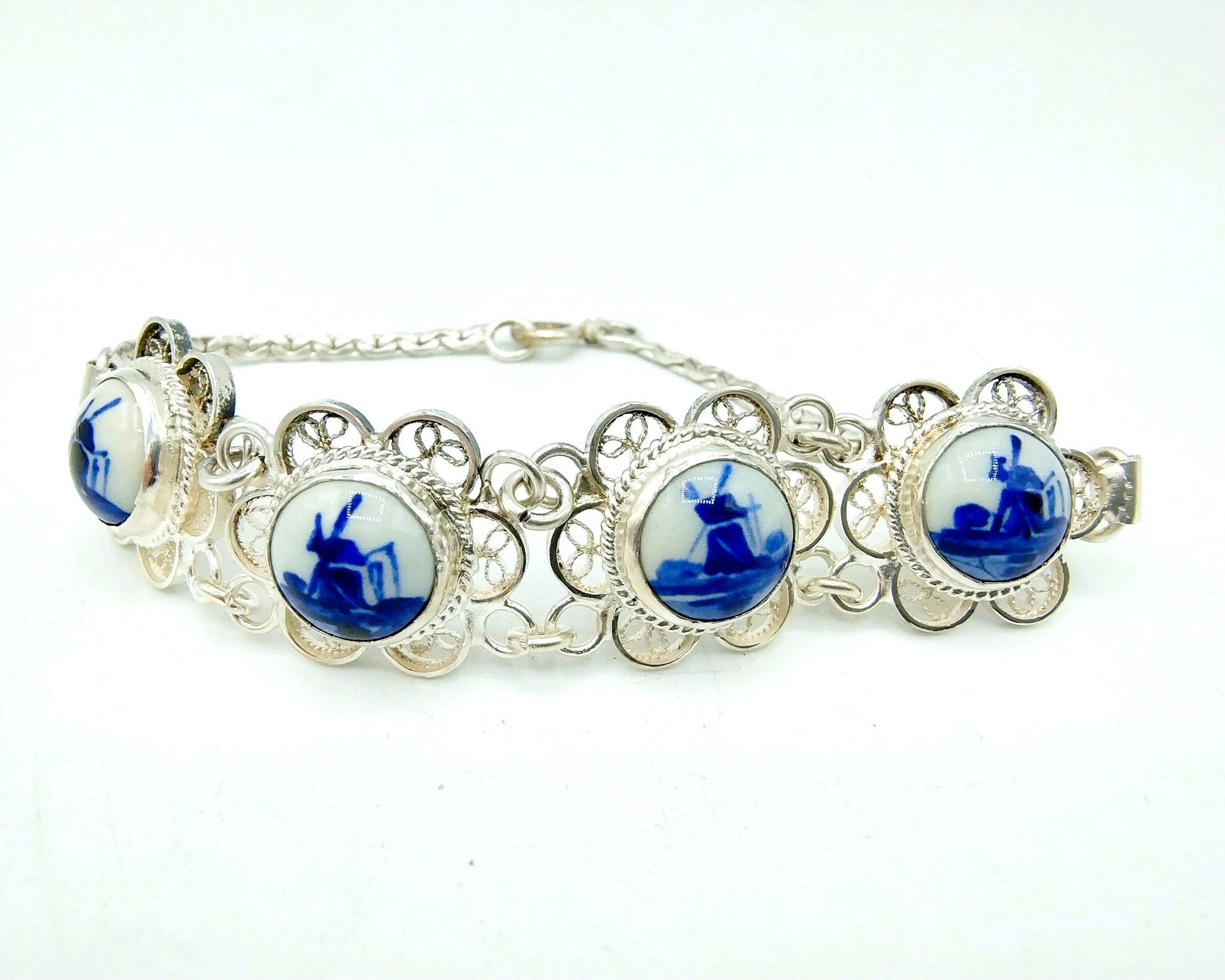 Zilveren armband met 4 Delfts blauwe keramieken afbeeldingen van een molen. Deze afbeeldingen zijn gezet in een gladde kast en voorzien van filigrain zilversmeedwerk.