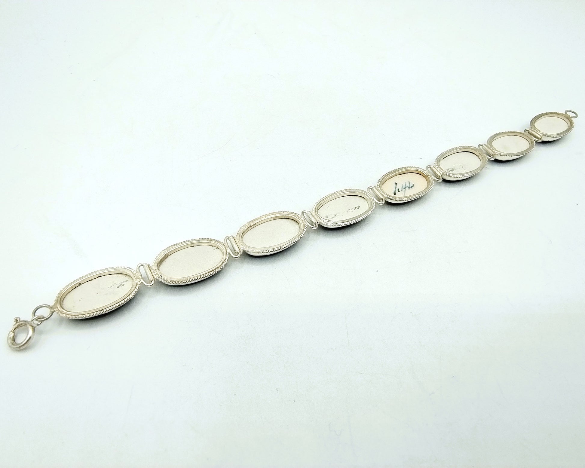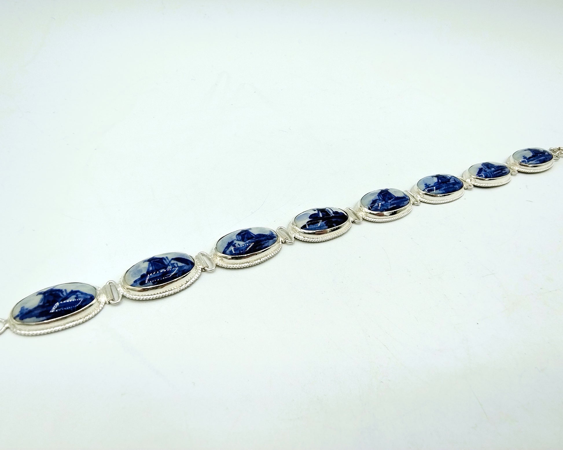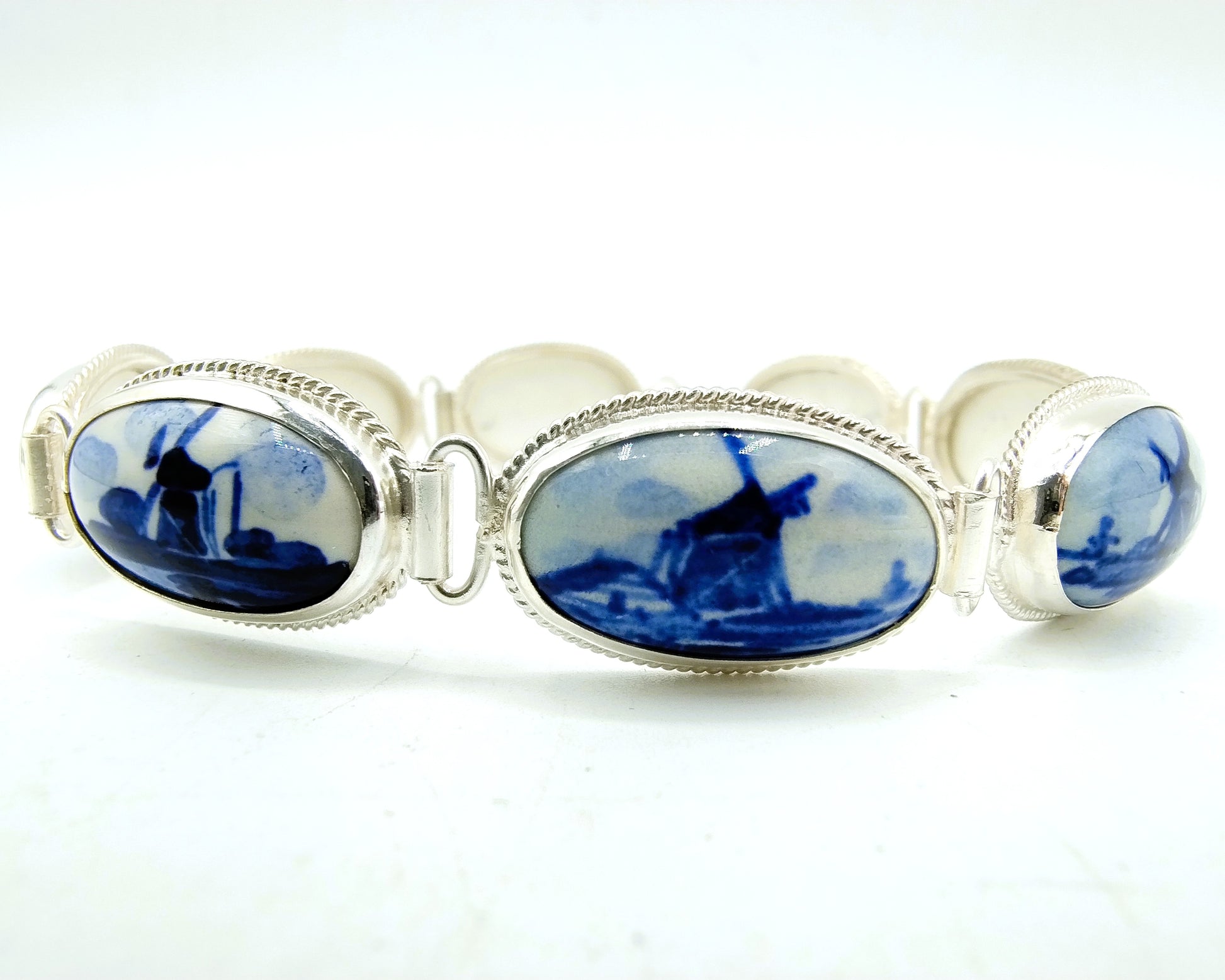 Zilveren armband met 8 Delfts blauwe keramieken afbeeldingen van een molen. Deze afbeeldingen zijn gezet in een gladde kast.