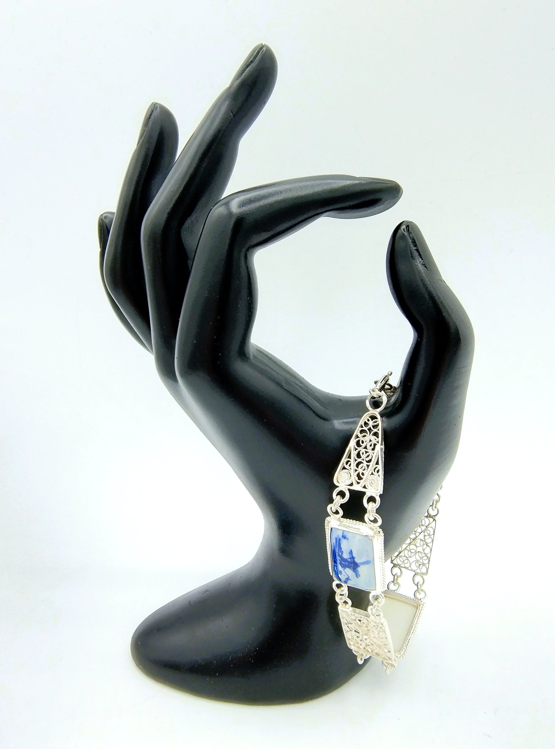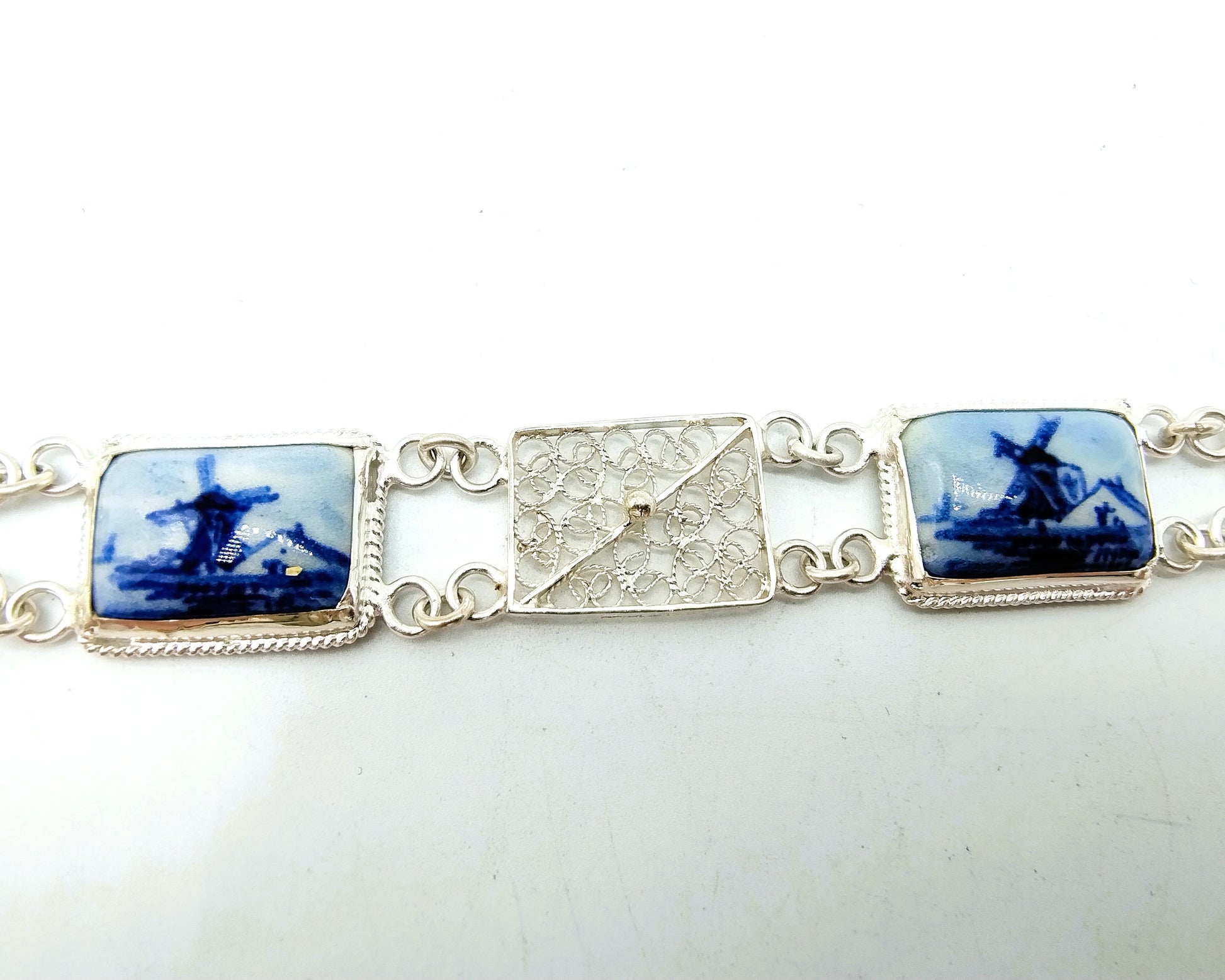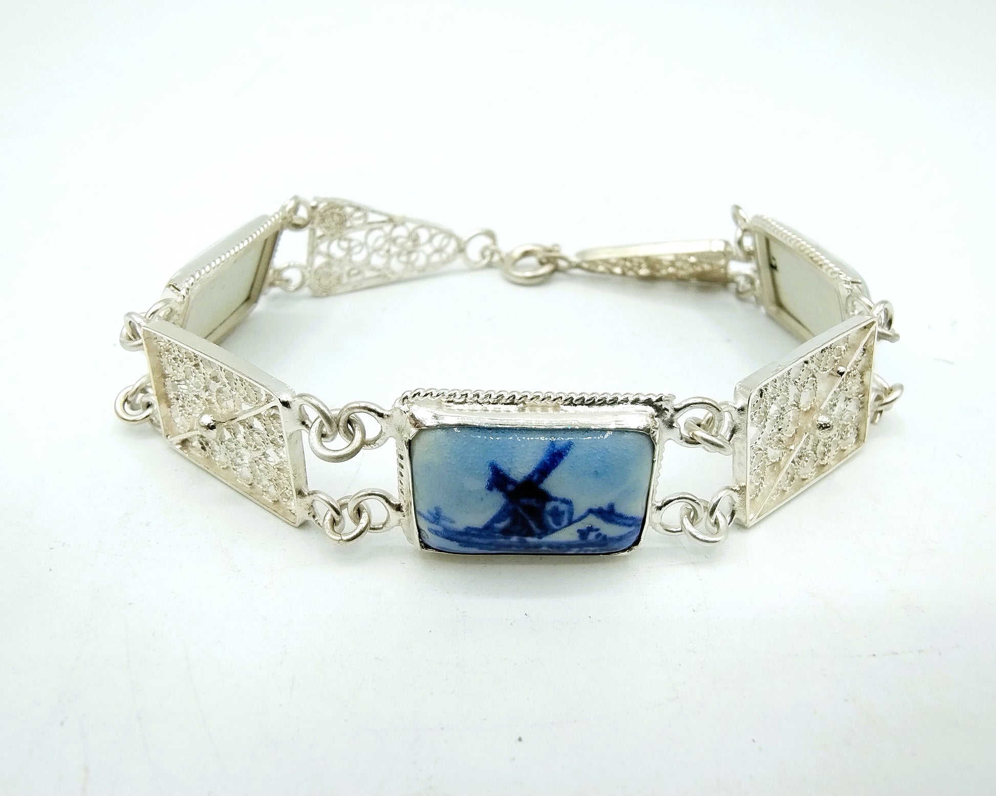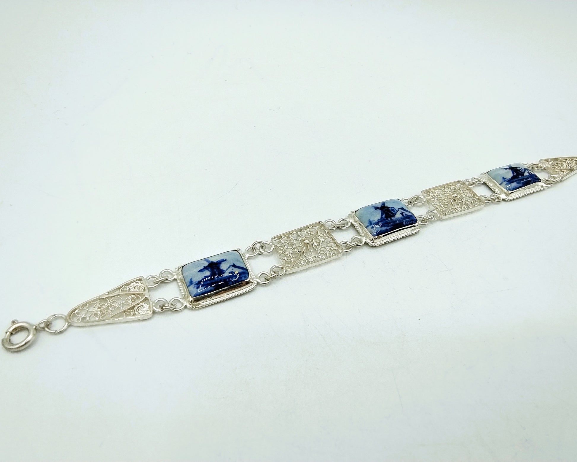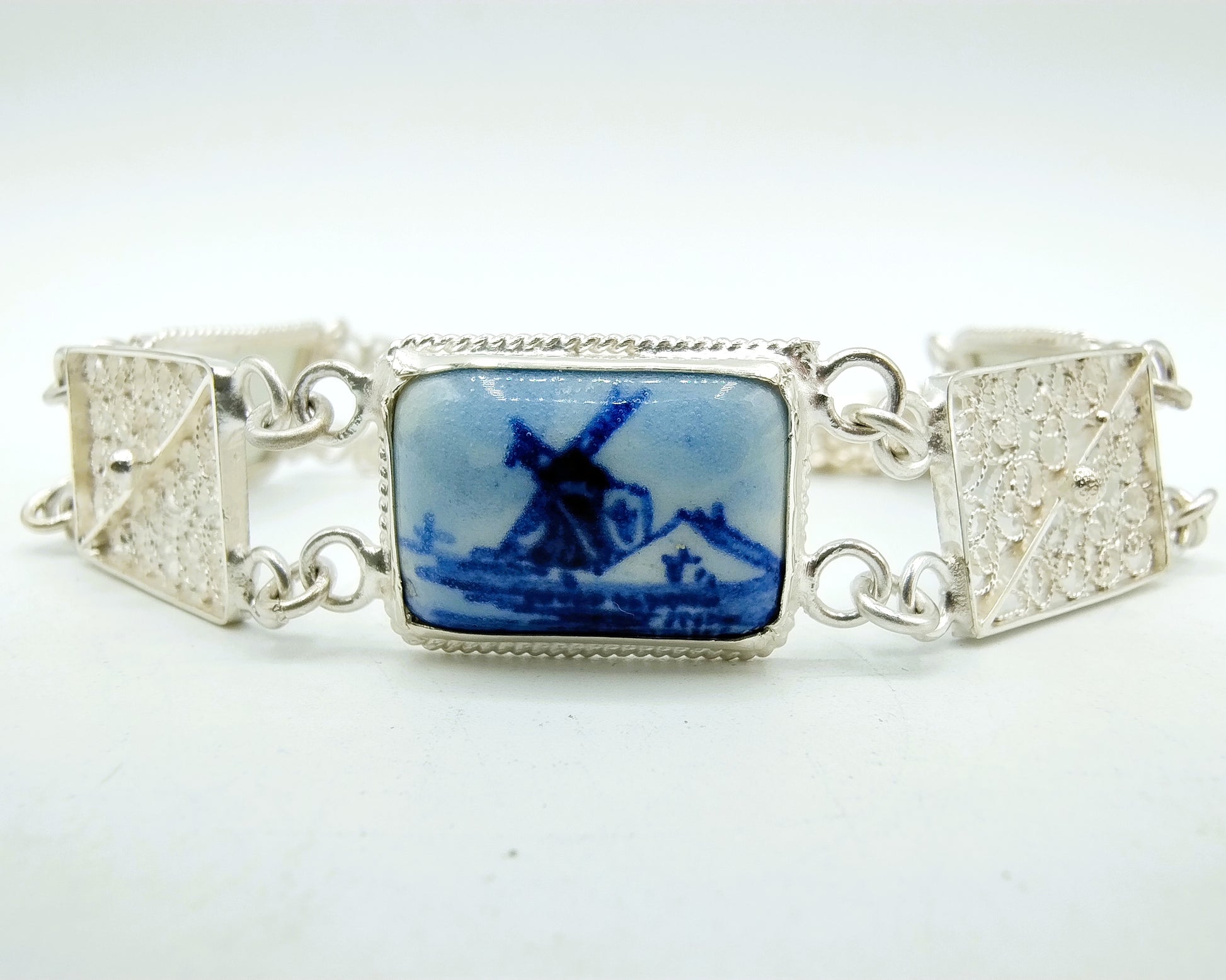 Zilveren armband met 3 Delfts blauwe keramieken afbeeldingen van een molen. Deze afbeeldingen zijn gezet in een gladde kast en aan beide kanten van de armband voorzien van filigrain zilversmeedwerk.
