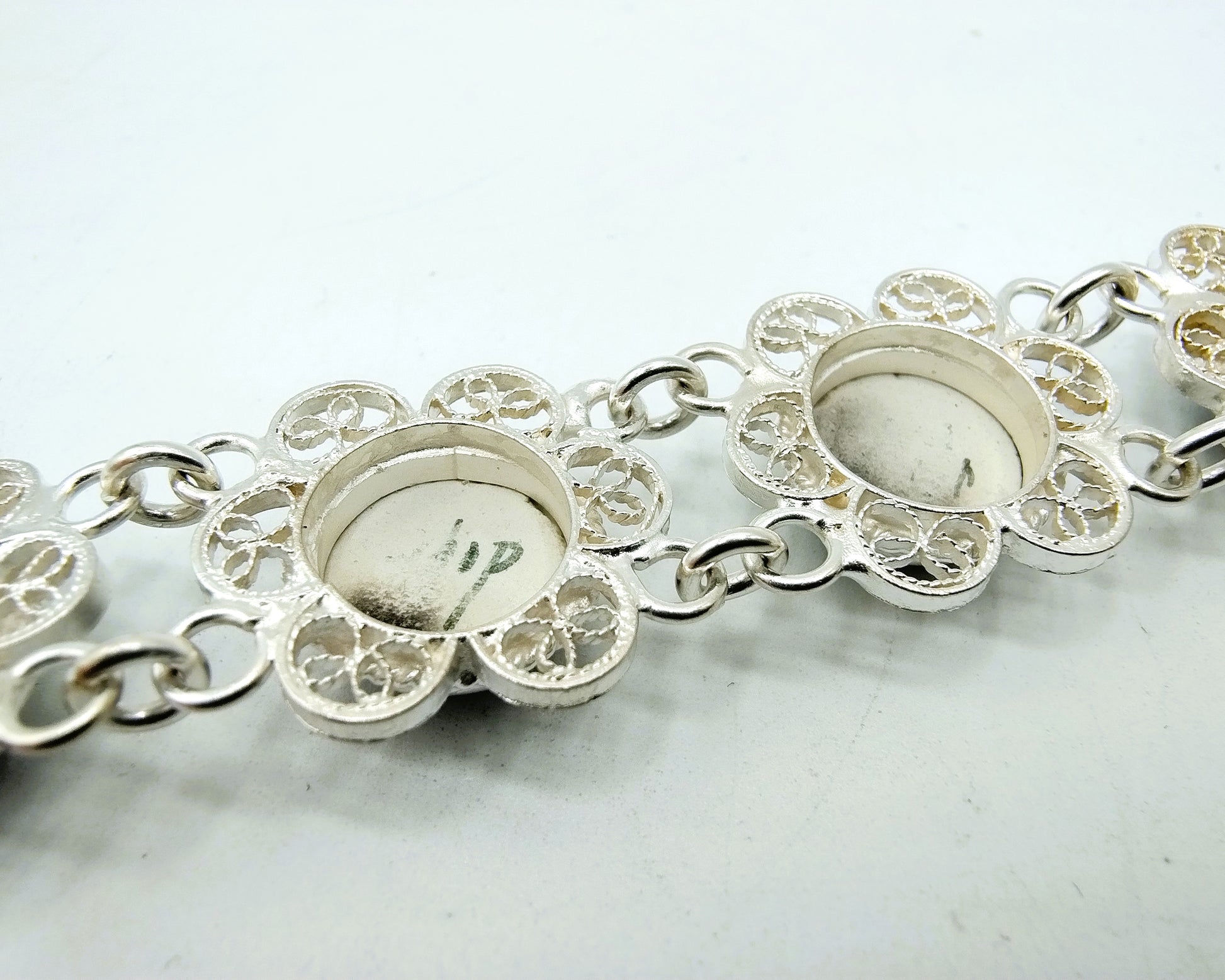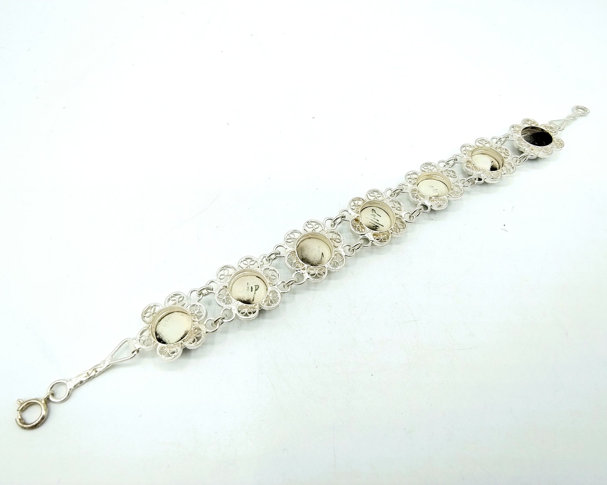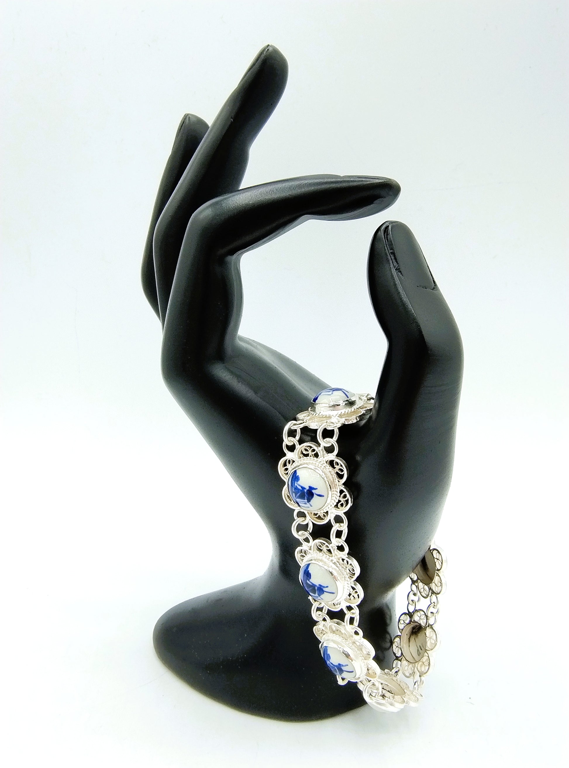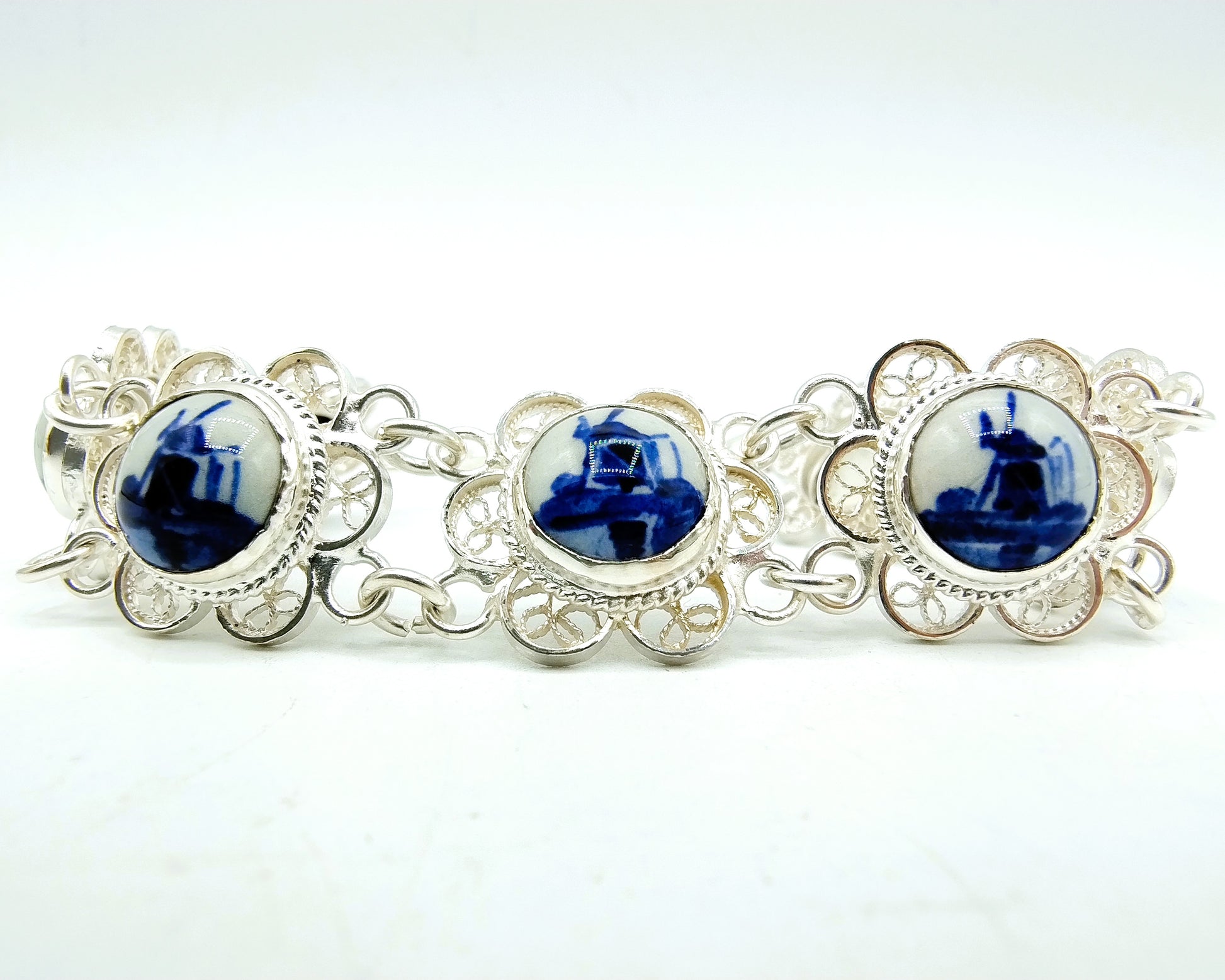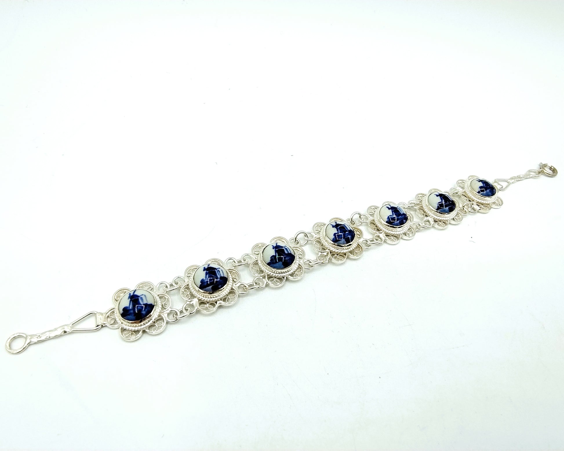 Zilveren armband met 7 Delfts blauwe keramieken afbeeldingen van een molen. Deze afbeeldingen zijn gezet in een gladde kast en voorzien van filigrain zilversmeedwerk.