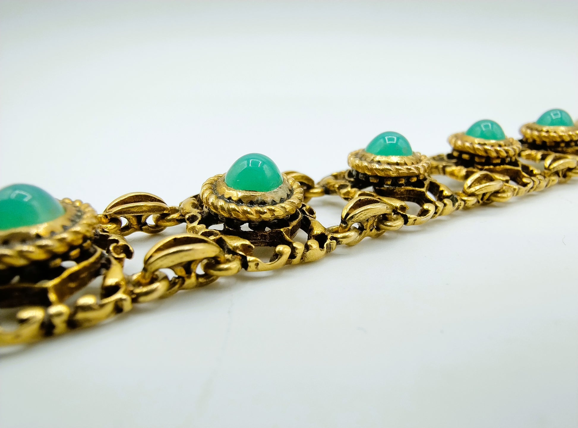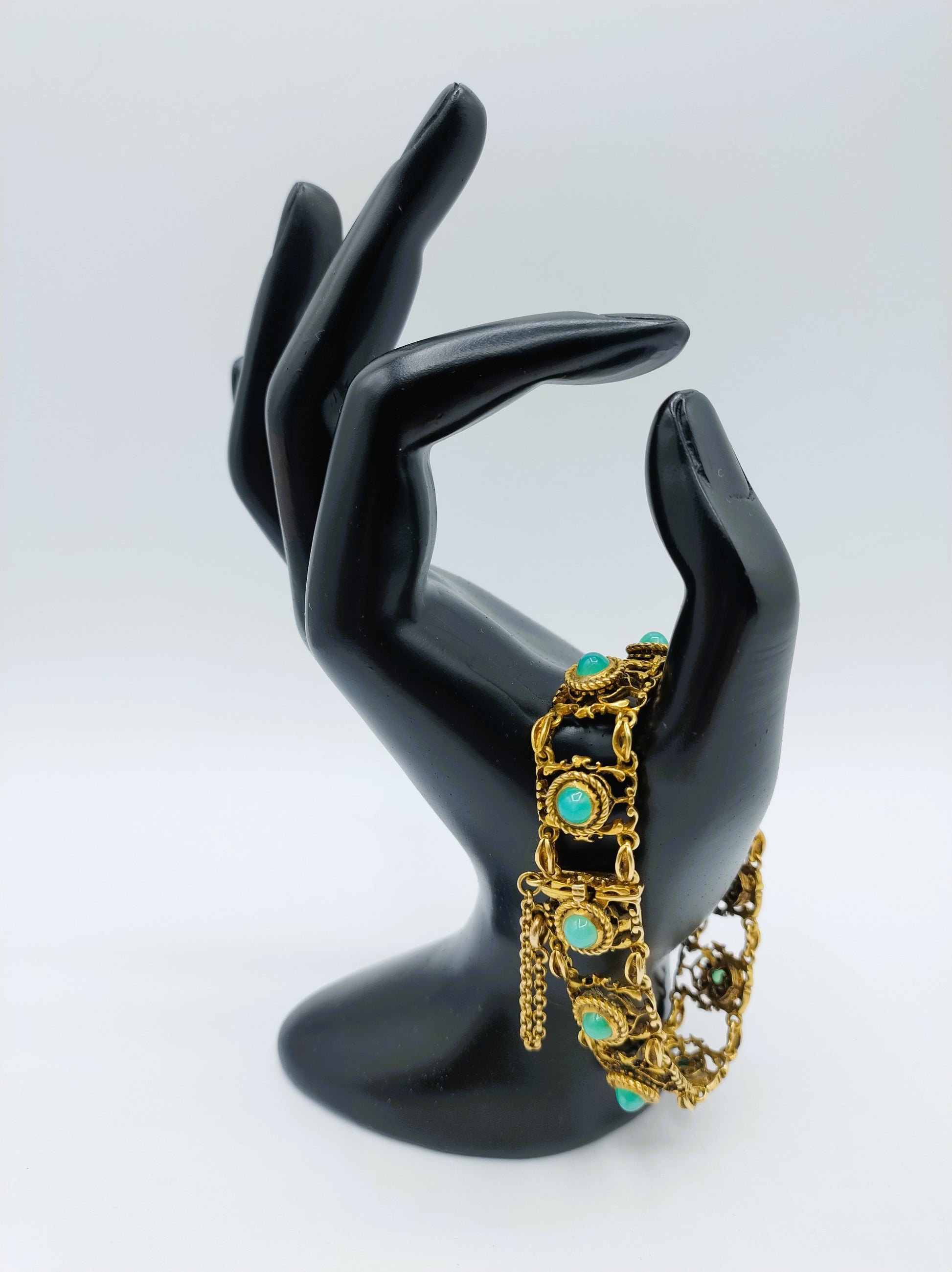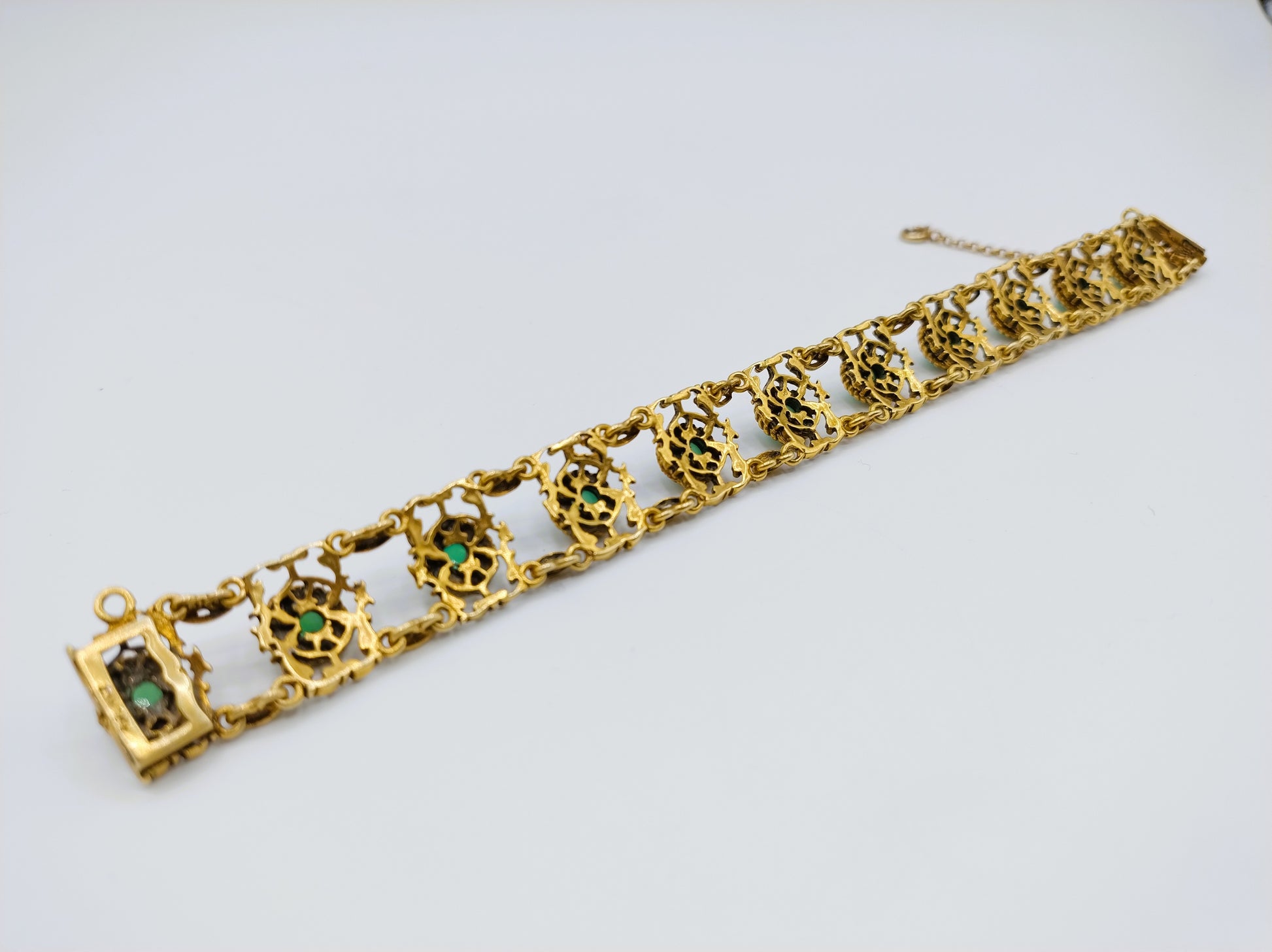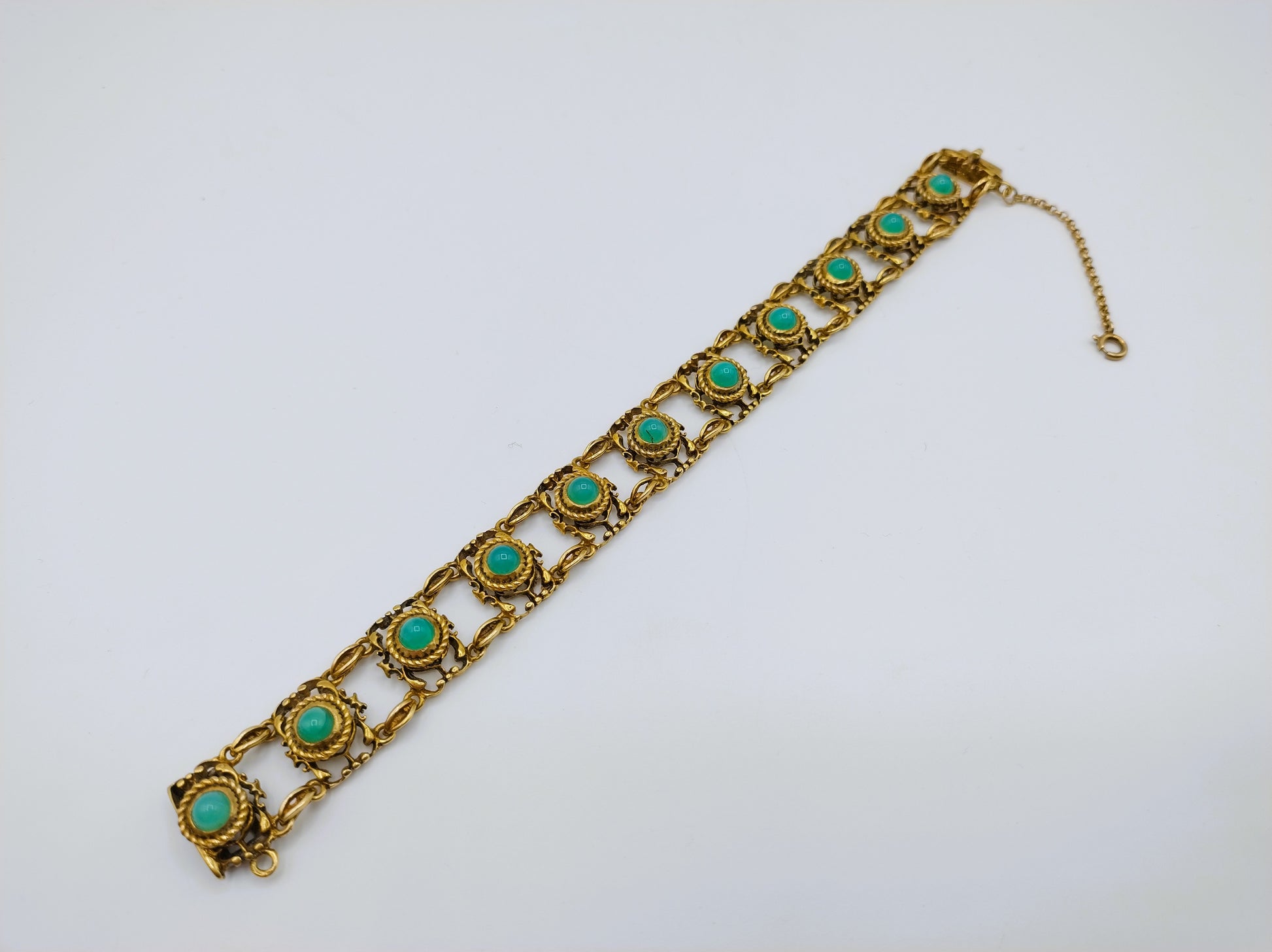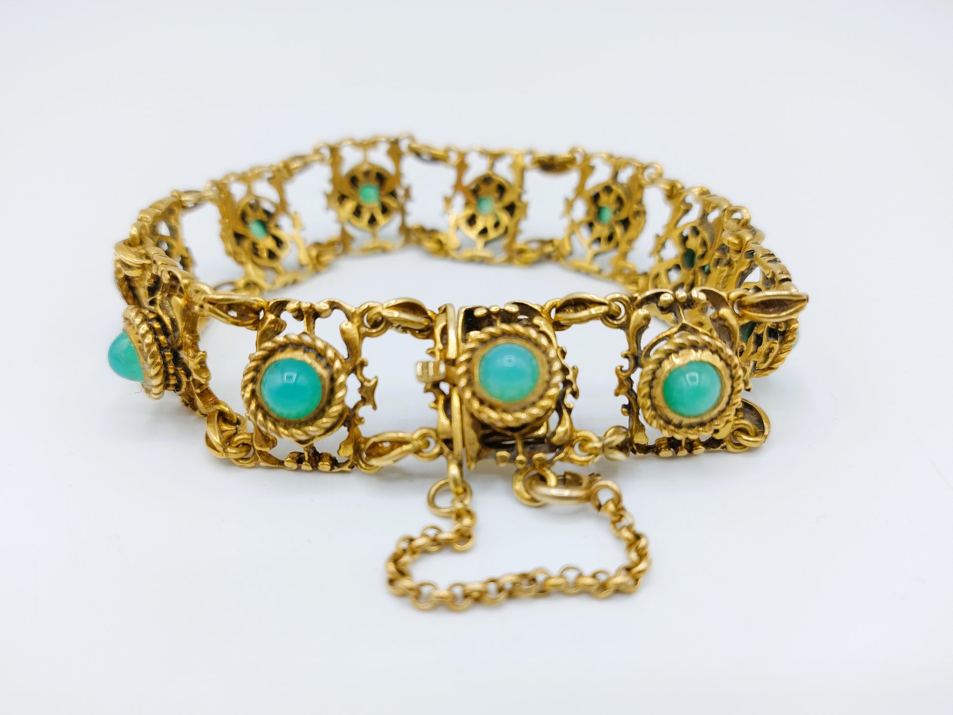 De solide en zware goudvergulde armband is voorzien van 11 schakels met daarop een blauw/ groene steen.