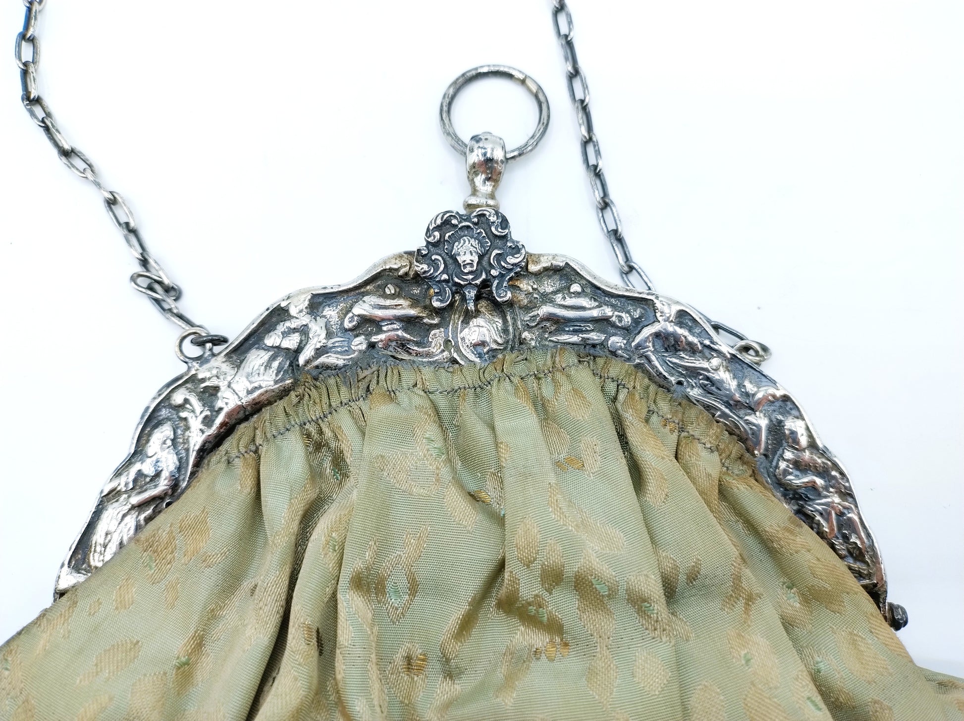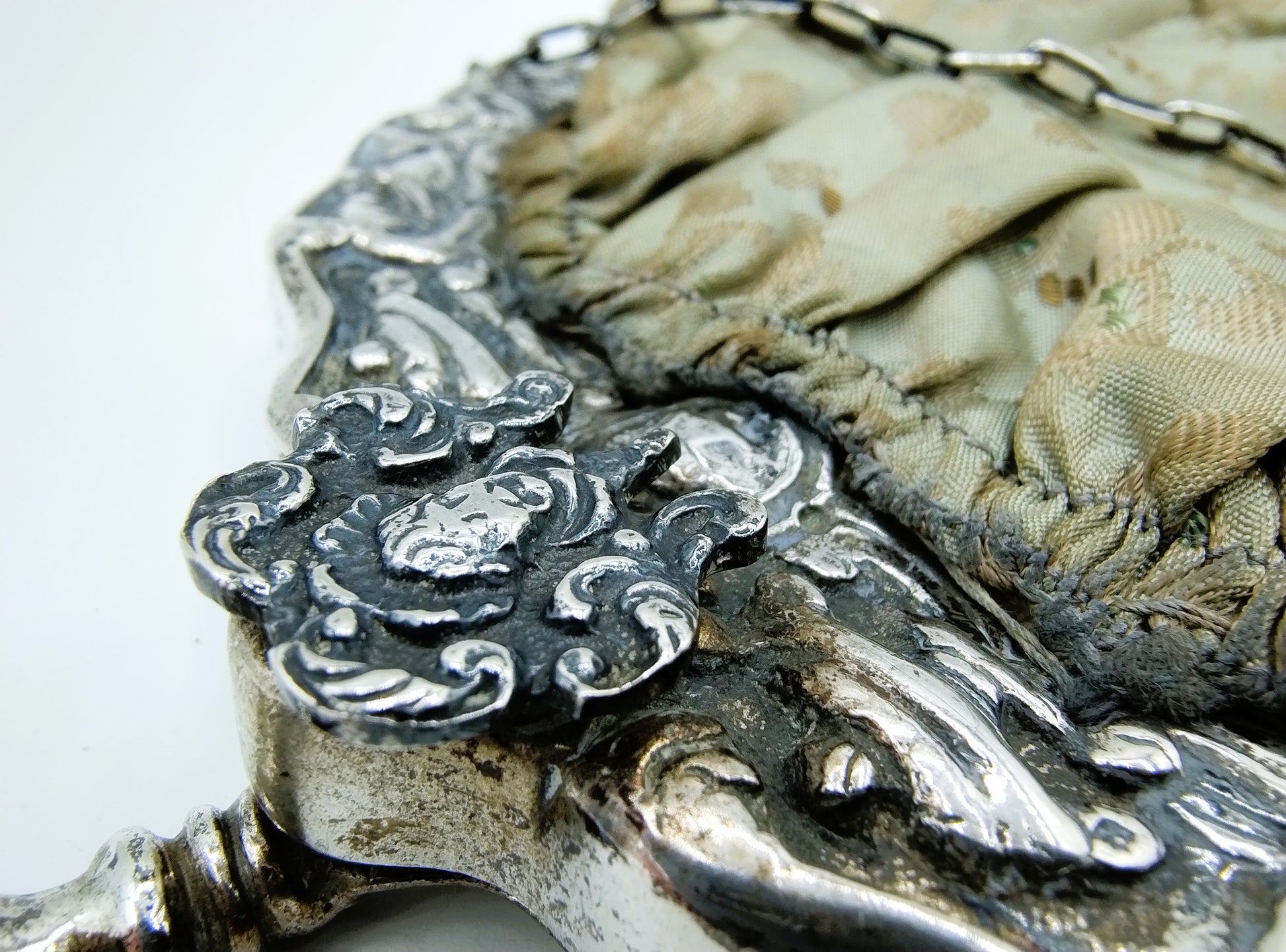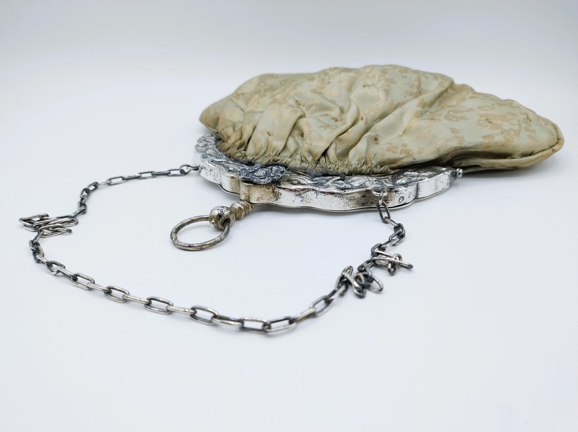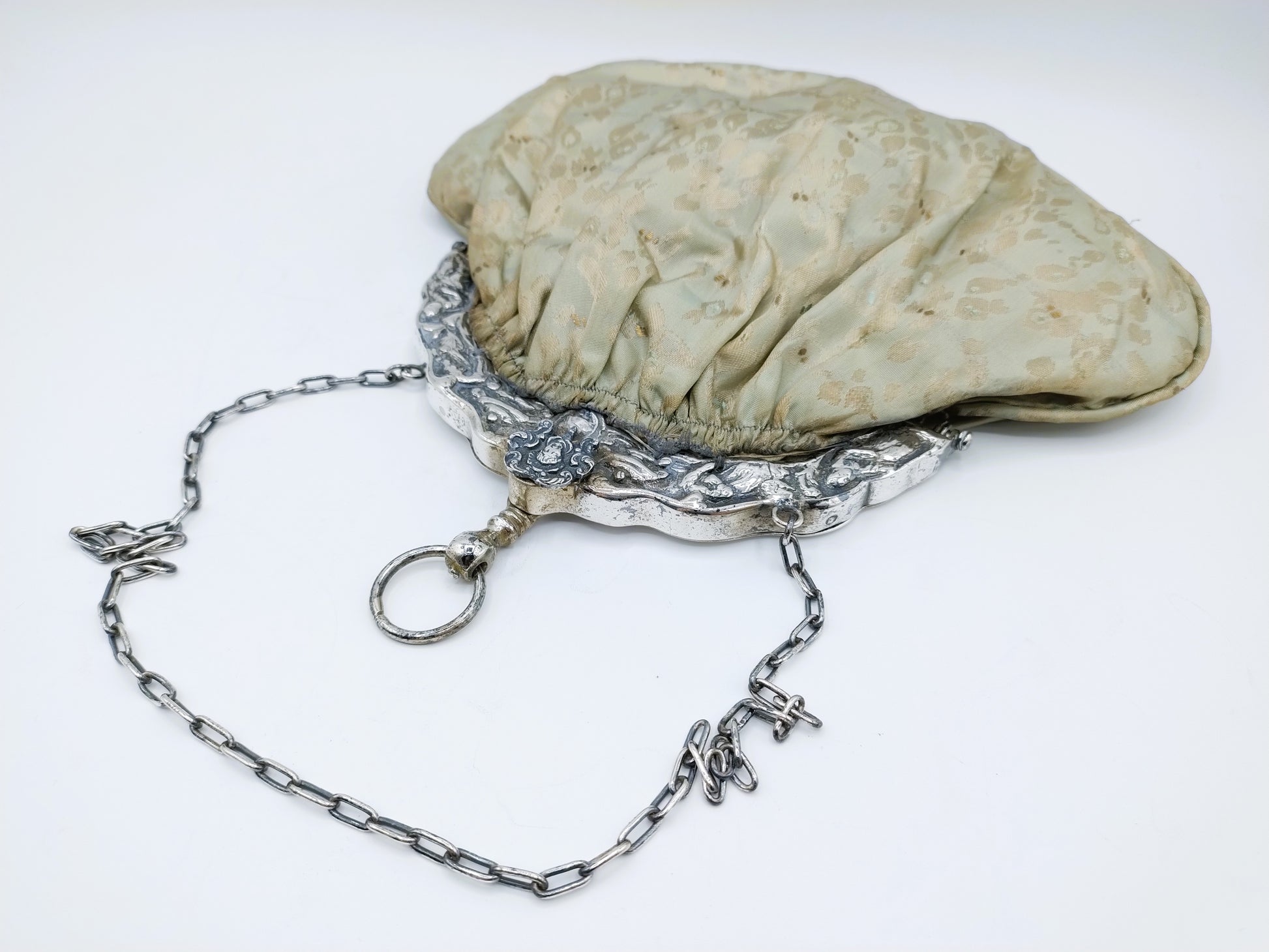 De zilveren beugel is gegoten en daarmee zwaar en solide. Aan de beugel is een jasseronketting bevestigd. Ook de satijnen tas is nog in goed staat.