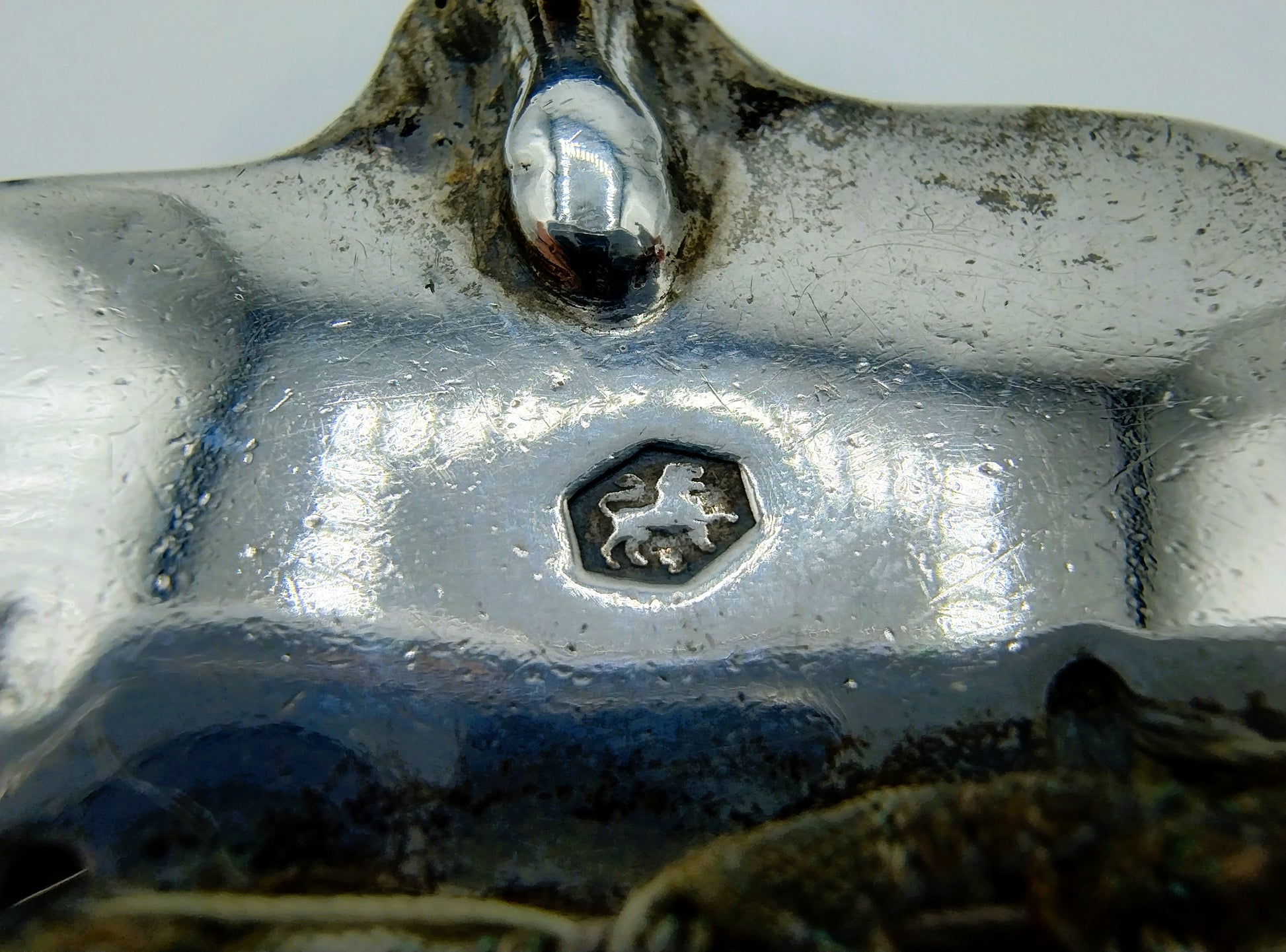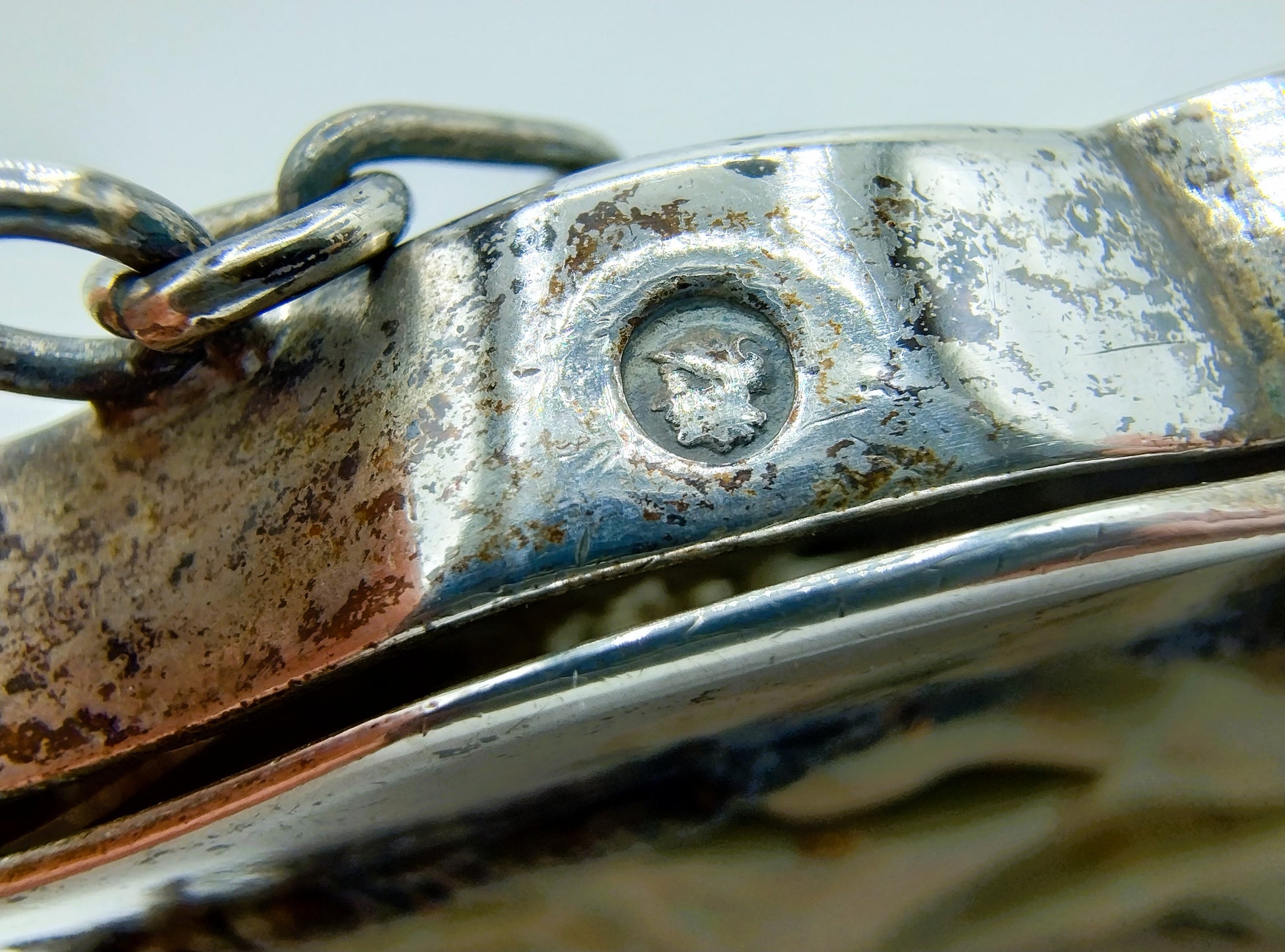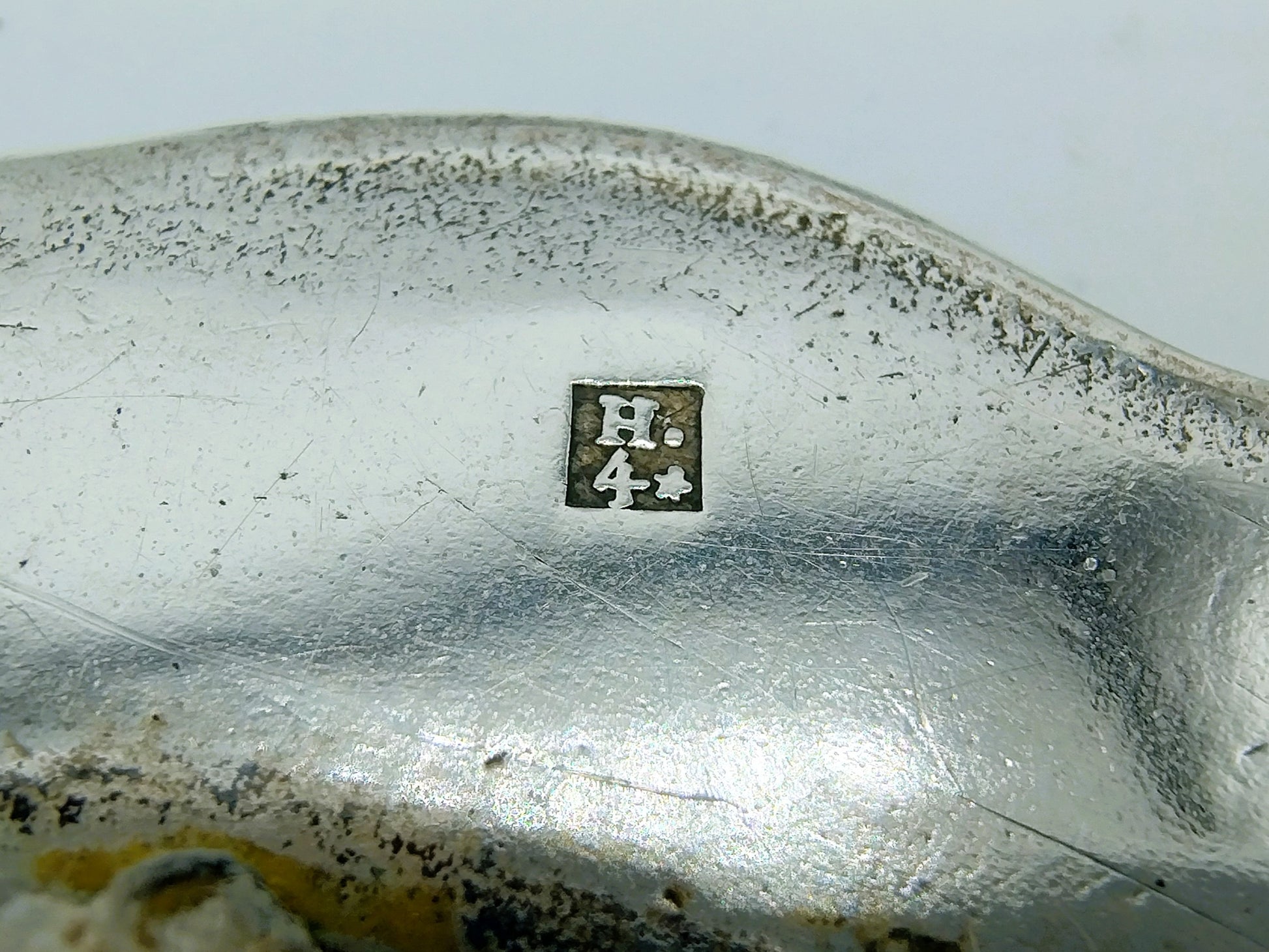 De tasbeugel is gekeurd met meesterkeur H.4*, tweede gehaltekeur, minervakopje en jaarletter E voor 1814.