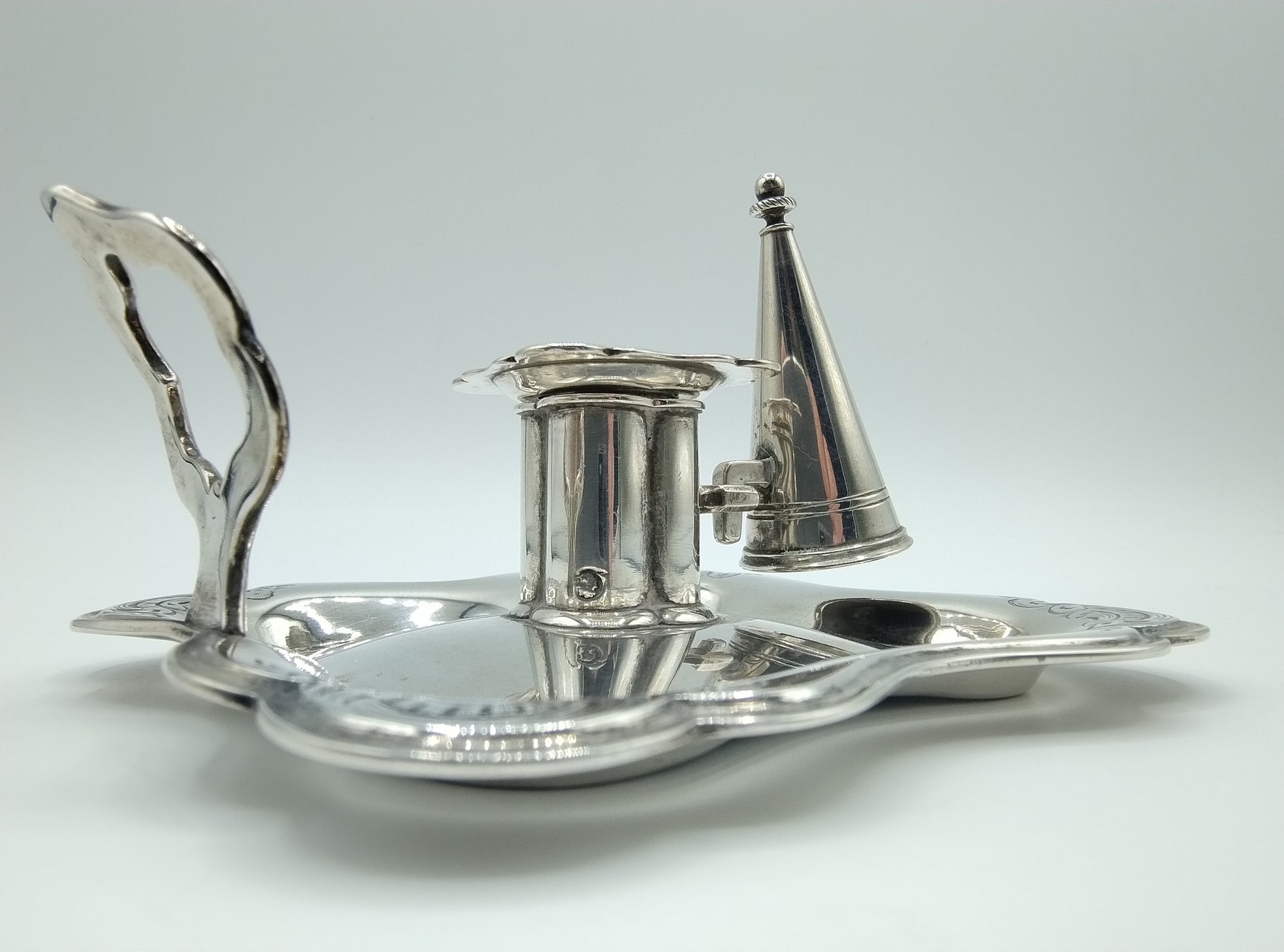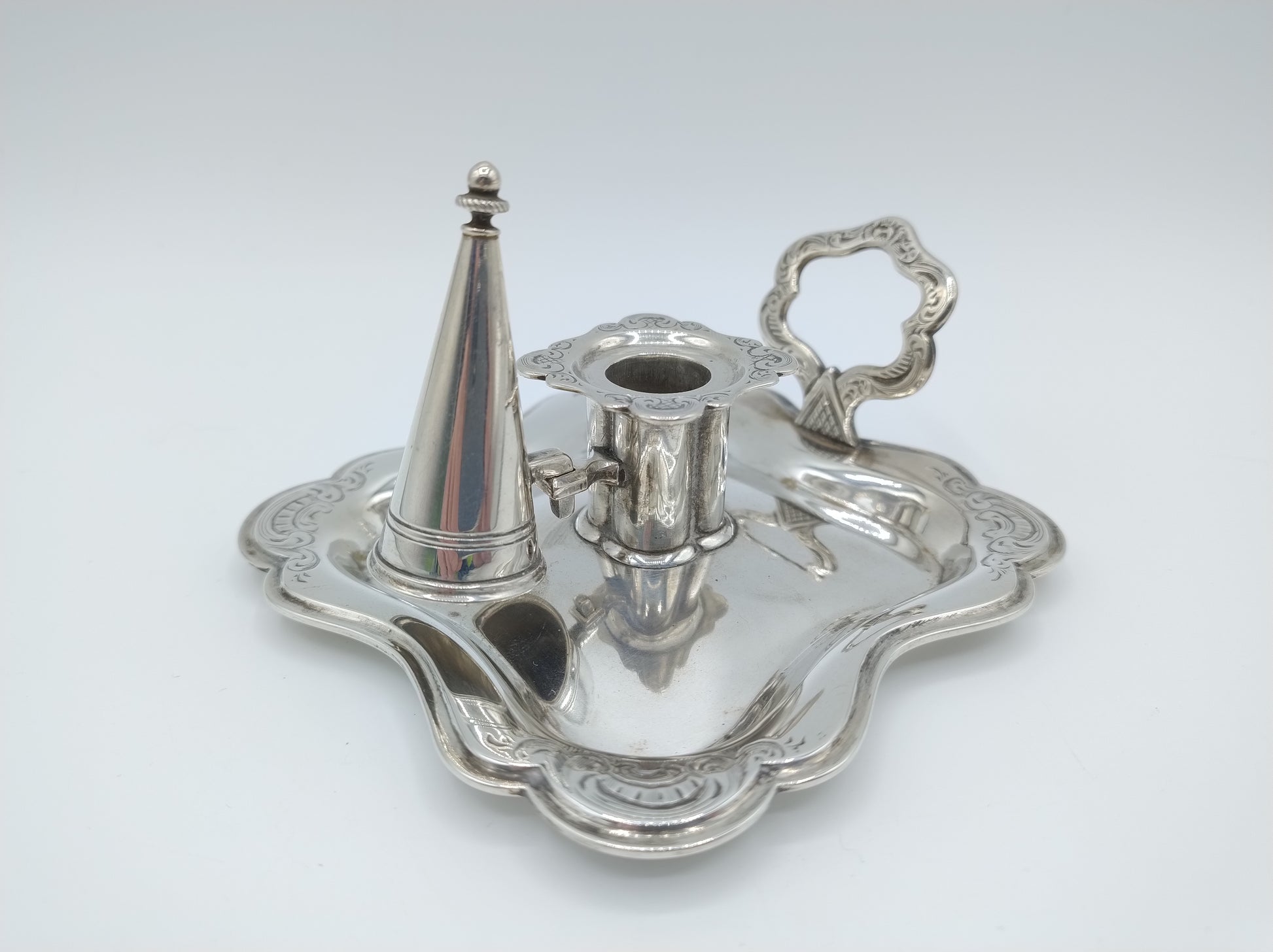 De blaker heeft een gecontourneerde rand en is gegraveerd in de Biedermeier stijl.