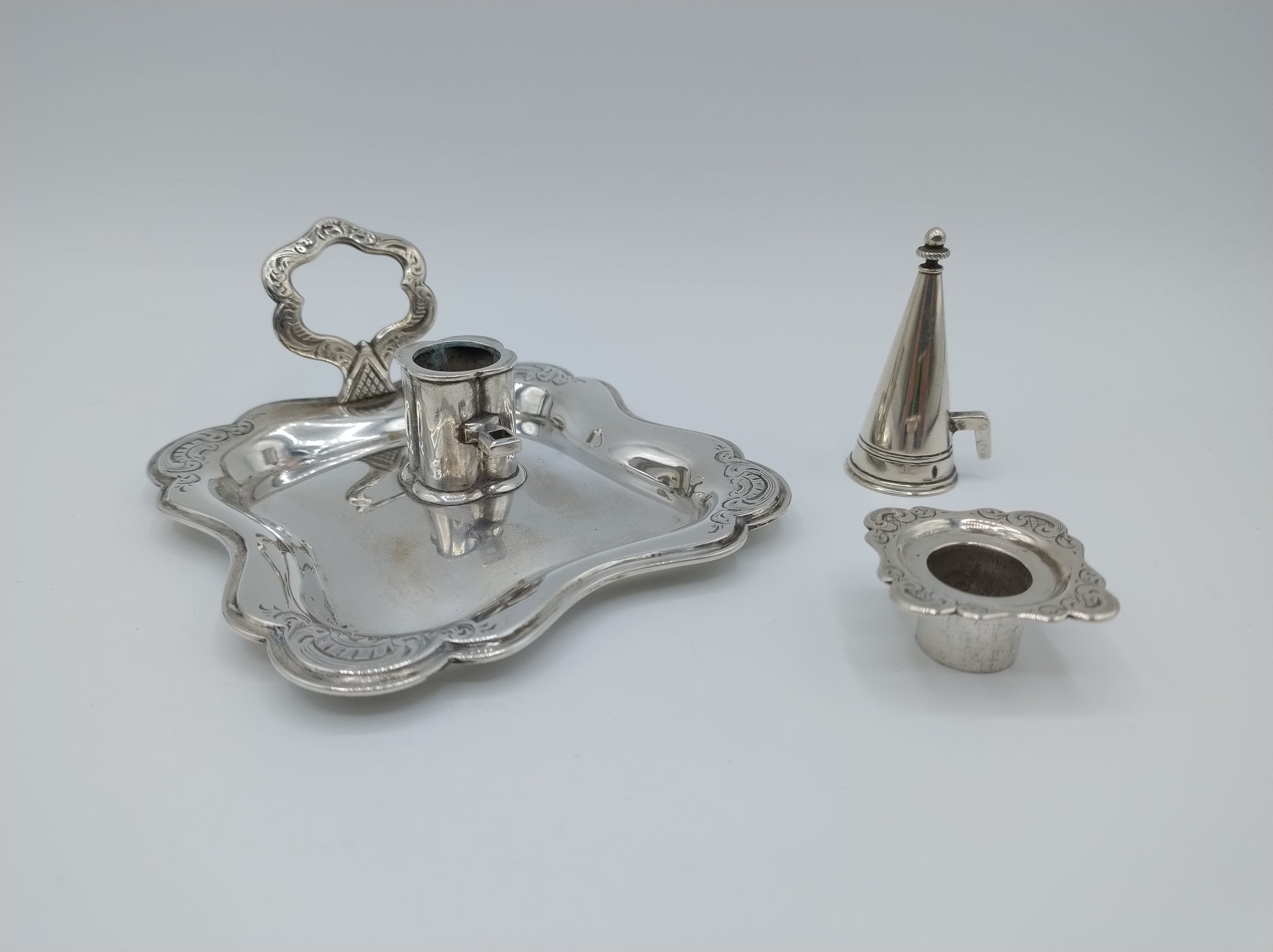 Ook de afneembare vetvanger is fraai gegraveerd met krulmotieven. De set is compleet met een gladde afneembare dover.