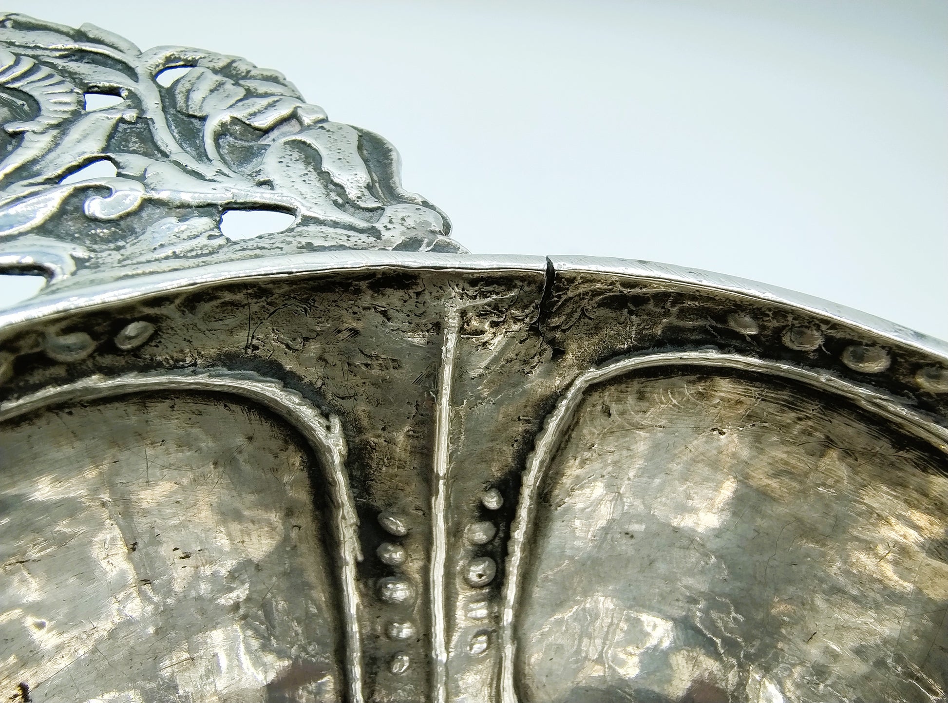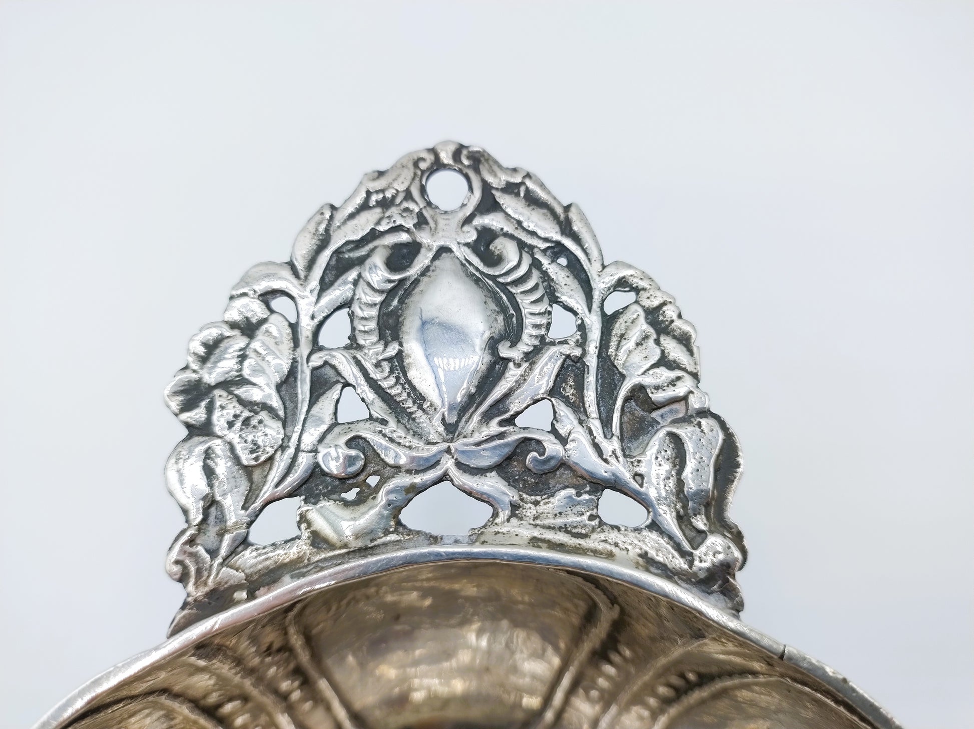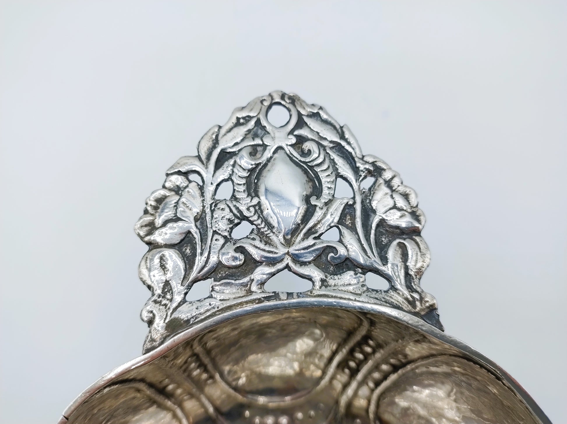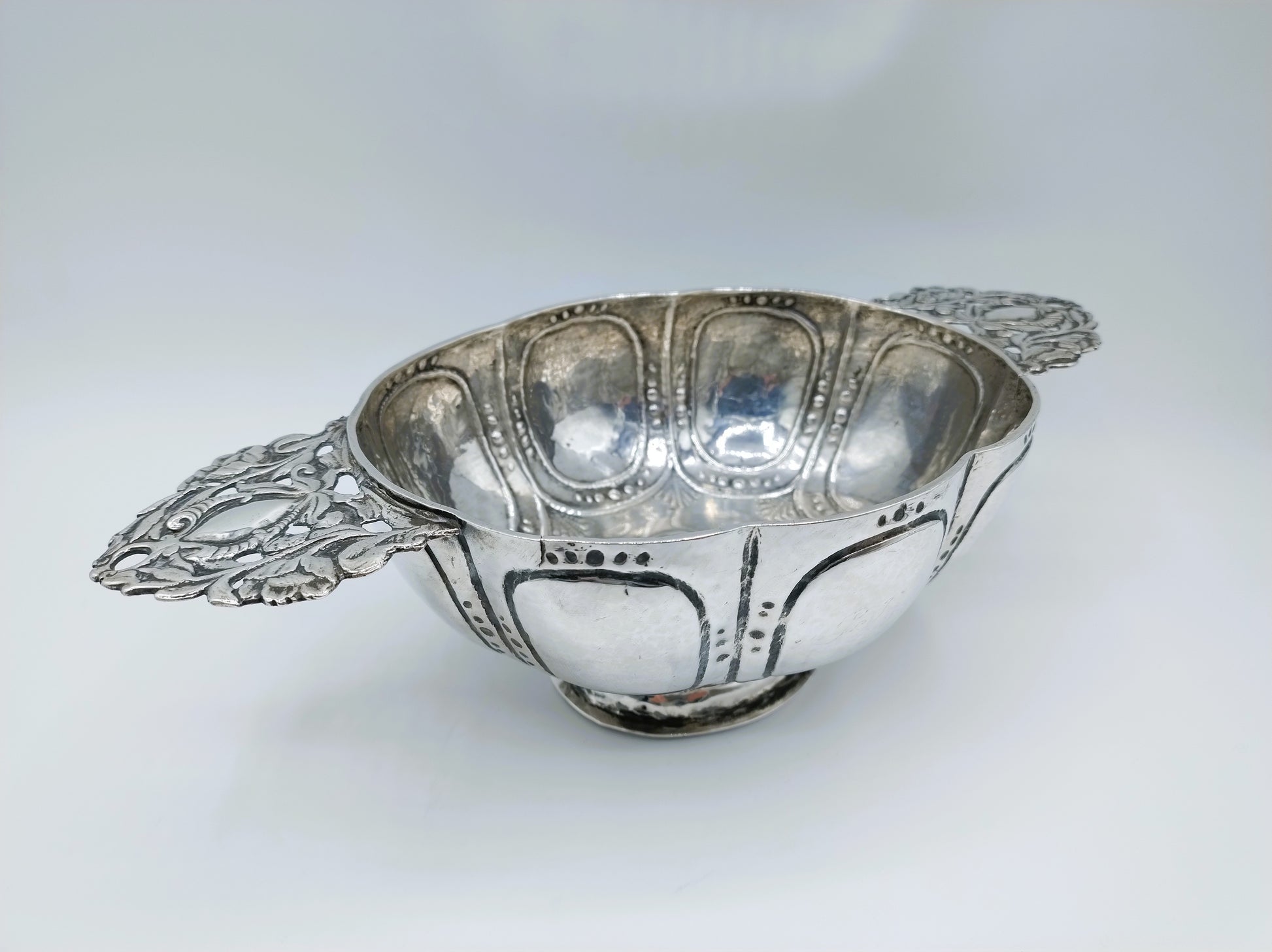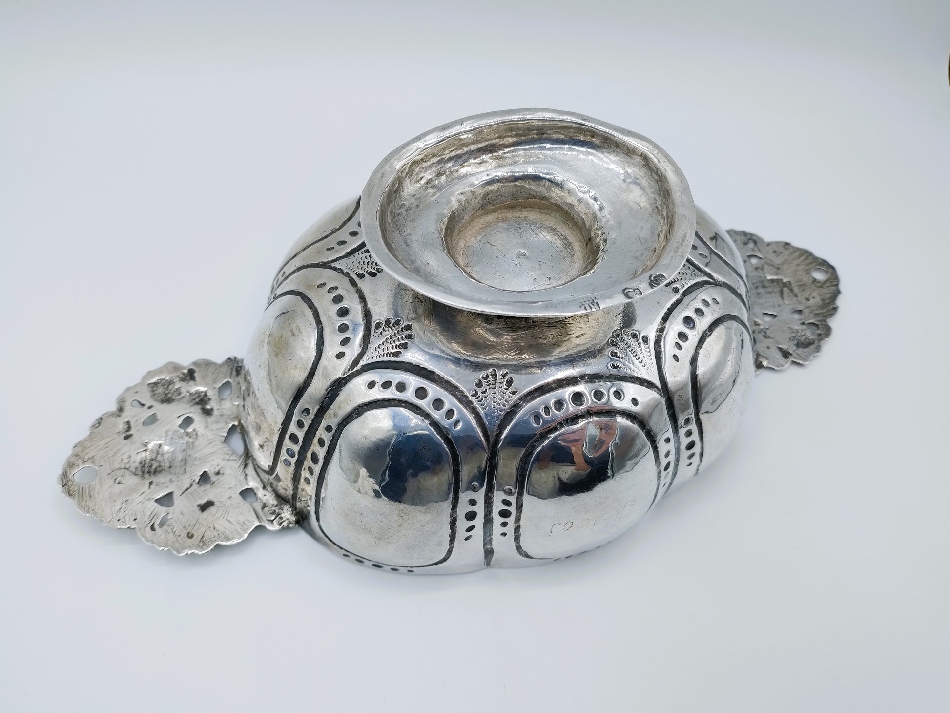 Zilveren 8-lobbige brandewijnkom met versierde handvaten, gemaakt door de zilversmid Gerrit Jan Schuurman uit Zwolle. Hij was werkzaam van 1787 tot 1811.