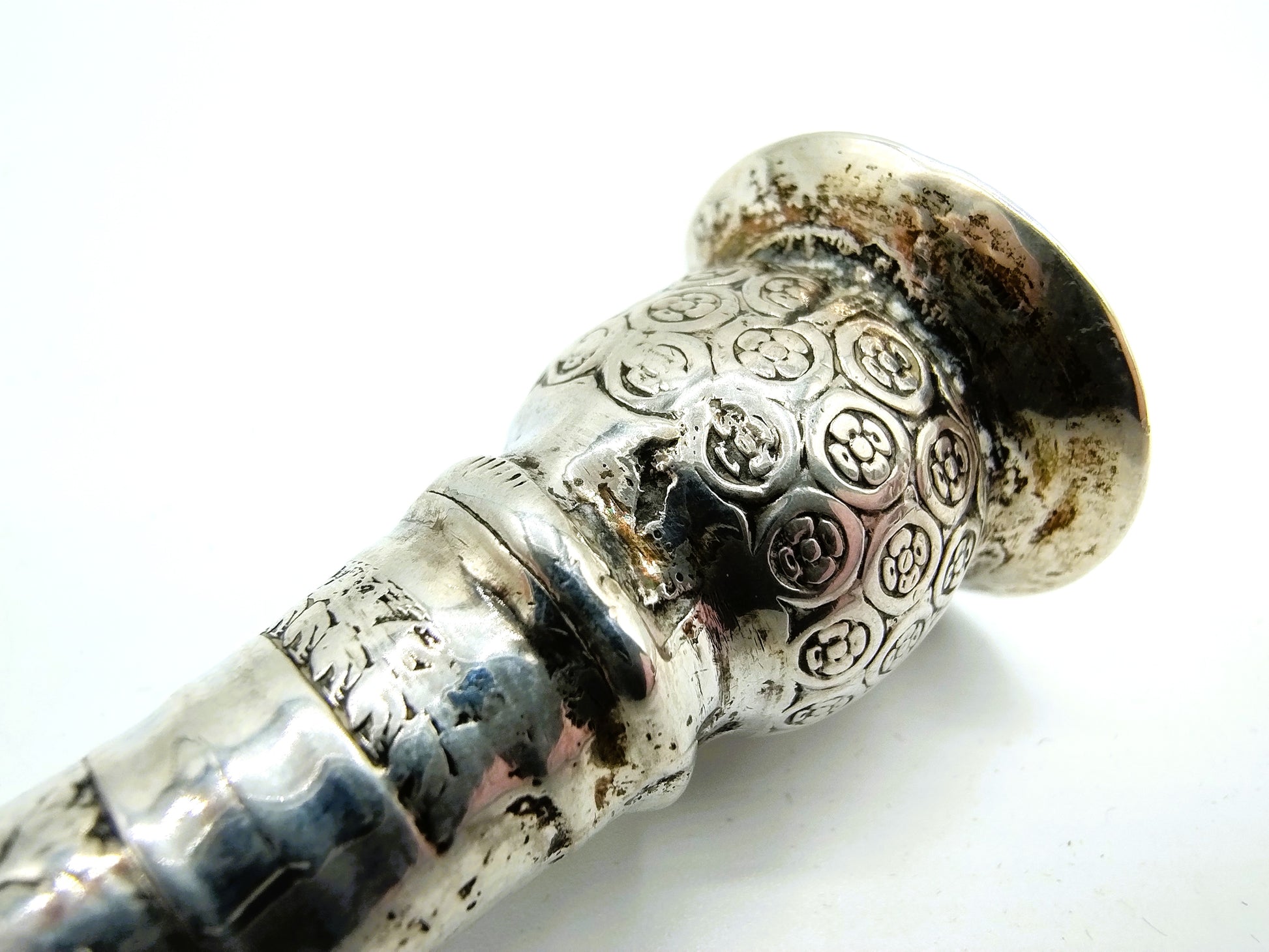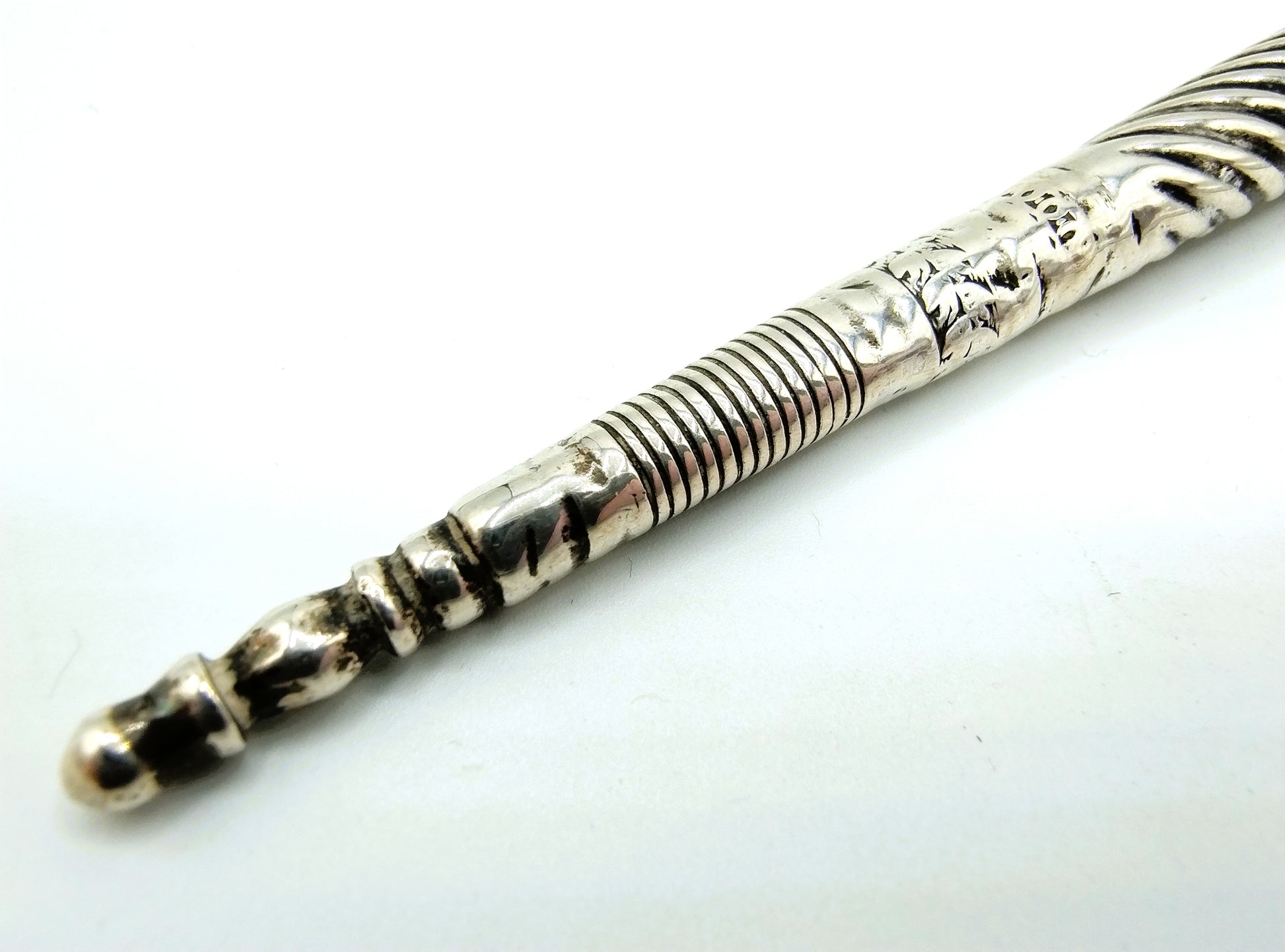 19e Eeuwse zilveren breipenhouder of breischede. Deze is voorzien van onduidelijke keuren.