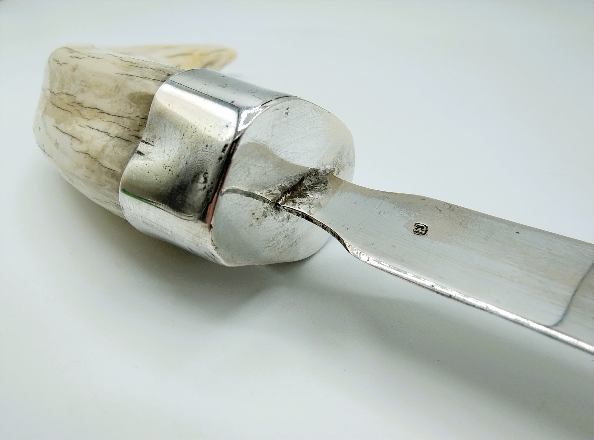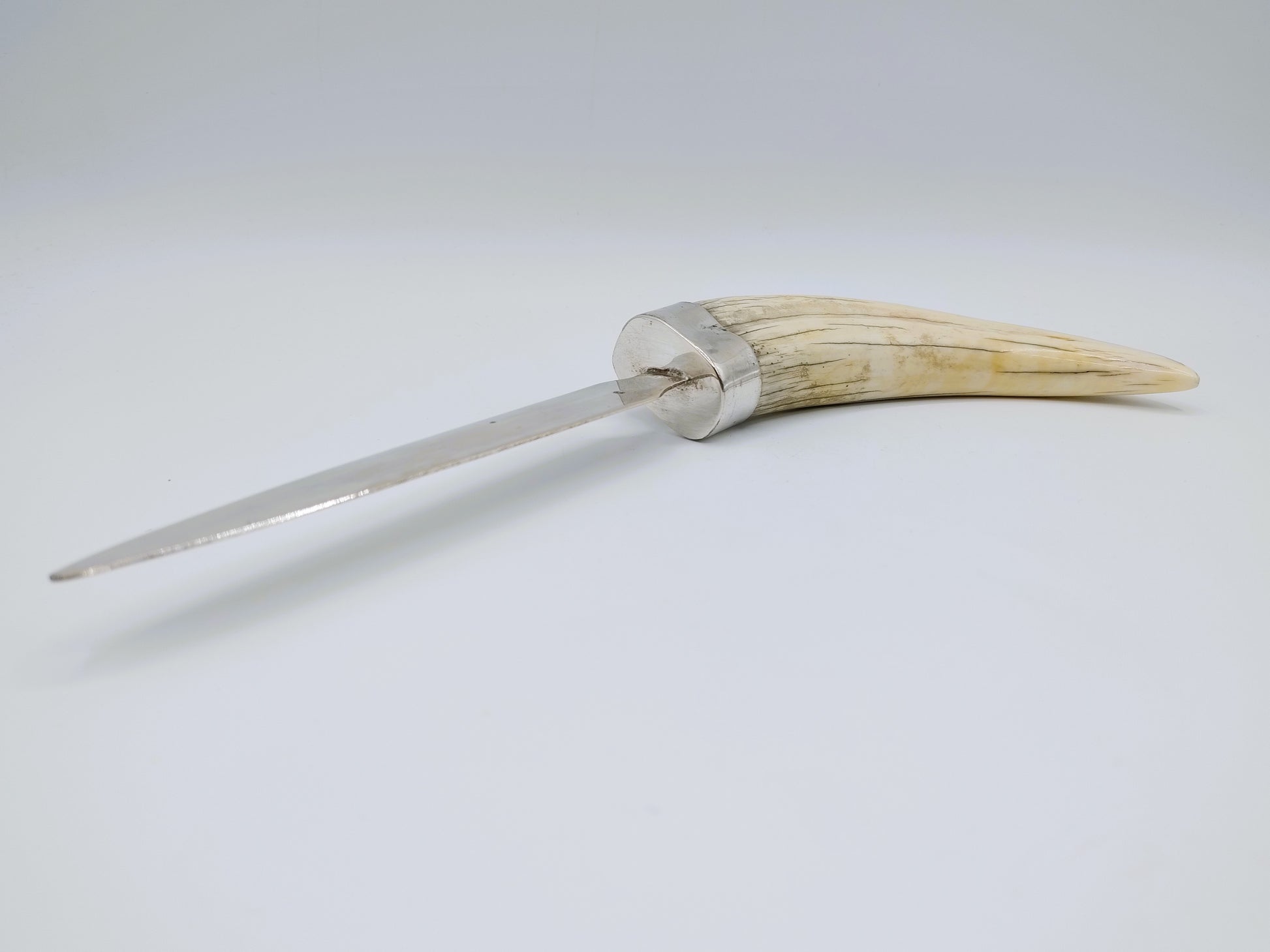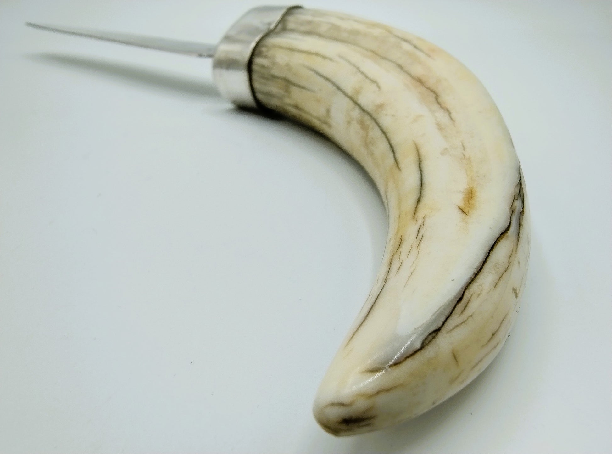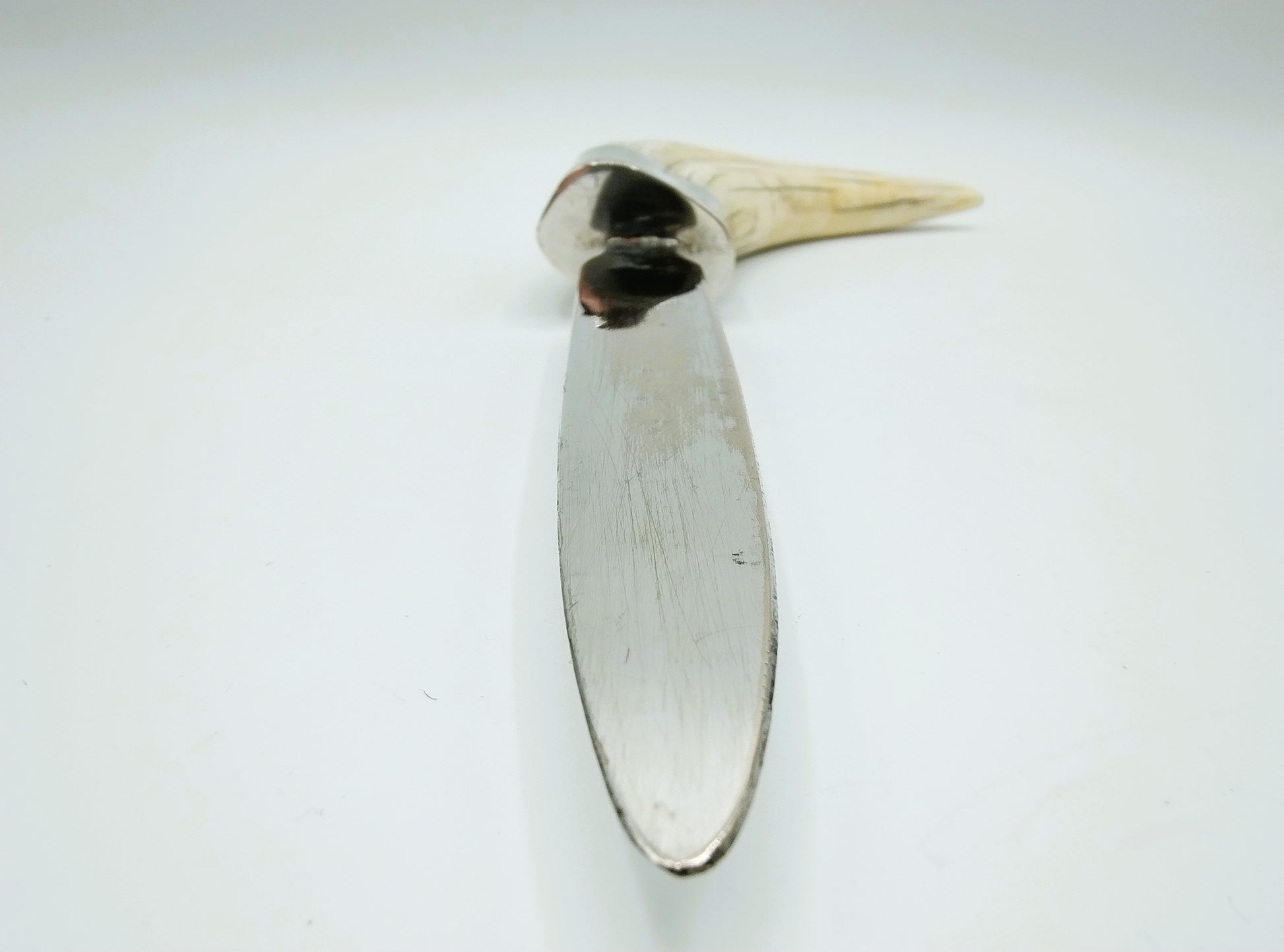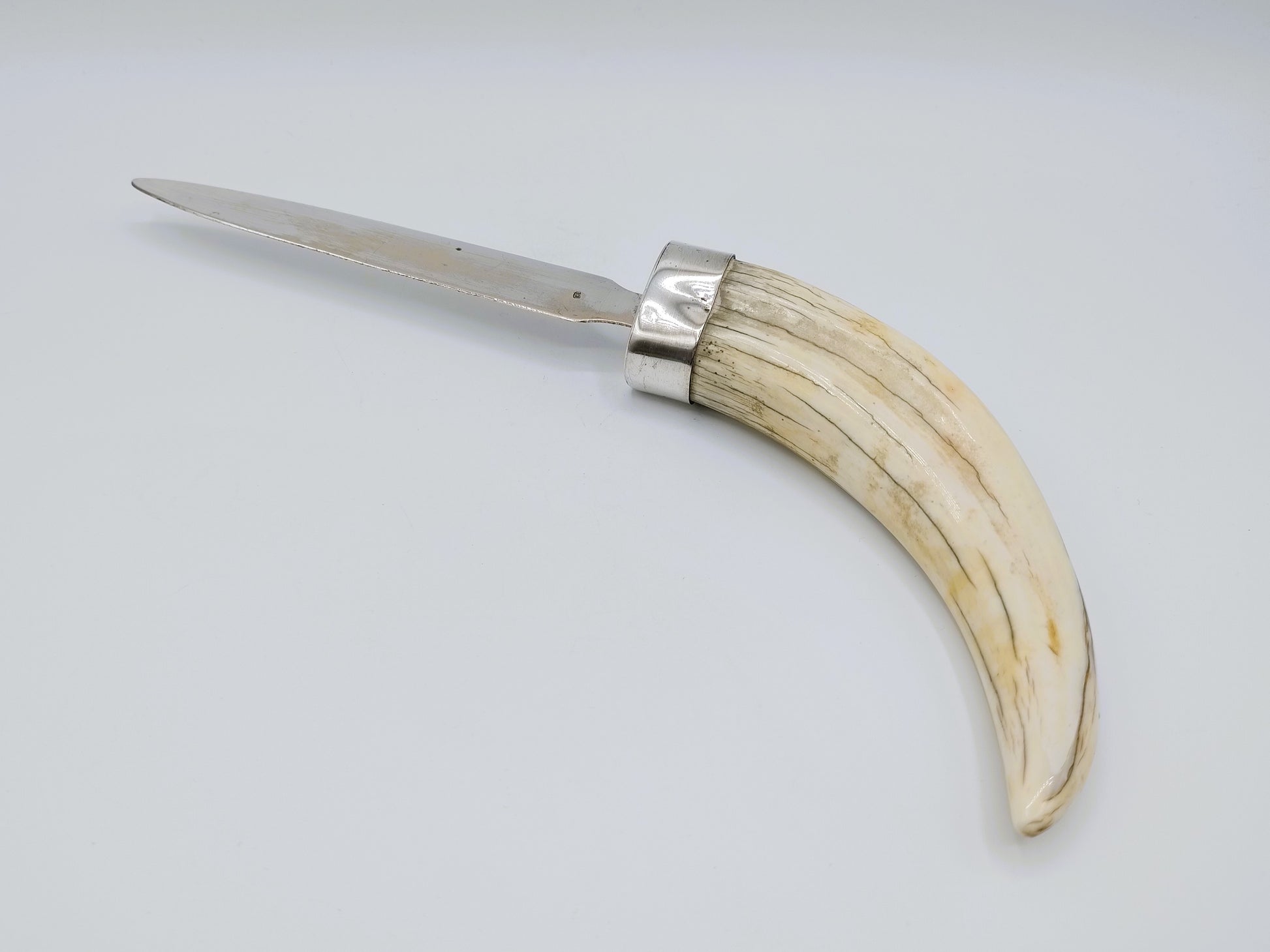 Zilveren brievenopener met als heft een slagtand van een wrattenzwijn.