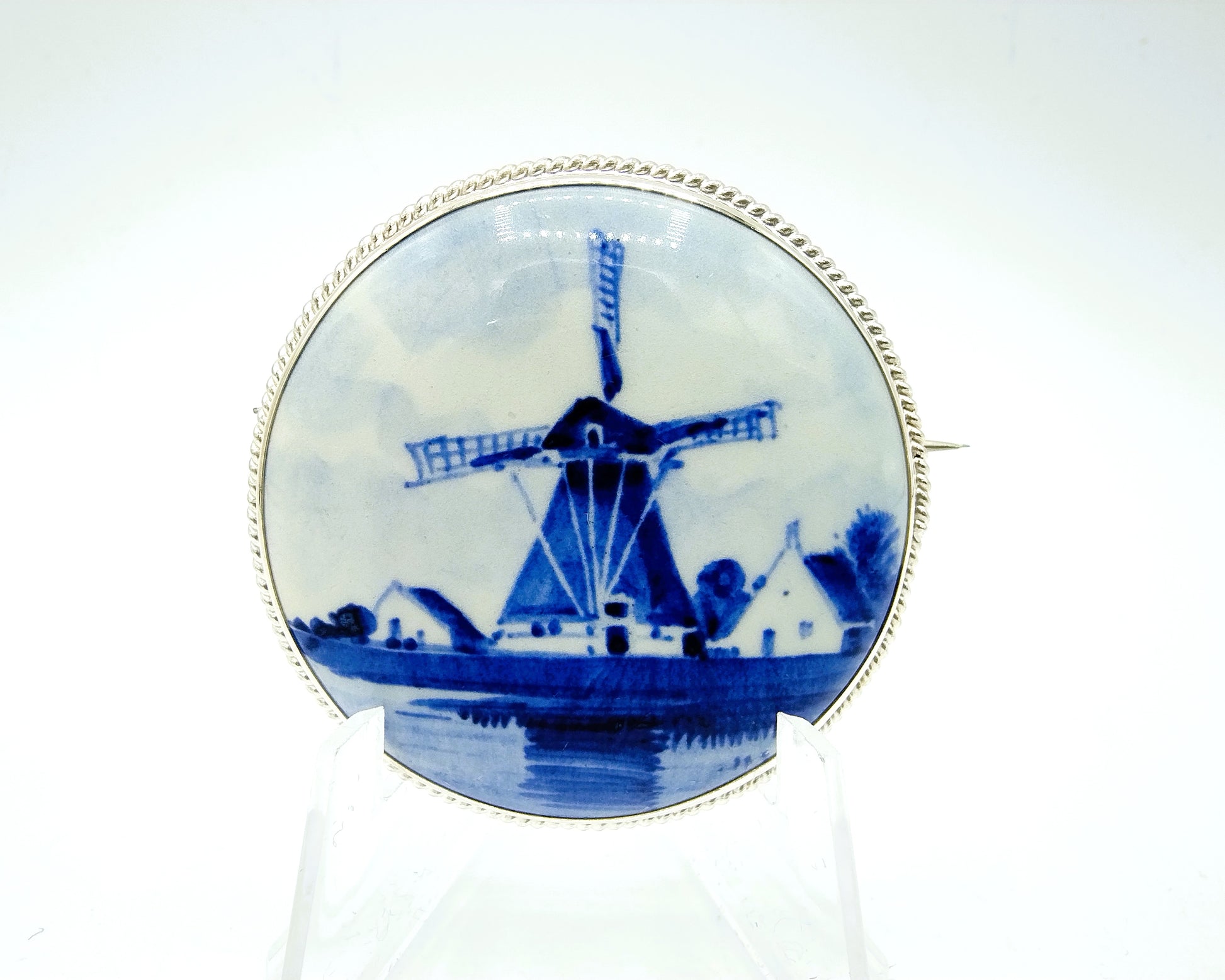 Zilveren broche met Delfts blauwe keramieken afbeelding van een molen. Deze afbeelding is gezet in een gladde kast.
