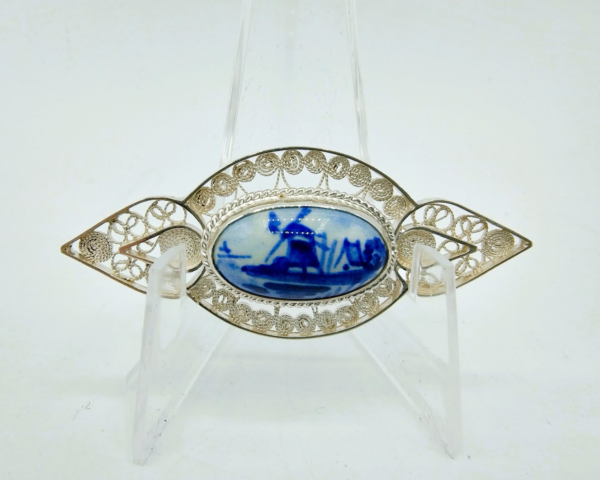 Zilveren broche met Delfts blauwe keramieken afbeelding van een molen. Deze afbeelding is gezet in een gladde kast.