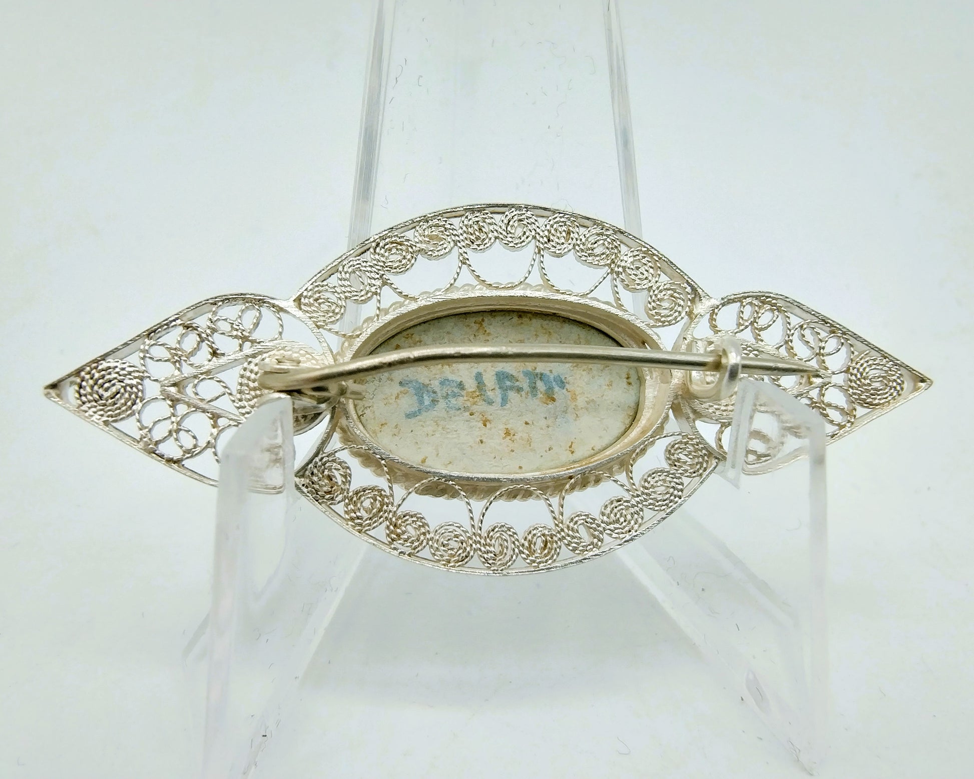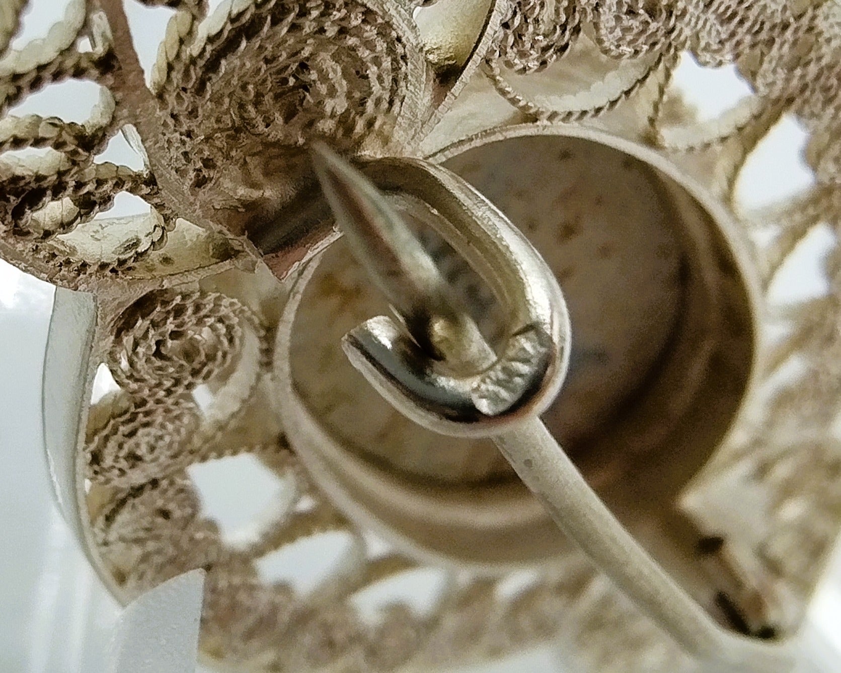 De broche is voorzien van filigrain zilversmeedwerk.